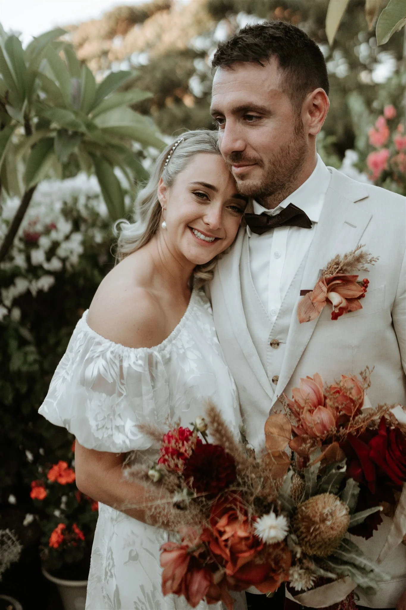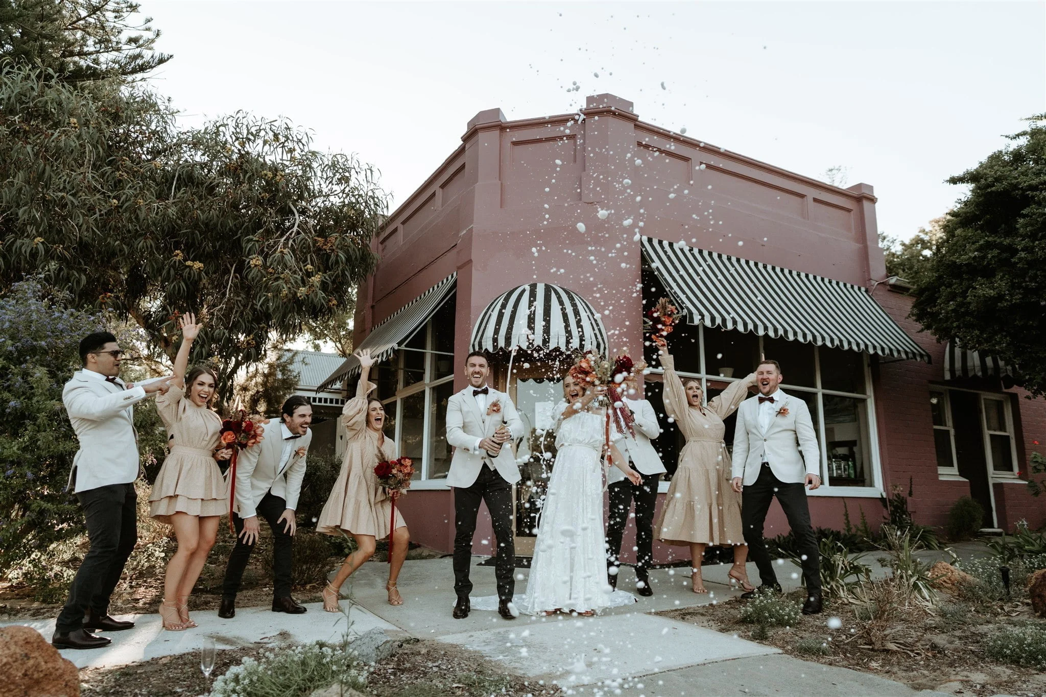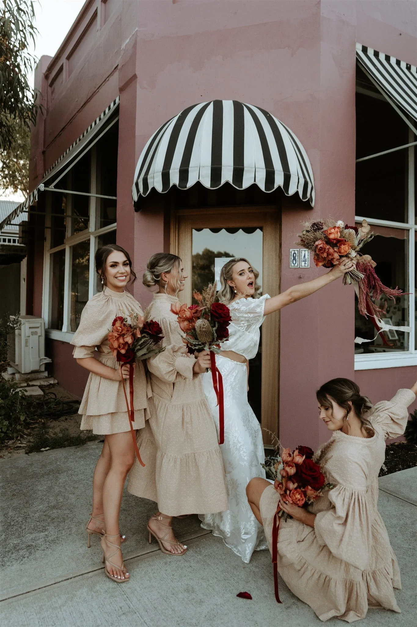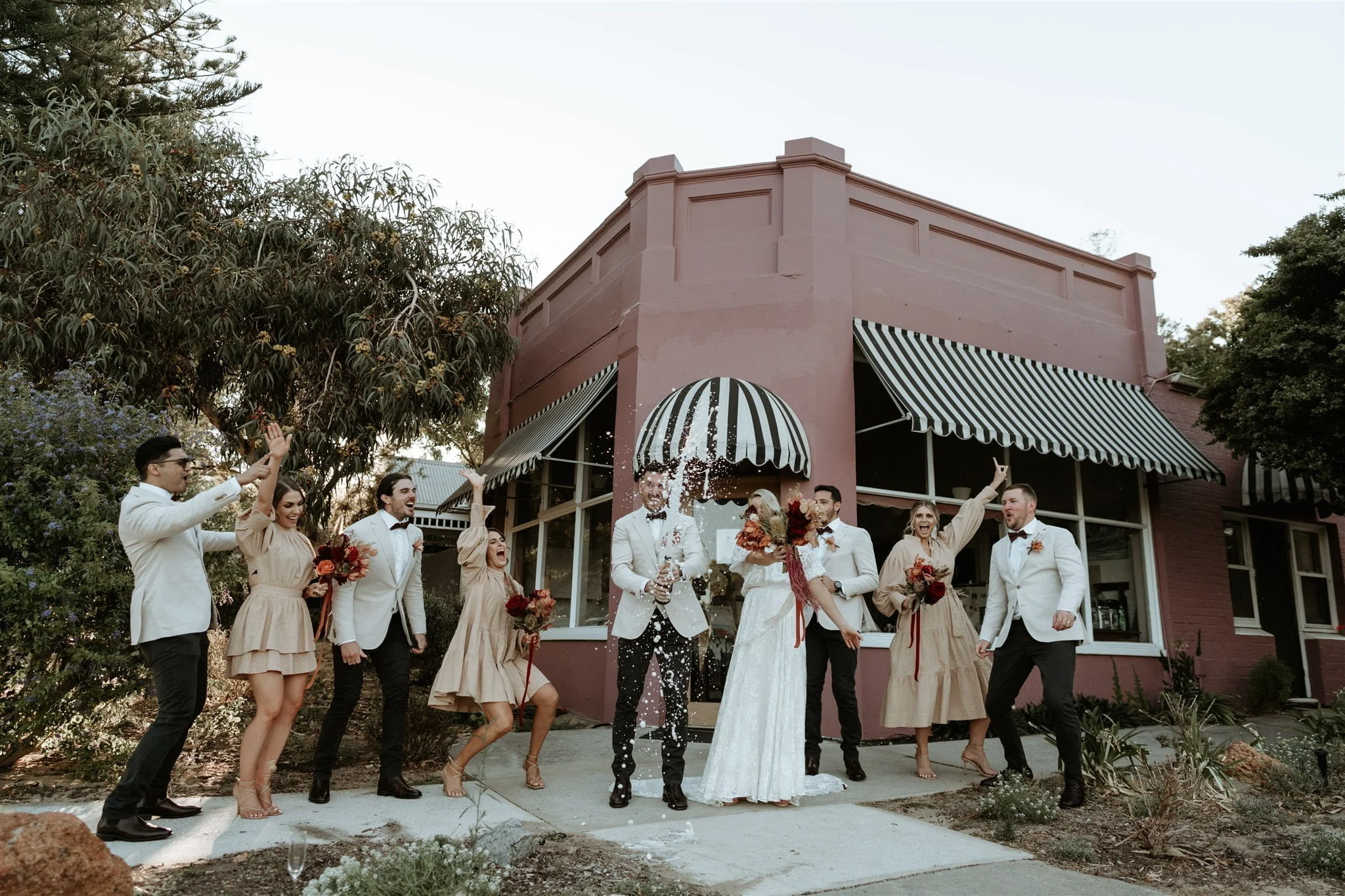 CONTRIBUTING VENDORS Photographer & Cinematographer Ring and Veil Event Planner & Stylist Alice Heydon Florist Rose & Bud Stationery Rachel Capuano Creative via Etsy Signage Andrew Boddy Design Printer Daniel’s Printing Craftsmen Ceremony & Reception Guildhall Event Space Catering Propeller Grazing Table Come Graze Southwest Food Trucks Peace Pizza Dessert Krispy Creme Hire Items Hire in Style Bar Staff Margaret River Party Hire Lights Festoon Perth Neon Black Label Events Entertainment DJ Mandy B Celebrant Tina Fiorda Rings Jackson and Tait Champagne Tower Euphoric Hire THE BRIDE Bridal Gown Grace Loves Lace Hair Piece Mimco Robes Anthropologie Shoes Loeffler Randall Earrings Dalia designs Hair Styled by Kaila Makeup Brittany Mason Makeup & Jasmine Hair and Makeup Fragrance Byredo Bridesmaid Dresses Shona Joy THE GROOM Suit MJ Bale Bow Tie Otaa Shoes RM Williams