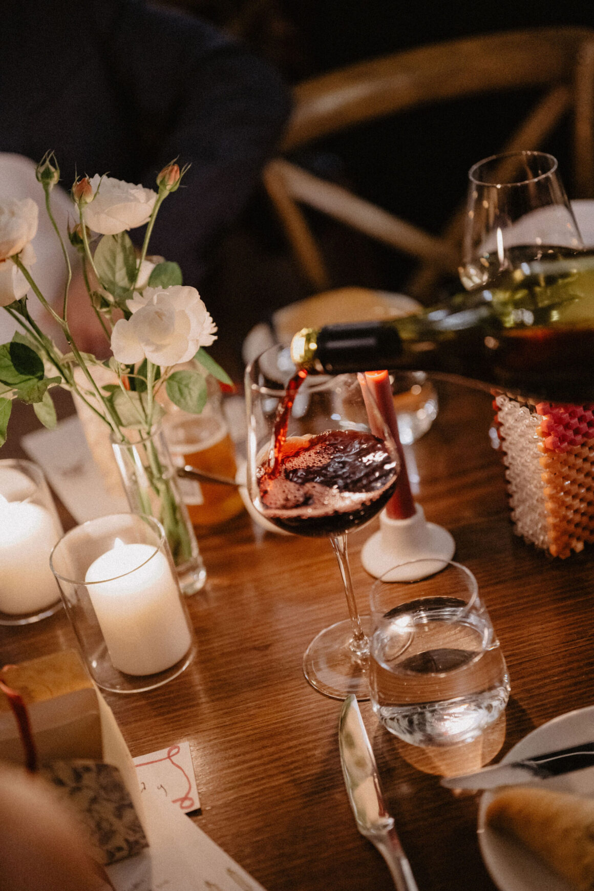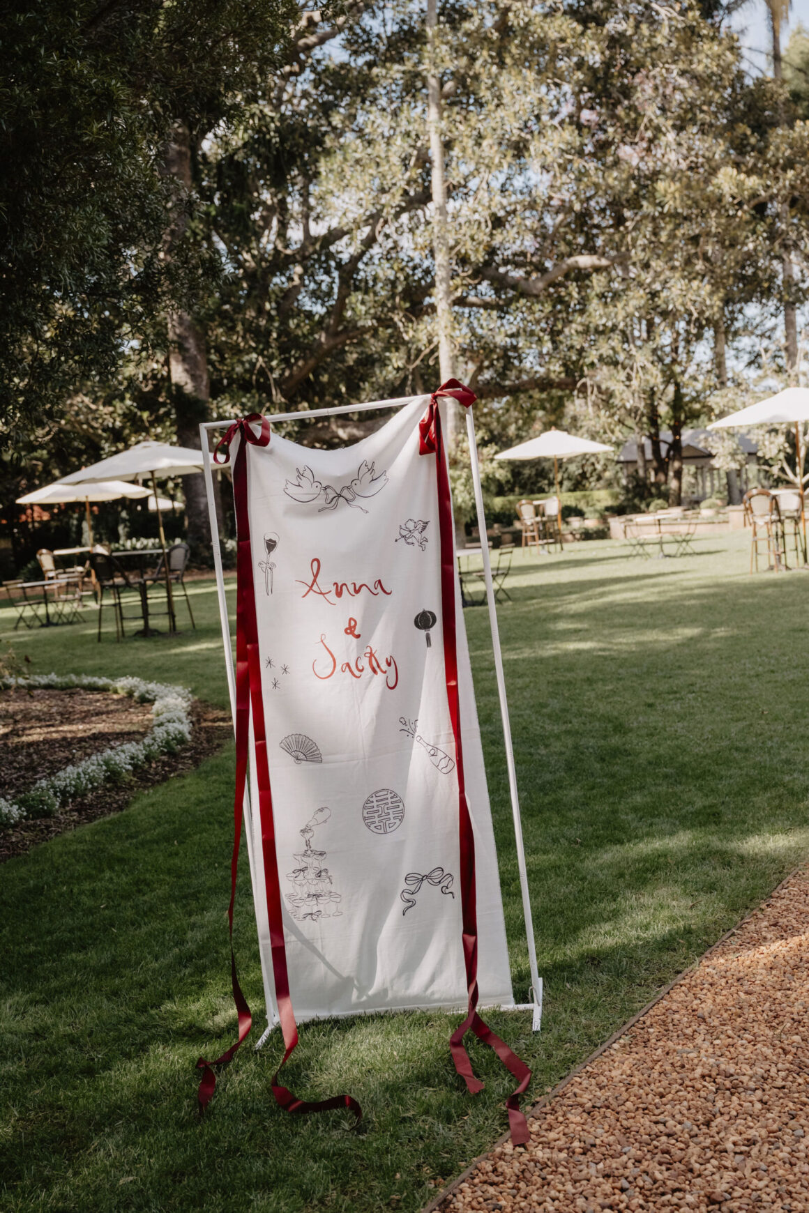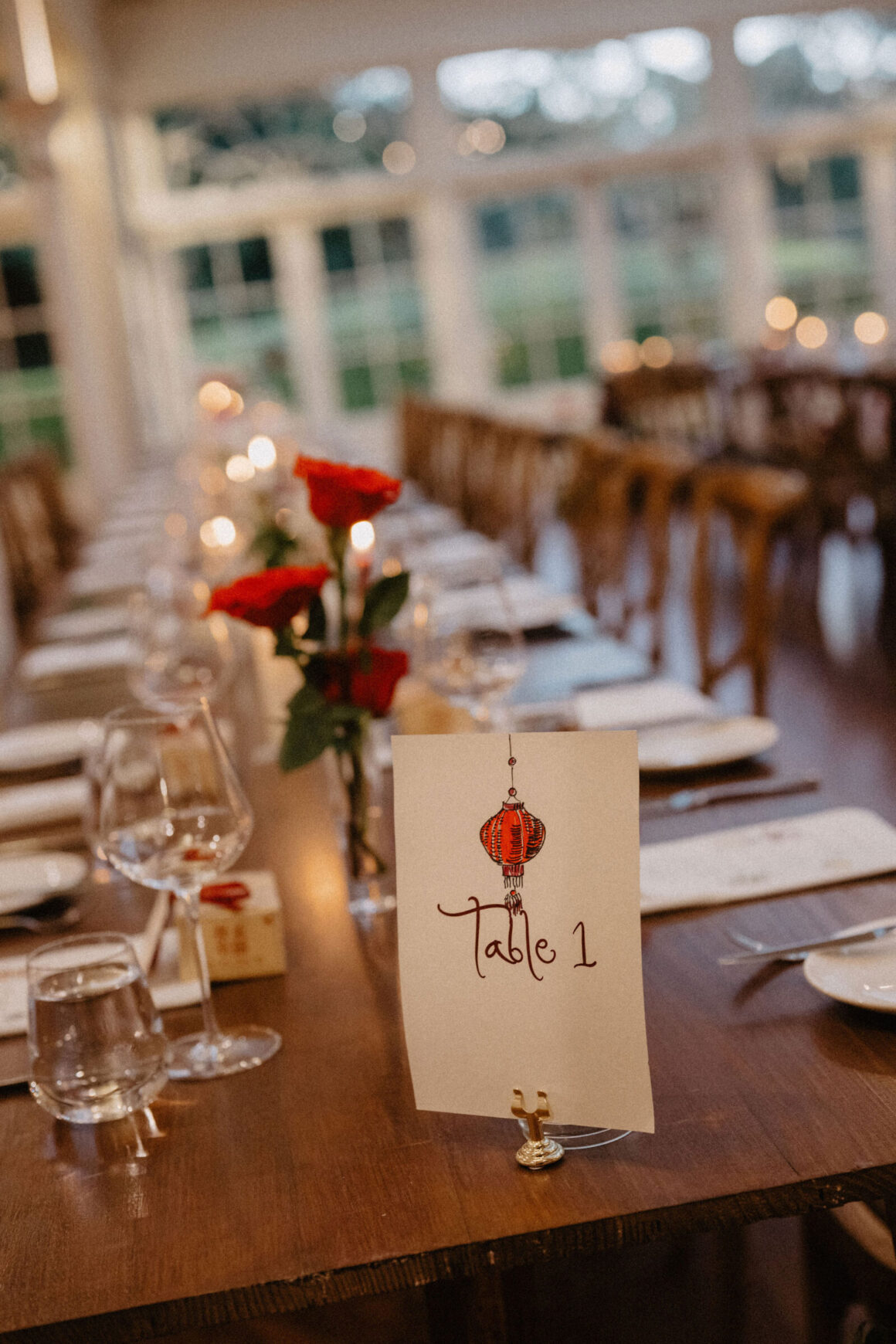 “We wanted to incorporate nods to Jacky’s Chinese heritage and to combine that with styling features that felt both modern and timeless. We hung traditional lanterns in the trees and incorporated red across our colour palette as this is considered an auspicious colour in Chinese culture. We also wanted to include as many handmade and sentimental touches as we could. My mum hand-drew illustrations on every menu card, and we wrote notes (in either English or Mandarin) for each guest inside their wedding favour box, which also included some of our favourite sweets (another tradition from China). ”