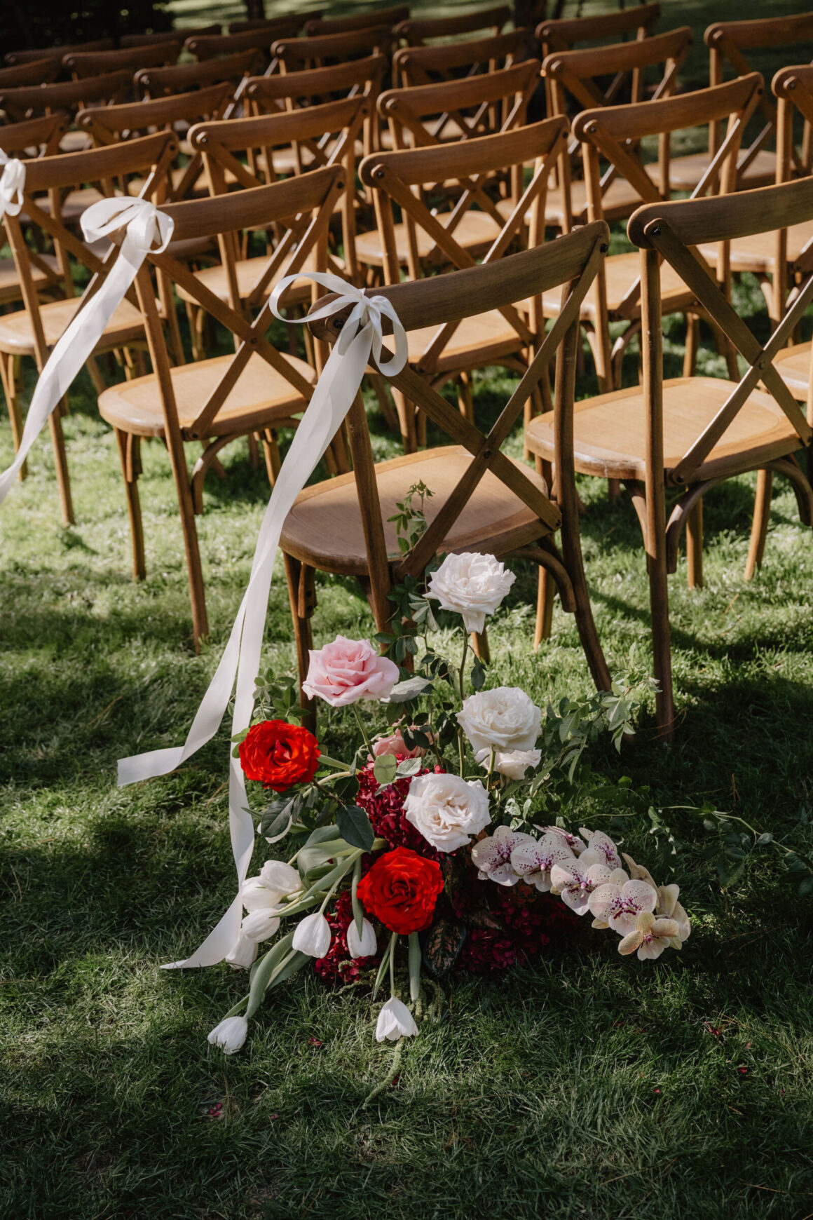 Red and white floral arrangement at Anna and Jacky’s Gabbinbar wedding ceremony