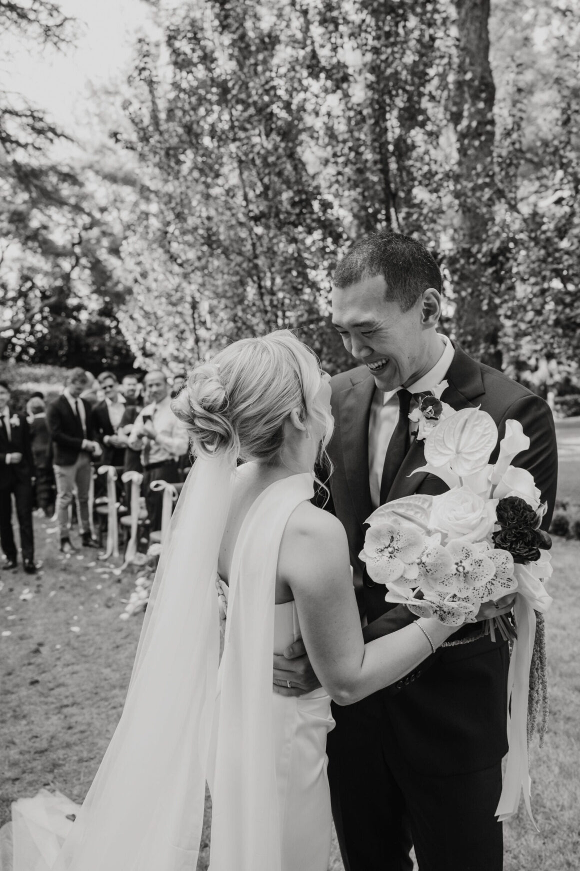 “Everyone said this to us before the wedding, and it is so true, and that is to take time away for yourselves throughout the day. Jacky and I were too full of adrenaline to eat much during dinner, so we slipped away and sat together in the bridal suite to take a moment for ourselves, slow down, and talk to one another in private, which we both needed at the time! We also had an unplanned private first dance in the early evening outside under the trees and fairy lights with just our photographer and videographer. This ended up being another highlight of our day and just shows that the quiet, private moments are the ones you remember and treasure the most from your wedding day.”