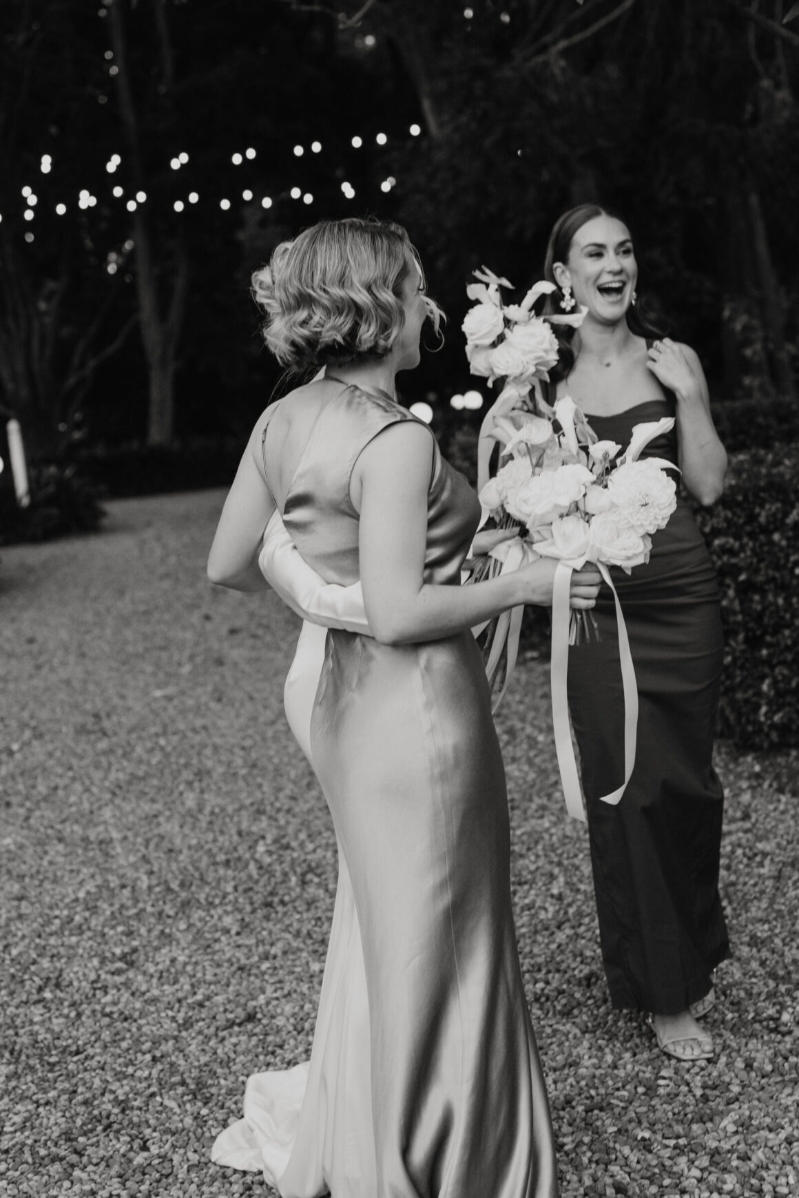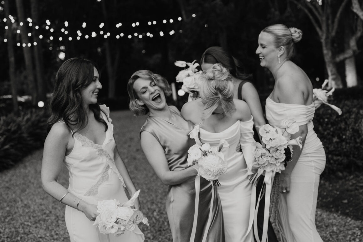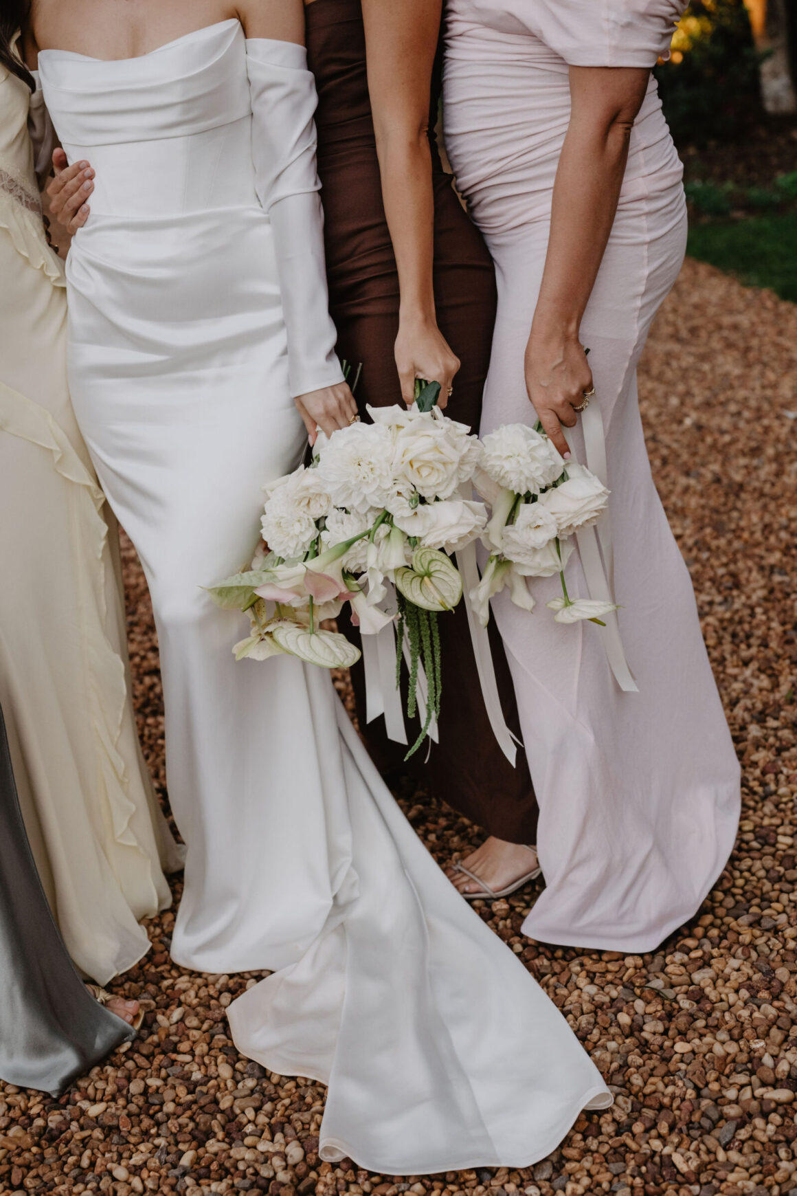 Bridesmaids in neutral dresses standing together at Anna and Jacky’s Gabbinbar wedding, Queensland