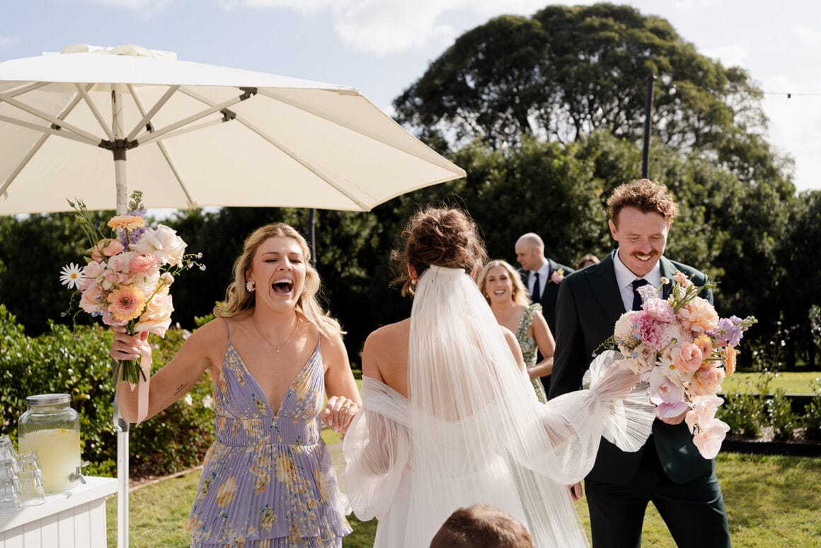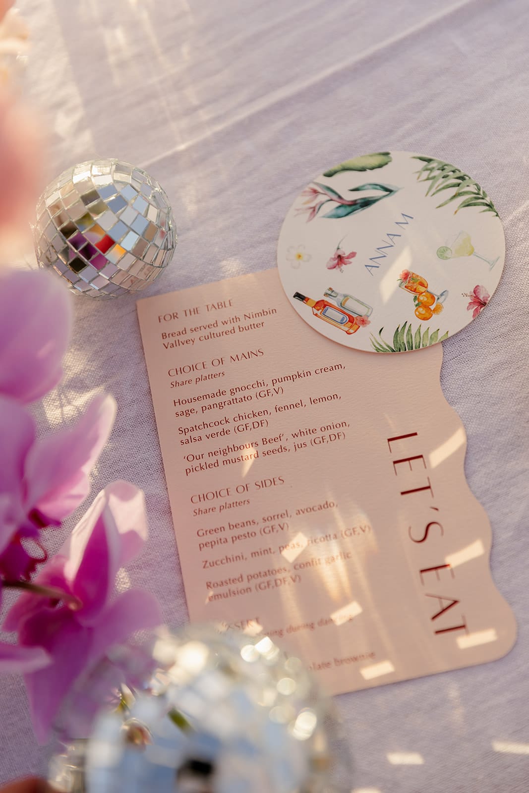 FAVE DETAILS “The flowers courtesy of Pikt Flowers were unbelievable, especially the bouquets! We literally carted as many flowers as we could with us for the next week back down the coast. The food from Fig Tree Restaurant was exceptional! Anna’s vegetarian brother even tried some of the beef because everyone was raving about how good it was! We had personalised coasters as place holders which were designed by our amazing friend at Two Sistahs Designs and they turned out so gorgeous. We could carry on all day about all the things we loved.”