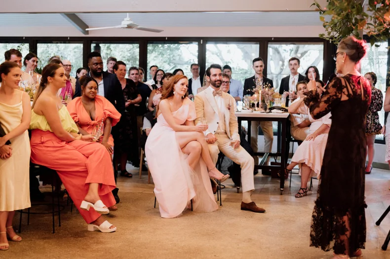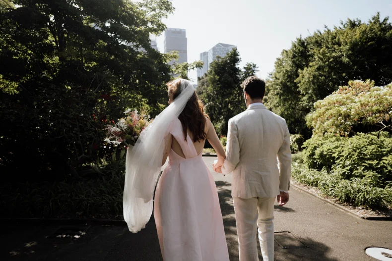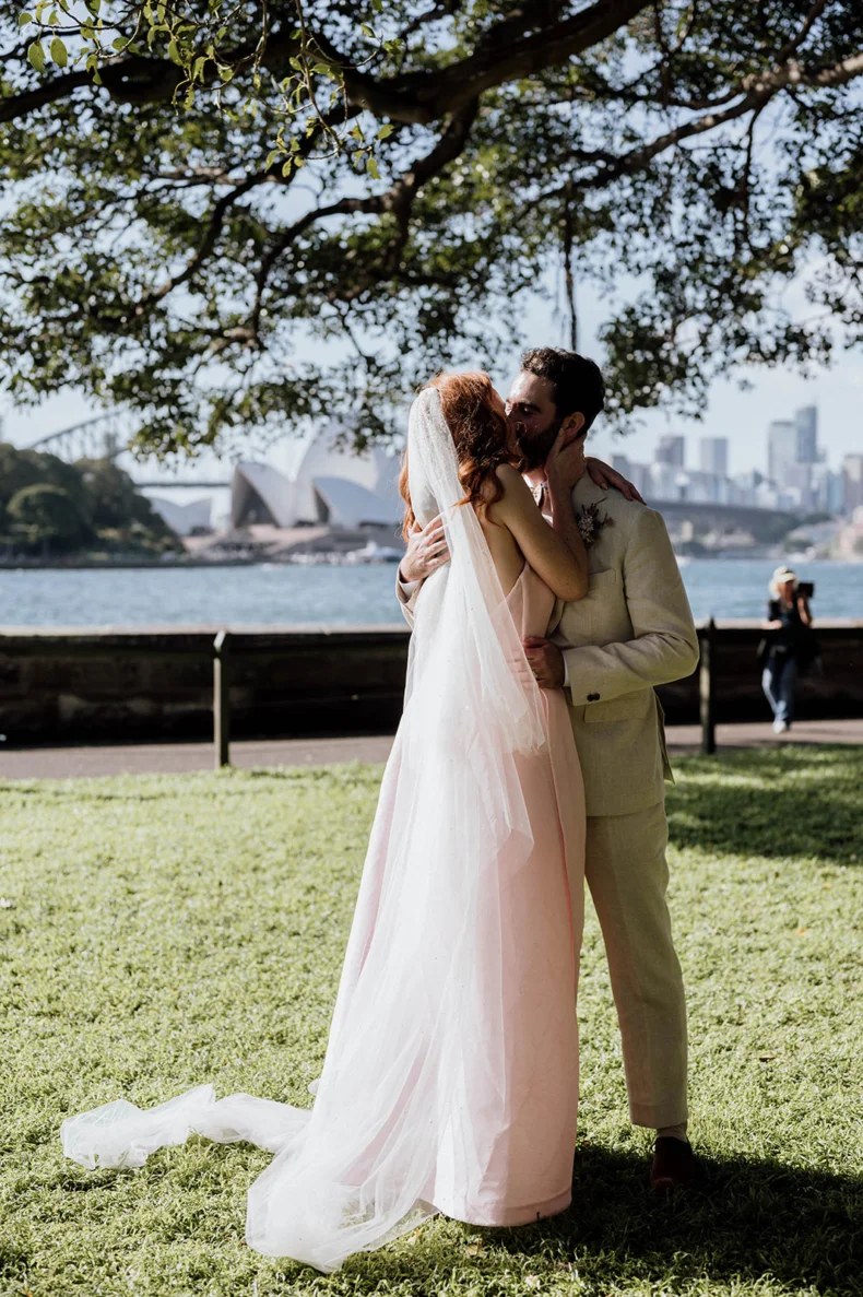 CONTRIBUTING VENDORS Photographer Ona Janzen On-the-day coordinator Hire a Bridesmaid Florist Bess Paddington Ceremony venue Royal Botanic Garden Sydney, the Harbour View Lawn Reception venue & Catering Botanic House Ice blocks Pops By Launch Cake Added Sugar Lighting Festoon Lighting Sydney Sound Hire & Entertainment Lily Road Celebrant Liv Ronan (friend) Rings Antique Art Design Genevieve Phillips Dance teacher Stella from Arthur Murray THE BRIDE Bridal gown Rachel Gilbert Reception dress Christopher Esber Veil Steven Khalil Shoes Jimmy Choo, Anine Bing Accessories Christie Nicolaides Hair Natalie Mansweto Makeup Gillian Campbell THE GROOM Suit & Shirt Mawson Òssa Shoes Fratelli Rossetti