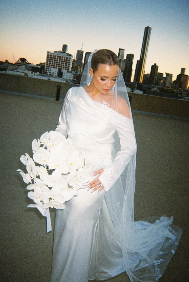 FAVE DEETS “The flowers were INSANELY BEAUTIFUL. I was set on having these dramatic, ethereal floral arrangements with greenery and luxe white flowers, which included a big half-arched arrangement for the ceremony – Kat from Garden Graffiti made the most beautiful ceremony flowers, and gave me the most luscious beautiful arrangements of orchids for my bridal bouquet. And my most fave detail – we chose to serve a midnight snack. This obviously had to be chocolate brownies and espresso martinis provided by The Calile Hotel. By the end of the night there was not a brownie or martini in sight – the best idea ever for a wedding snack!”