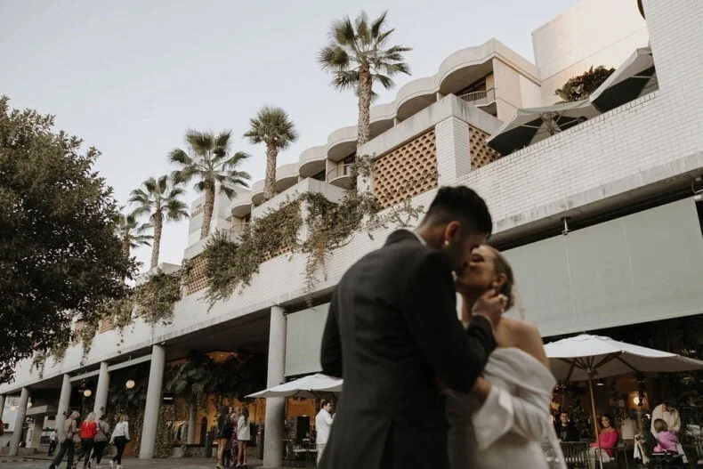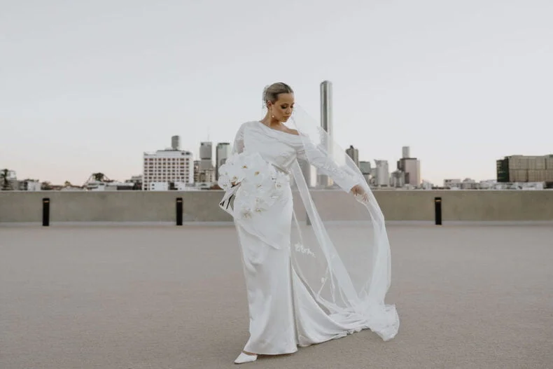 THE VENUE “We were living in Melbourne, but most of my family had moved to Queensland, so when it came time to decide on a wedding venue, Ryan and I thought a destination wedding would be a beautiful break for our friends and family. The Calile Hotel was the first venue we looked at and instantly fell in love with. We both loved that it was non-traditional and also so beautiful – the architecture, the rawness of the materials used, and the greenery that grew around the walls and exterior of the space.”