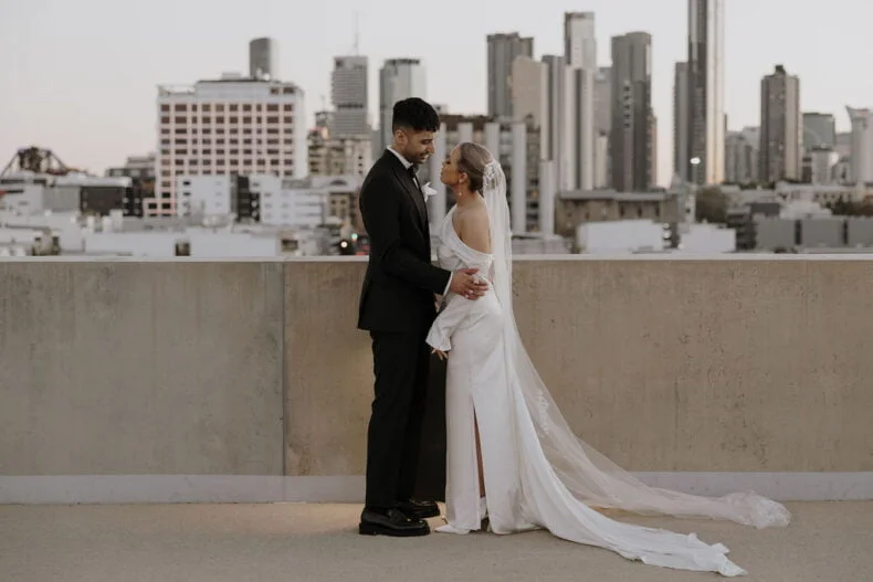 Photographer George Bowden Cinematographer CJ Visuals Florist Garden Graffiti Ceremony & reception venue The Calile Hotel Cake I Heart Cakes by Casey Cake topper Elegant Ivy Weddings via Etsy Wedding favours Creative Sugar Arts Hire Items Ivy and Bleu Signage Paper / Paper Co Entertainment DJ Sinister, Chorus Collective Celebrant Mike Webber (uncle) Rings White November, The Ouze Vow books Rabbit Loves Graphics via Etsy THE BRIDE Bridal gown designer Grace Loves Lace Reception dress Bec + Bridge, The Bar Wedding Saree Singhs Big Bazaar Veil Grace Loves Lace Robes Le Rose Shoes Aere via The Iconic Accessories White November Hair Edwards and Co Makeup Makeup By Madi Fragrance Byredo THE GROOM Suit & shirt Zacmens Bow tie Otaa Cufflinks In Gold We Trust Paris Shoes Ami Paris Earrings Martyre Fragrance Byredo Accessories Emanuele Bicocchi,The Great Frog, Deadblind Barber Ryan Co