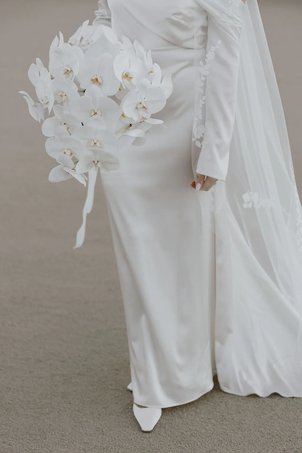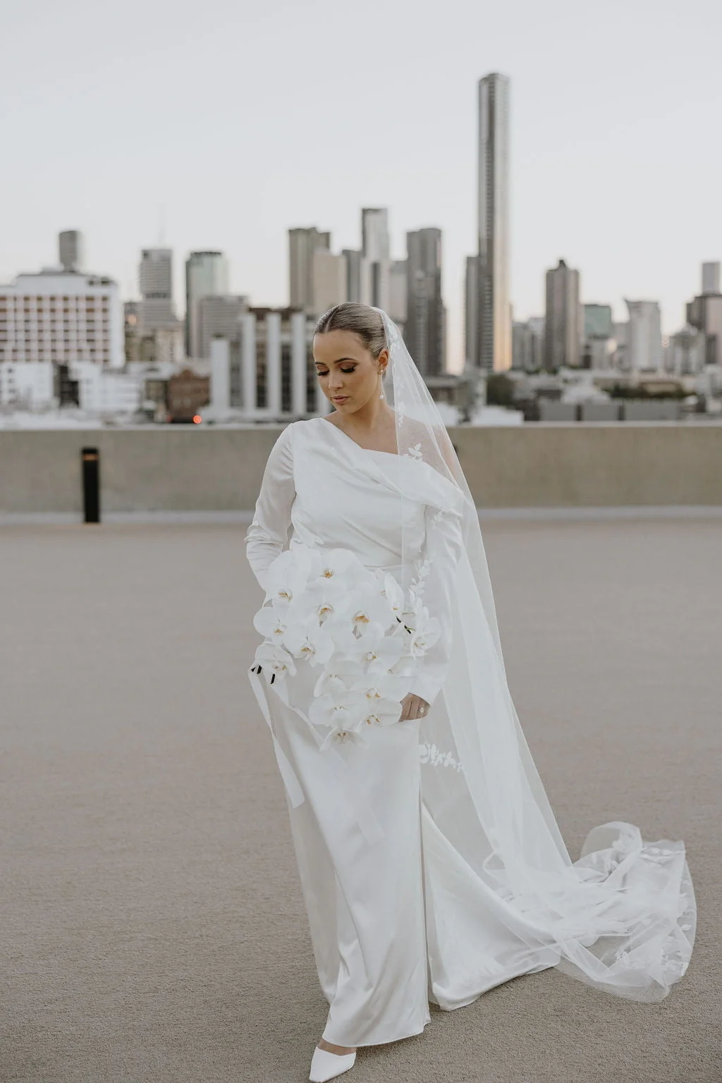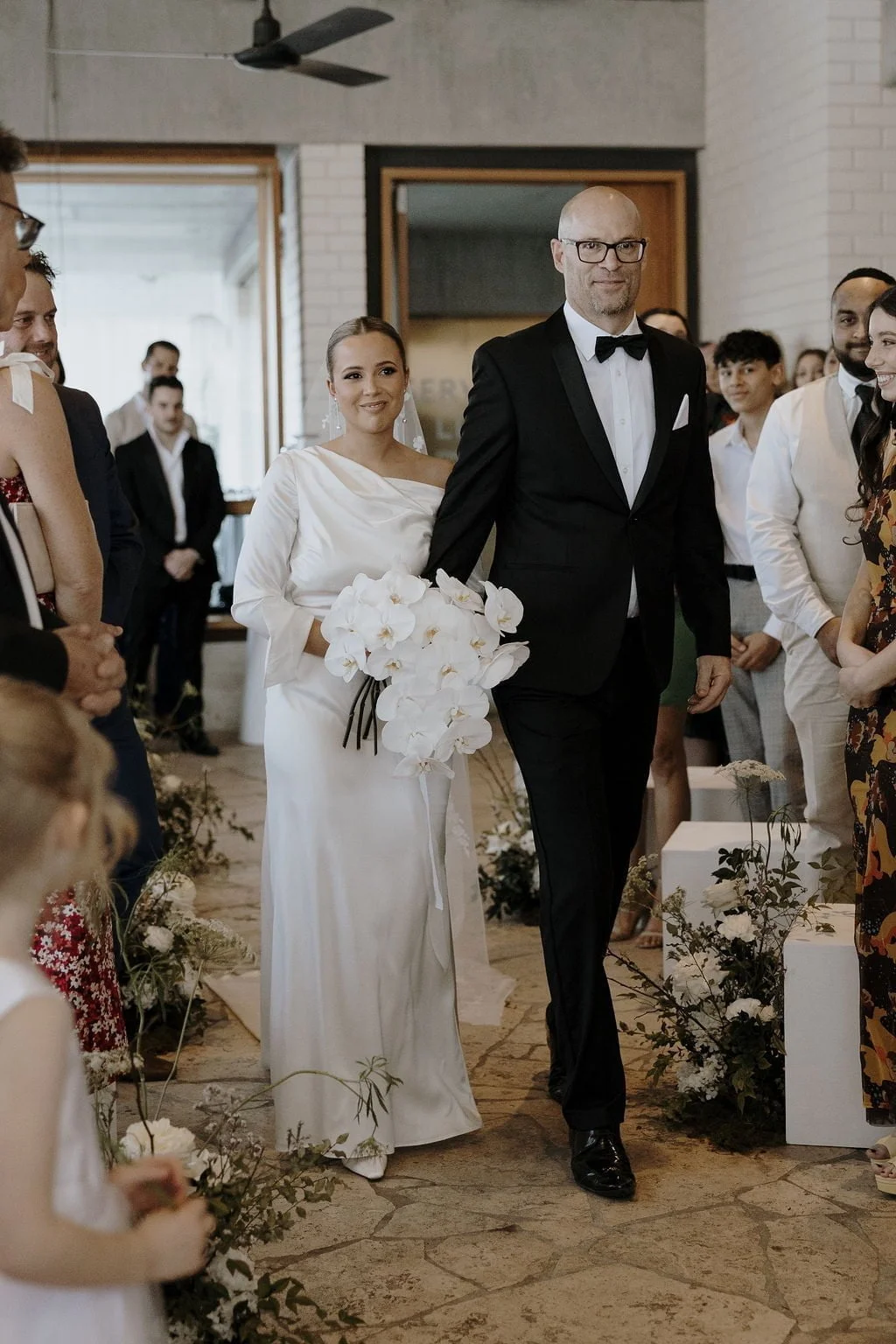 FAVE DEETS “The flowers were INSANELY BEAUTIFUL. I was set on having these dramatic, ethereal floral arrangements with greenery and luxe white flowers, which included a big half-arched arrangement for the ceremony – Kat from Garden Graffiti made the most beautiful ceremony flowers, and gave me the most luscious beautiful arrangements of orchids for my bridal bouquet. And my most fave detail – we chose to serve a midnight snack. This obviously had to be chocolate brownies and espresso martinis provided by The Calile Hotel. By the end of the night there was not a brownie or martini in sight – the best idea ever for a wedding snack!”