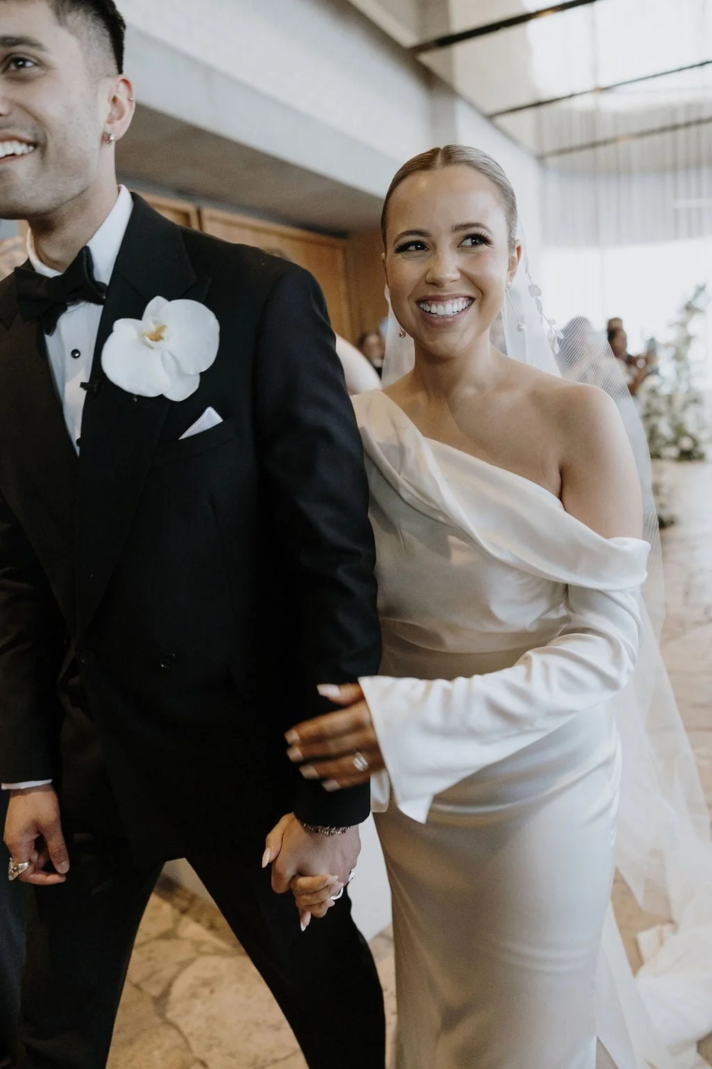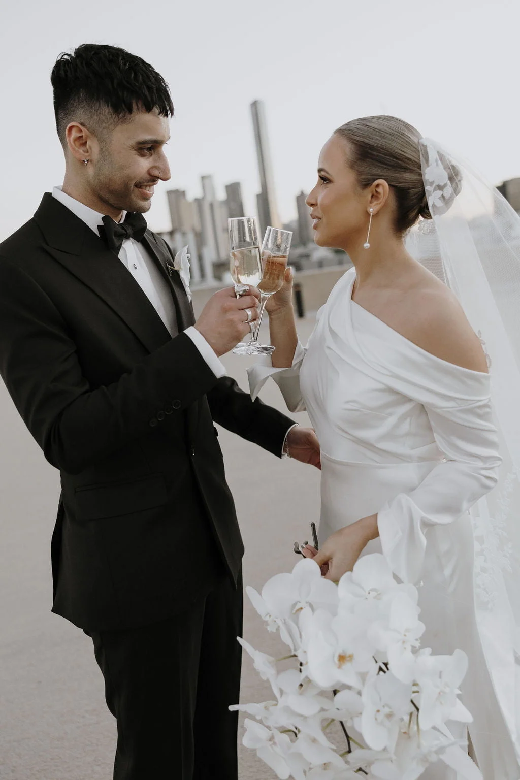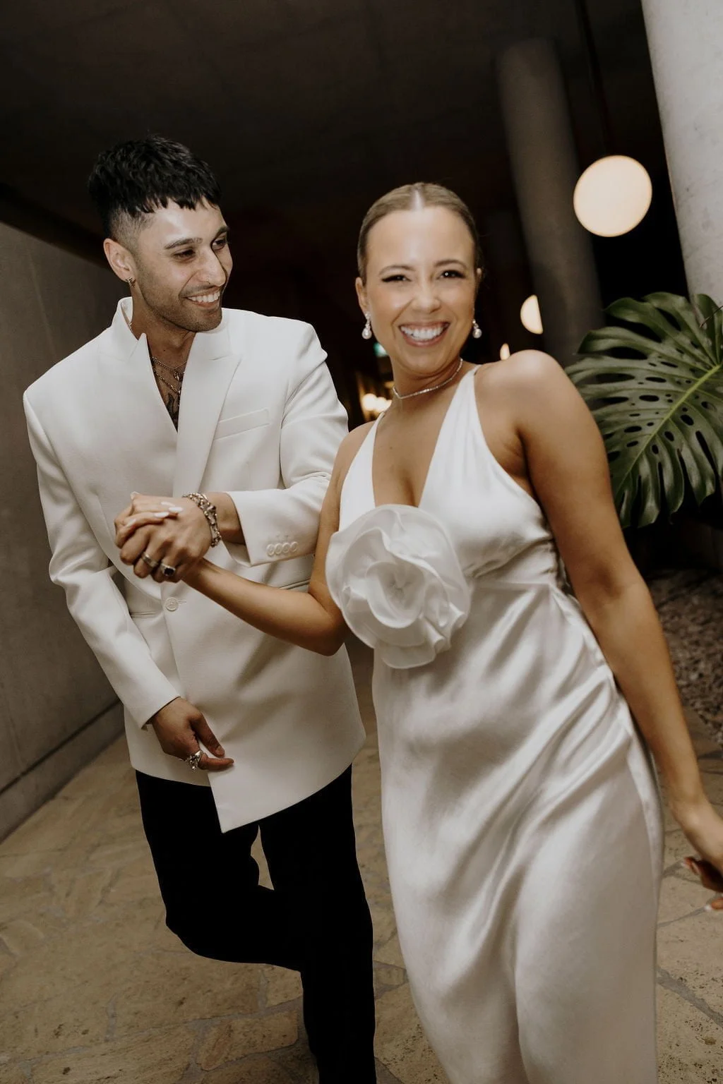 Photographer George Bowden Cinematographer CJ Visuals Florist Garden Graffiti Ceremony & reception venue The Calile Hotel Cake I Heart Cakes by Casey Cake topper Elegant Ivy Weddings via Etsy Wedding favours Creative Sugar Arts Hire Items Ivy and Bleu Signage Paper / Paper Co Entertainment DJ Sinister, Chorus Collective Celebrant Mike Webber (uncle) Rings White November, The Ouze Vow books Rabbit Loves Graphics via Etsy THE BRIDE Bridal gown designer Grace Loves Lace Reception dress Bec + Bridge, The Bar Wedding Saree Singhs Big Bazaar Veil Grace Loves Lace Robes Le Rose Shoes Aere via The Iconic Accessories White November Hair Edwards and Co Makeup Makeup By Madi Fragrance Byredo THE GROOM Suit & shirt Zacmens Bow tie Otaa Cufflinks In Gold We Trust Paris Shoes Ami Paris Earrings Martyre Fragrance Byredo Accessories Emanuele Bicocchi,The Great Frog, Deadblind Barber Ryan Co