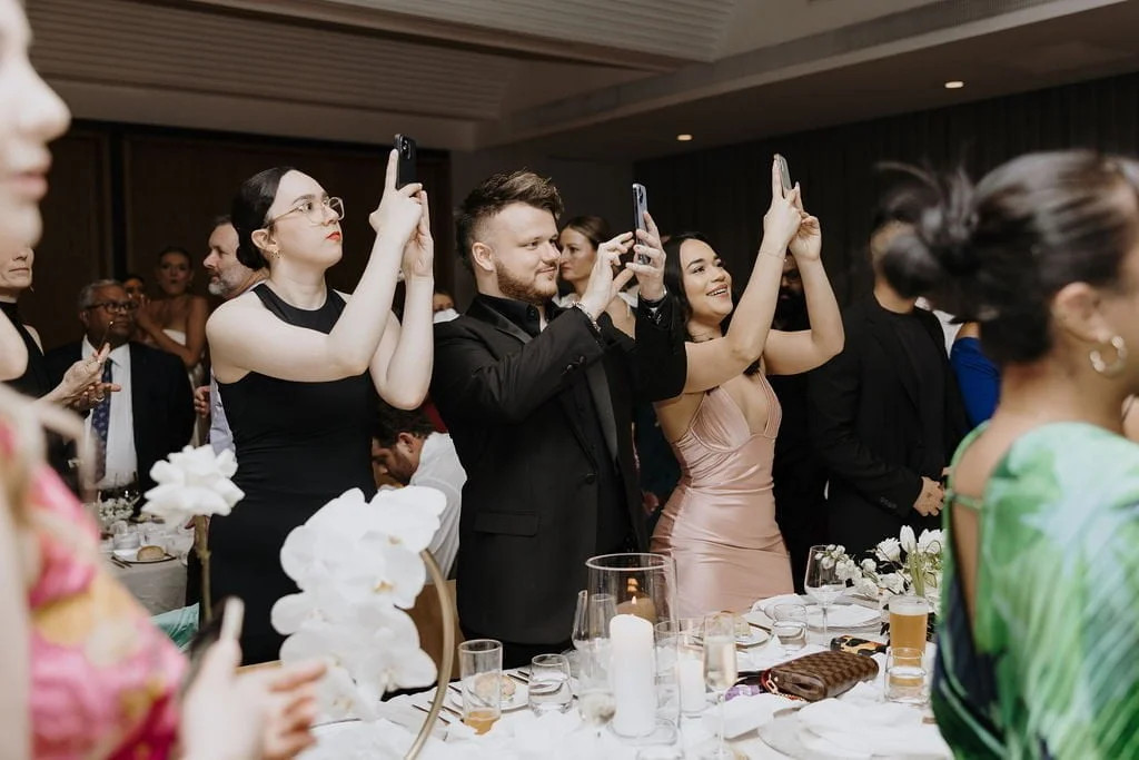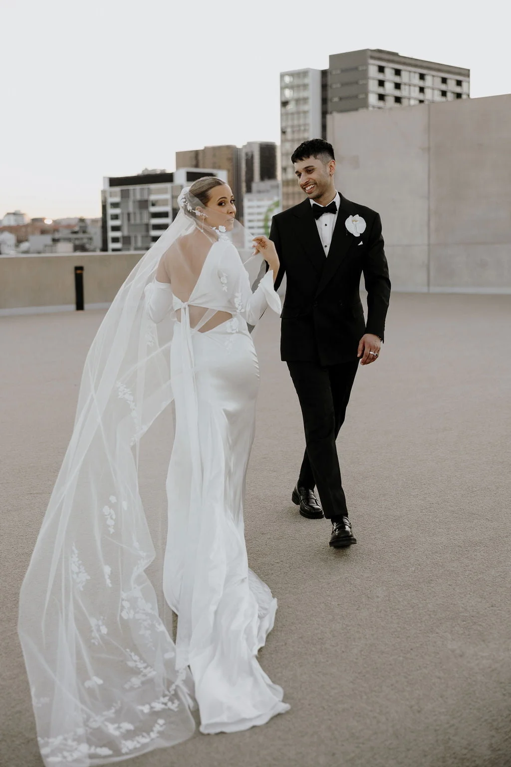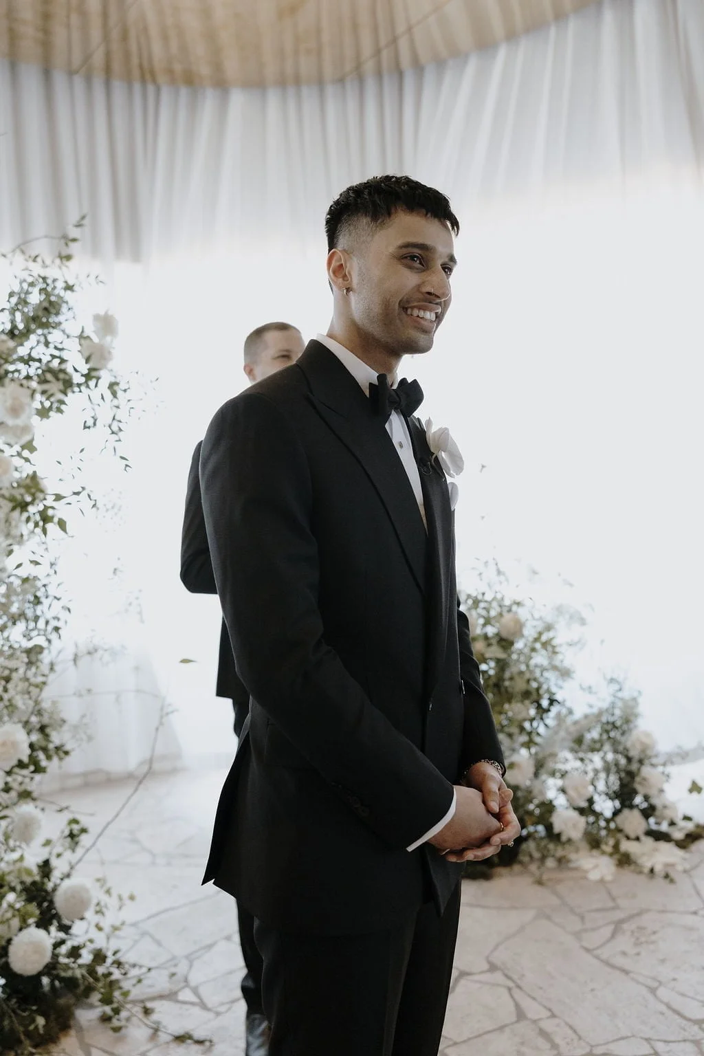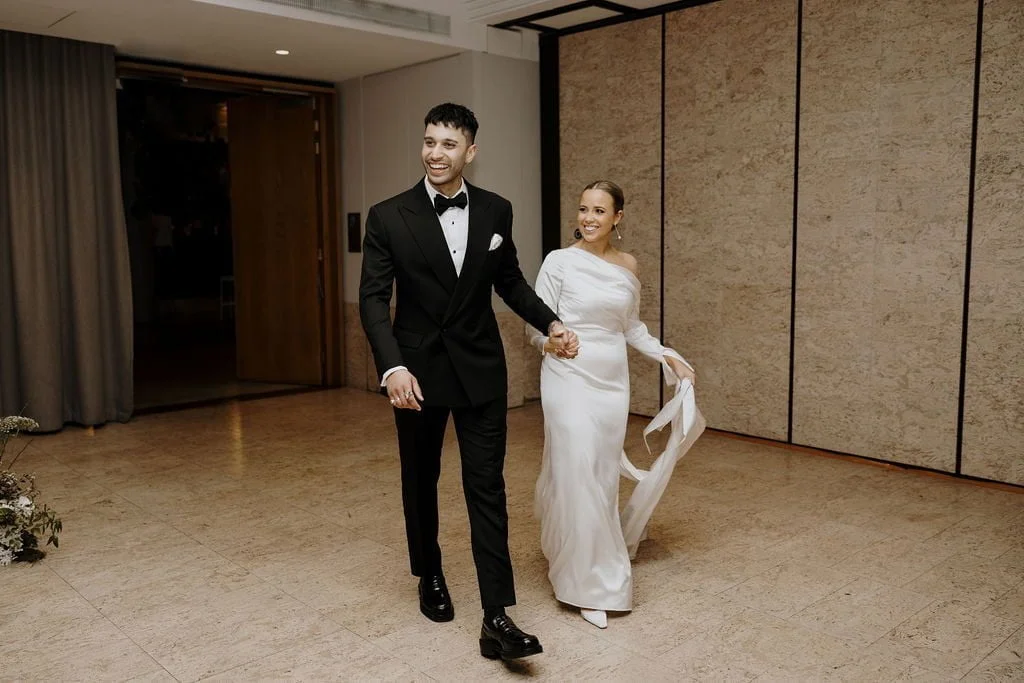 Photographer George Bowden Cinematographer CJ Visuals Florist Garden Graffiti Ceremony & reception venue The Calile Hotel Cake I Heart Cakes by Casey Cake topper Elegant Ivy Weddings via Etsy Wedding favours Creative Sugar Arts Hire Items Ivy and Bleu Signage Paper / Paper Co Entertainment DJ Sinister, Chorus Collective Celebrant Mike Webber (uncle) Rings White November, The Ouze Vow books Rabbit Loves Graphics via Etsy THE BRIDE Bridal gown designer Grace Loves Lace Reception dress Bec + Bridge, The Bar Wedding Saree Singhs Big Bazaar Veil Grace Loves Lace Robes Le Rose Shoes Aere via The Iconic Accessories White November Hair Edwards and Co Makeup Makeup By Madi Fragrance Byredo THE GROOM Suit & shirt Zacmens Bow tie Otaa Cufflinks In Gold We Trust Paris Shoes Ami Paris Earrings Martyre Fragrance Byredo Accessories Emanuele Bicocchi,The Great Frog, Deadblind Barber Ryan Co