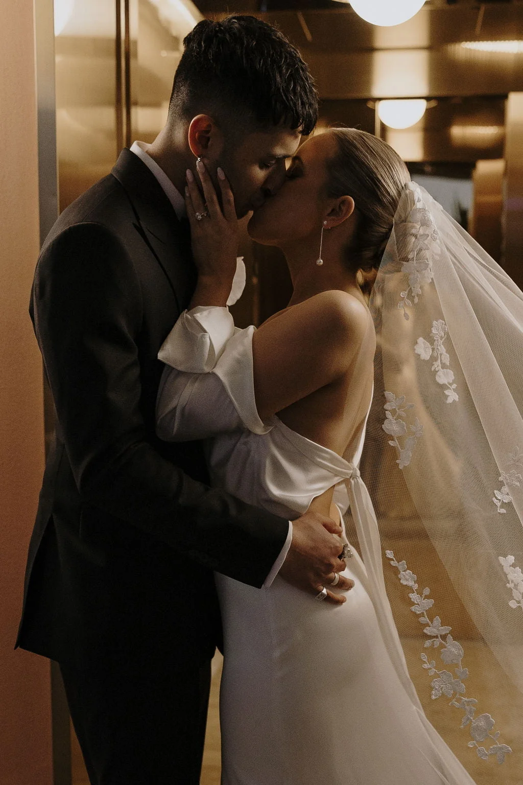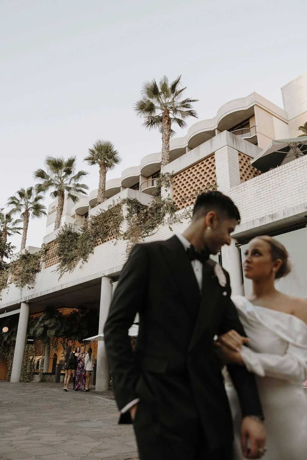 THE VENUE “We were living in Melbourne, but most of my family had moved to Queensland, so when it came time to decide on a wedding venue, Ryan and I thought a destination wedding would be a beautiful break for our friends and family. The Calile Hotel was the first venue we looked at and instantly fell in love with. We both loved that it was non-traditional and also so beautiful – the architecture, the rawness of the materials used, and the greenery that grew around the walls and exterior of the space.”