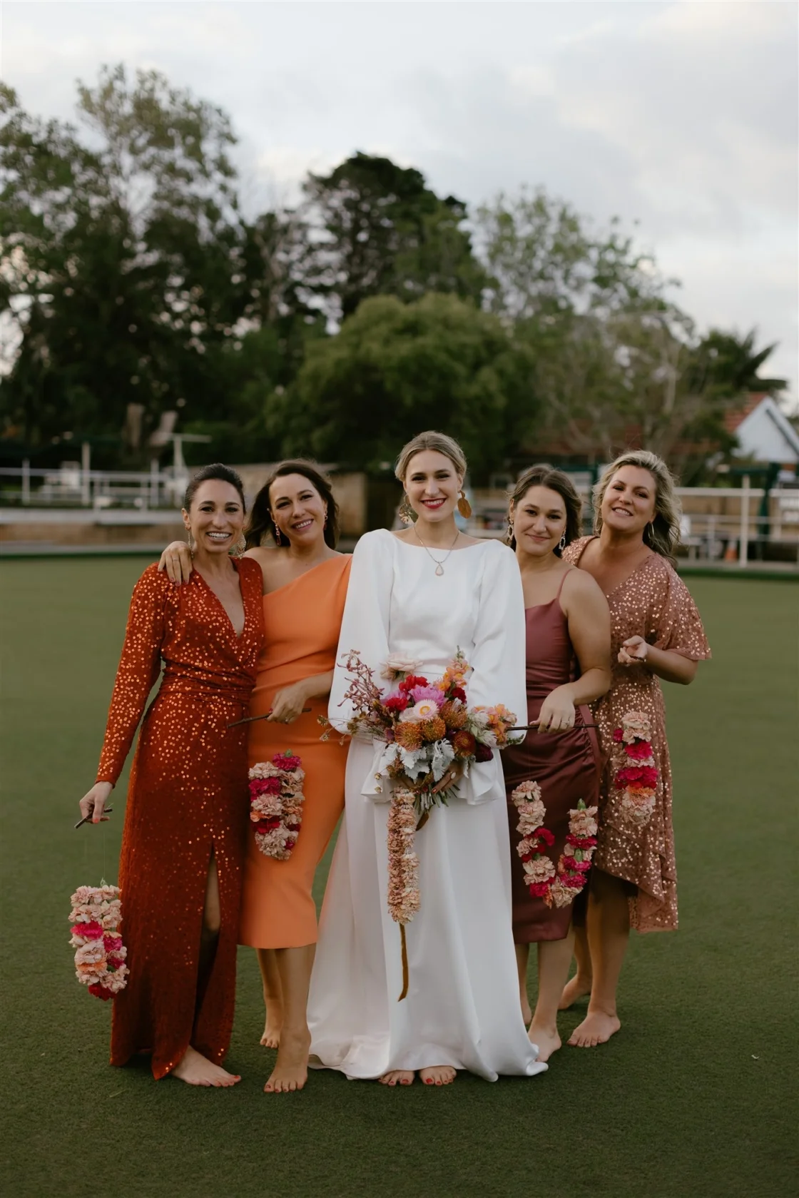 CONTRIBUTING VENDORS Photographer Oliver Smith Photo Cinematographer Joyride Stylist & Florist The Marmalade Sky Ceremony & Reception South Cronulla Bowling Club Catering Balinese Spice Magic Cake Topper Communicake It Light, Sound & Hire Items The Marmalade Sky Entertainment Victor Valdes Celebrant Andrea Calodolce Rings Diann Darling Jewellers (bride), Laura Armstrong Jewellery (groom) THE BRIDE Dress Collezione Santina Couture Veil Karen Willis Holmes Shoes Zomp Accessories Molten Store (earrings), Reliquia Collective (letter pendants on gown) Hair The Neighbourhood Salon Makeup Jenny Bird Makeup Bridesmaid dresses ASOS, Bec + Bridge Forever New Bridesmaid gifts Mecca Cosmetica THE GROOM Suit Acne Studios Shirt Collezione Santina Couture (custom-made from heirloom silk batik fabric) Shoes R.M. Williams Groomsmen suits Acne Studios, Joe Black, M.J. Bale Groomsmen gifts SVORD Knives