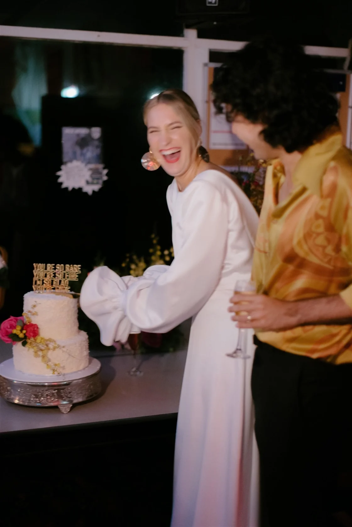 FAVOURITE DETAILS “I gave Kimberley from The Marmalade Sky free reign with my bouquet. I basically just told her a few colours I like and she absolutely nailed it. I couldn’t have wished for a more perfect bouquet. It was epic and felt so right for me. Also, my mum made our wedding cake, which was really special. She made a chocolate and vanilla cake with a fluffy coconut hairdo that was as adorable as it was delicious. Communicake It made our cake topper, which was lyrics from one of our favourite songs (Take Yo’ Praise by Camille Yarbrough).”