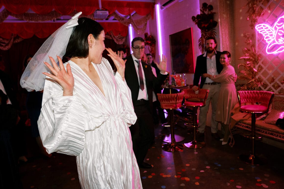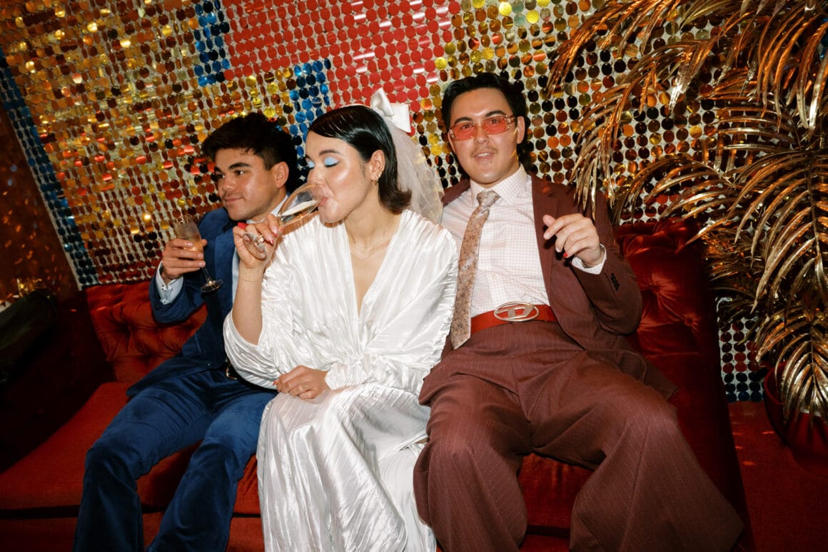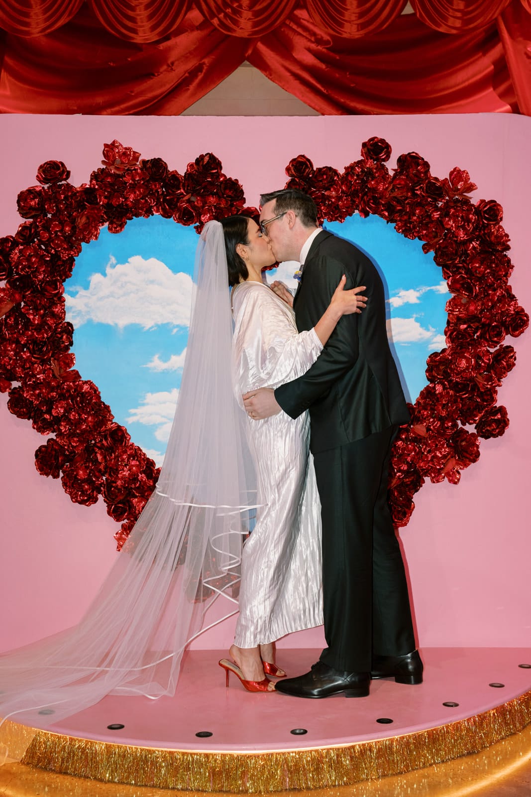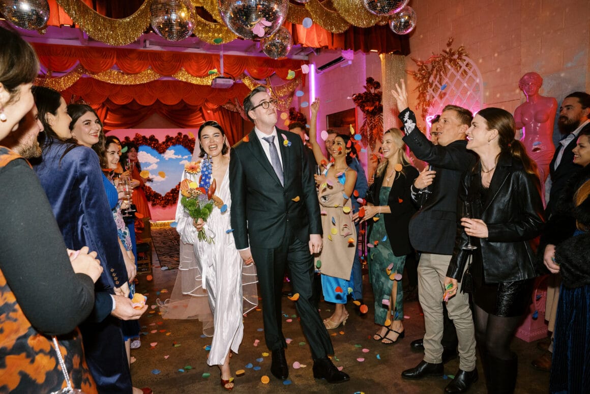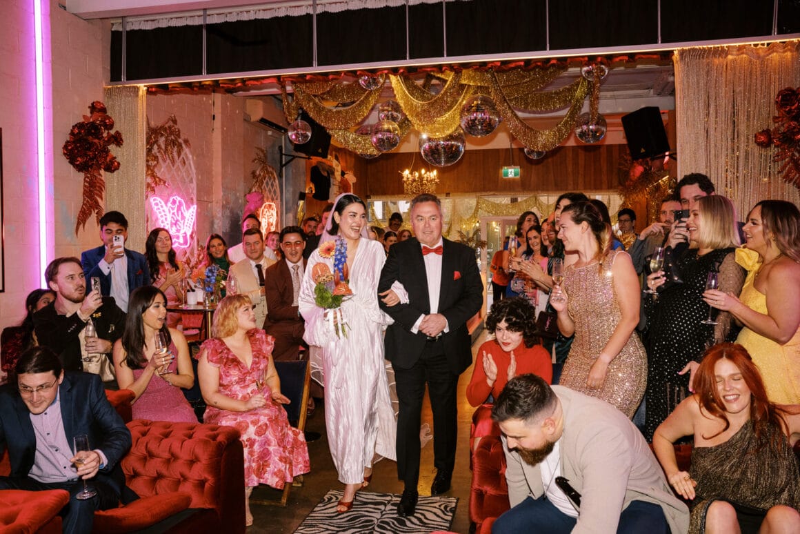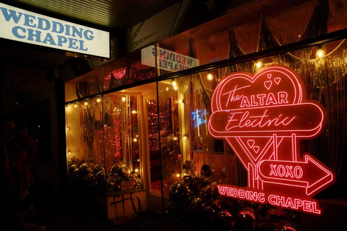 Asheda and Travers didn’t have to look far in hunting for a spot to get hitched – The Altar Electric was just down the road from their Melbourne abode! This duo of eight years fully embraced the venue’s bold aesthetics and Vegas chapel-esque vibe, while weaving in their own quirky, “out of the box” details (a butter sculpture, custom playing cards for guests to sign, and ice cream cake, to name a few).