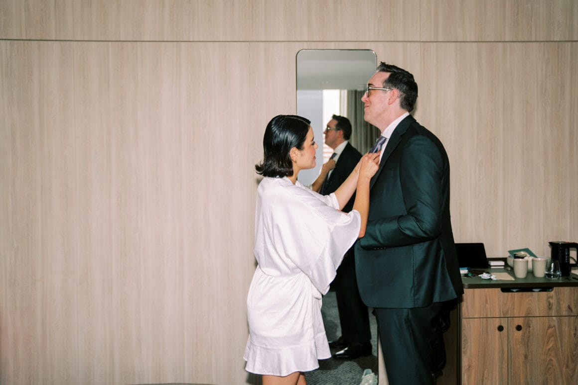 THE SUIT “We wanted something custom that [would suit the cooler season we were getting ready in, and was a colour Travers didn’t have and could wear again for future events. So a green suit with rich red inside lining, including our wedding date embroidered on the inside pocket, is a story in itself. InSitchu is around the corner from our current apartment, and after some research, we loved its simplicity and process of designing the suit. It was a seamless process to design a custom suit.