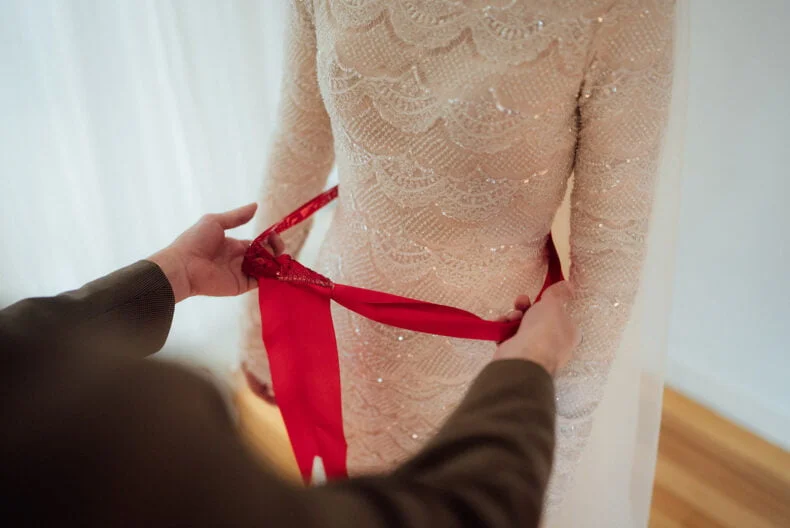 THE DRESS “I was fortunate enough to have my childhood friend make my wedding dress. I wanted an effortlessly timeless, beaded French lace dress inspired by iridescent palettes of celestial midnight skies. She brought my vision to life in under two months.”