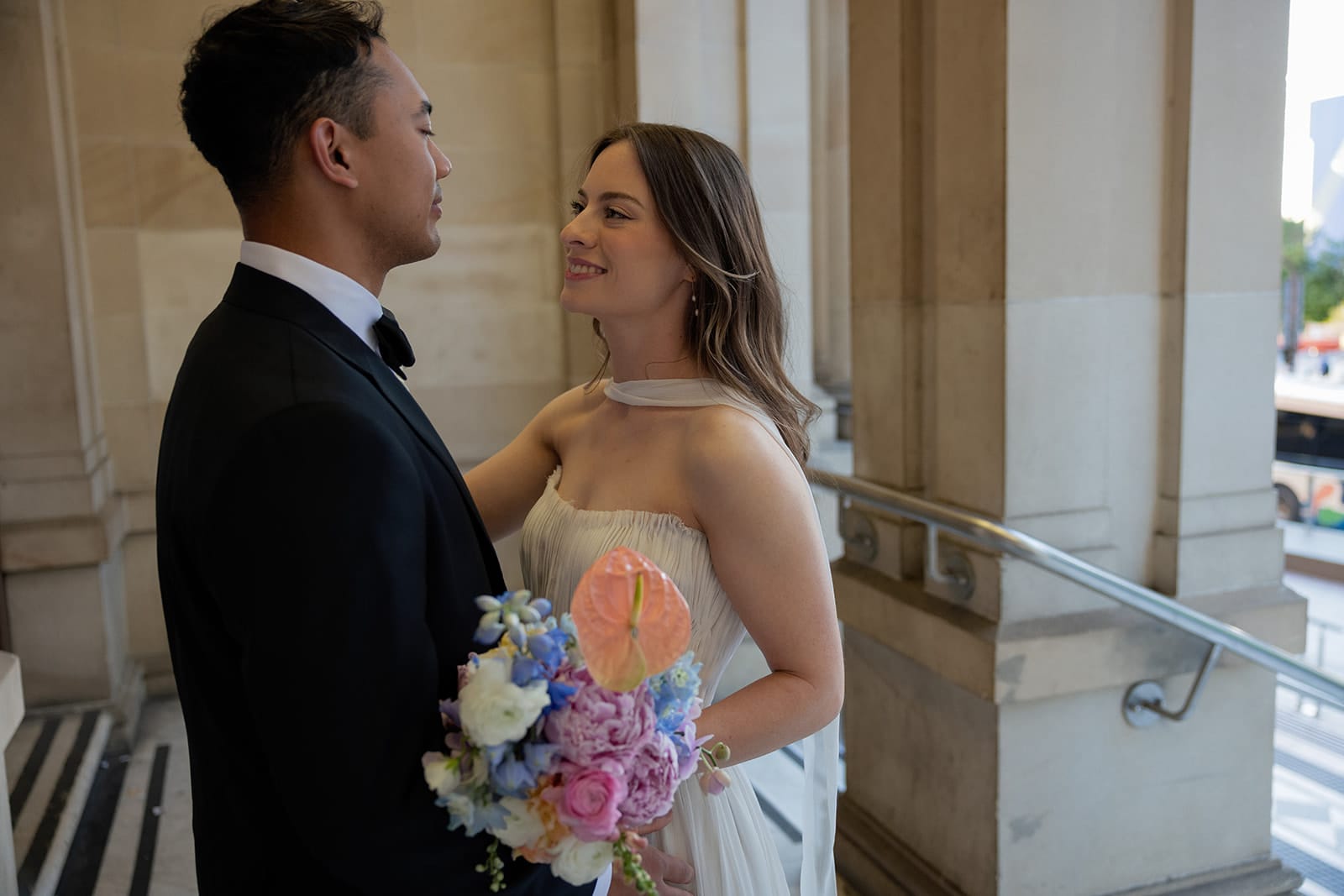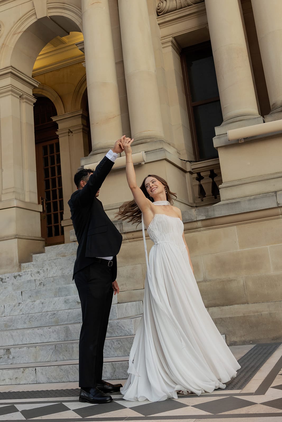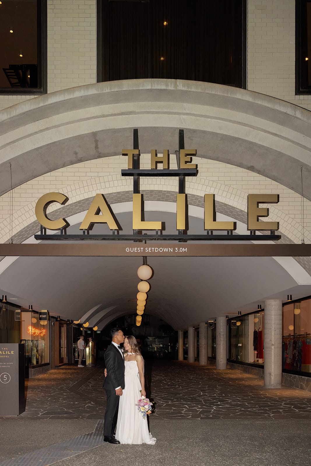 “Dom and I decided we would meet up at our hotel after getting ready to travel to the registry together. As we were getting out of the elevator, Dom stepped on the train of my dress and ripped my dress where the skirt attached to the bodice. We both kept our composure and did not panic! Thankfully the staff at The Calile reception were able to pin my dress back together. Their work was so well done that you couldn’t even tell that the dress had been ripped. Looking back, it’s a bit of a comical moment for us… Special shout-out to the staff at The Calile for their quick thinking and incredible tailoring skills!”