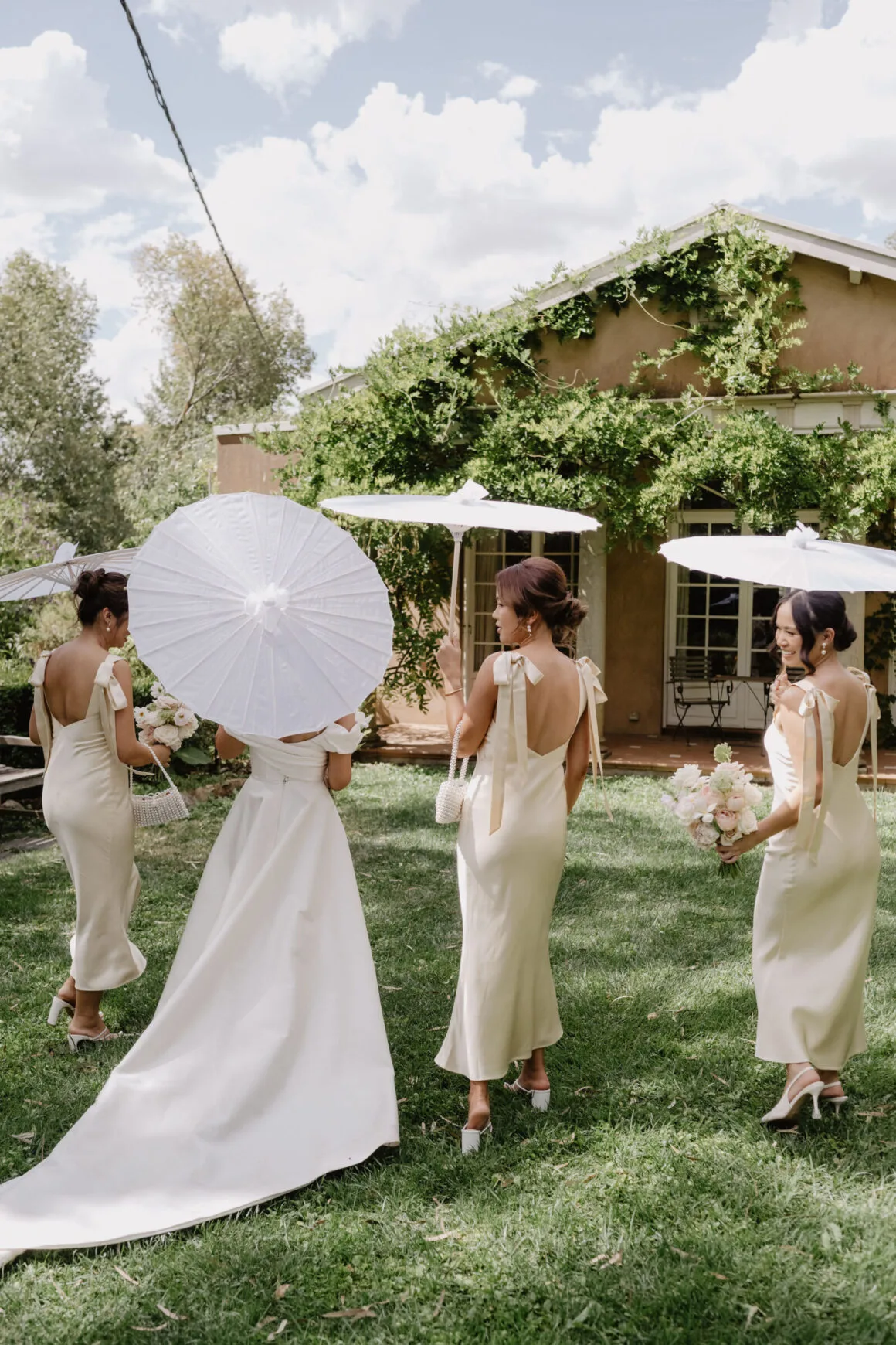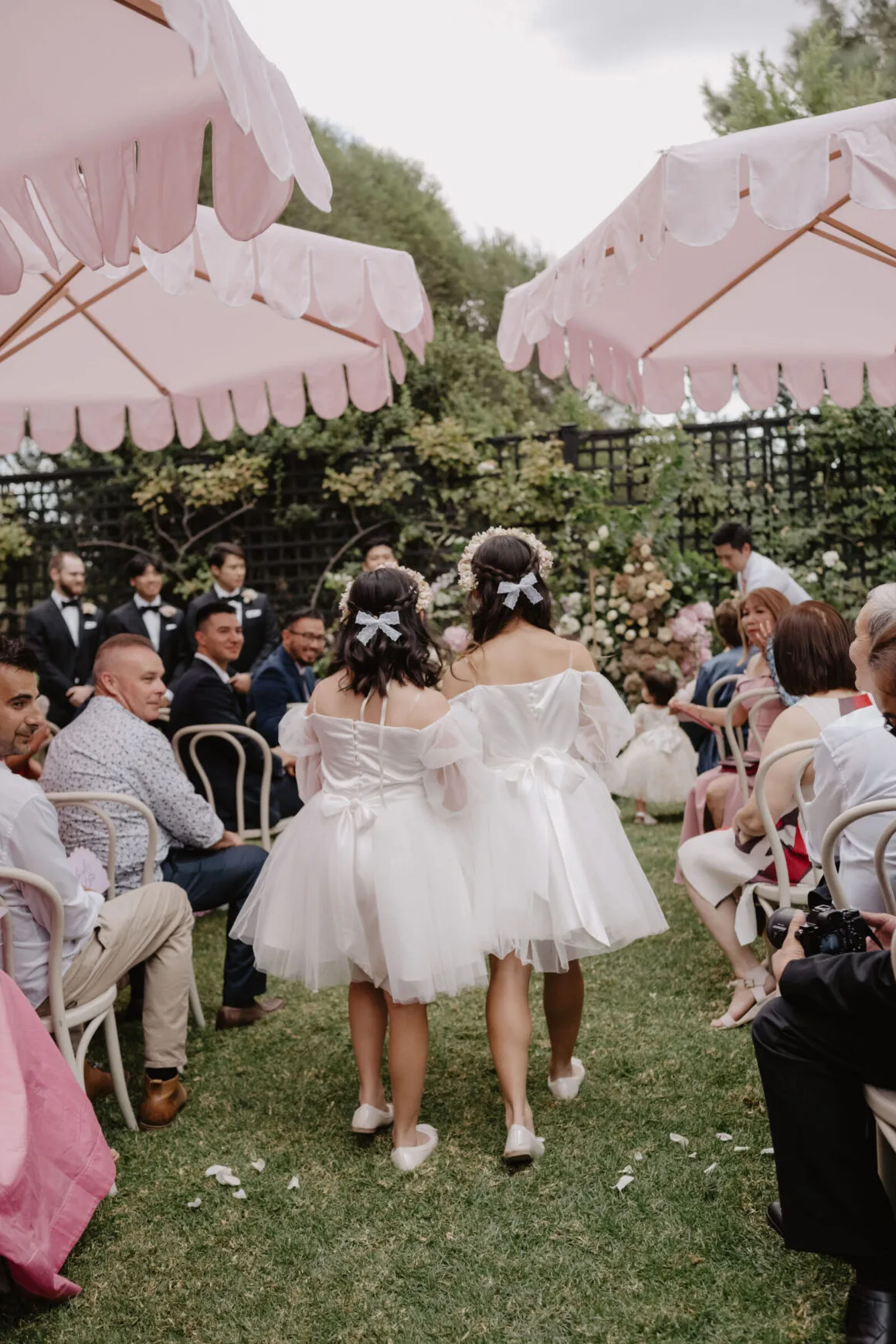 Binh and Steve’s pastel garden party was a certified delight. In the countdown to Mr and Mrs, this pair of almost five years maintained their oh-so-chill outward demeanour. But, on the inside, they couldn’t help but fret about the predicted 40-degree forecast. Mission ‘collect every cooling mechanism you can think of’ was a go until the big day itself arrived bringing what else… but rain! “Who could have guessed it? Luckily, the parasols doubled as umbrellas, and it cooled everything right down before the reception kicked off.”