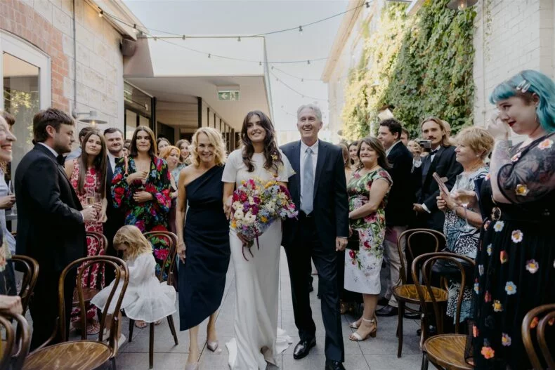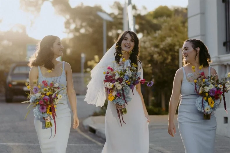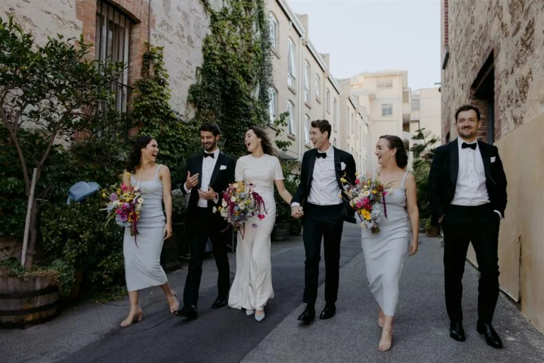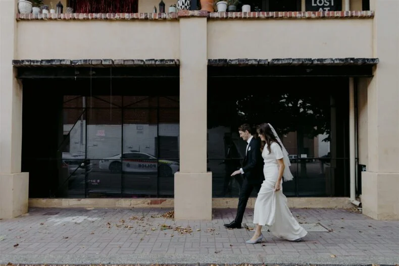 CONTRIBUTING VENDORS Photographer Flossy Photo Event Planner Amelia – Guildhall Event Space Florist The Flowergirl Perth Stationery Bryce Conway (Groom) & Henry King (Friend) Venue & Catering Guildhall Event Space Cake Maker Wild Bakery Lighting Hire JC Festoon Lighting Signage Bridget Pendergast (Bride), Bryce Conway (Groom) & Sticker Mule Celebrant Married by Megs Rings Sarah & Sebastian Entertainment Yon Jovi THE BRIDE Bridal Gown Designer Harriette Gordon Bridal Boutique Noa Bridal Veil Amélie George Shoes Zomp Hair & Makeup The Pretty Parlour Bridesmaid Dresses Bec + Bridge THE GROOM Suit & Pants M.J. Bale Shirt, Cufflinks & Bow Tie P.Johnson Shoes Ted Baker Watch Longines Barber / Grooming Billy Snips – Bloodhound Barbers