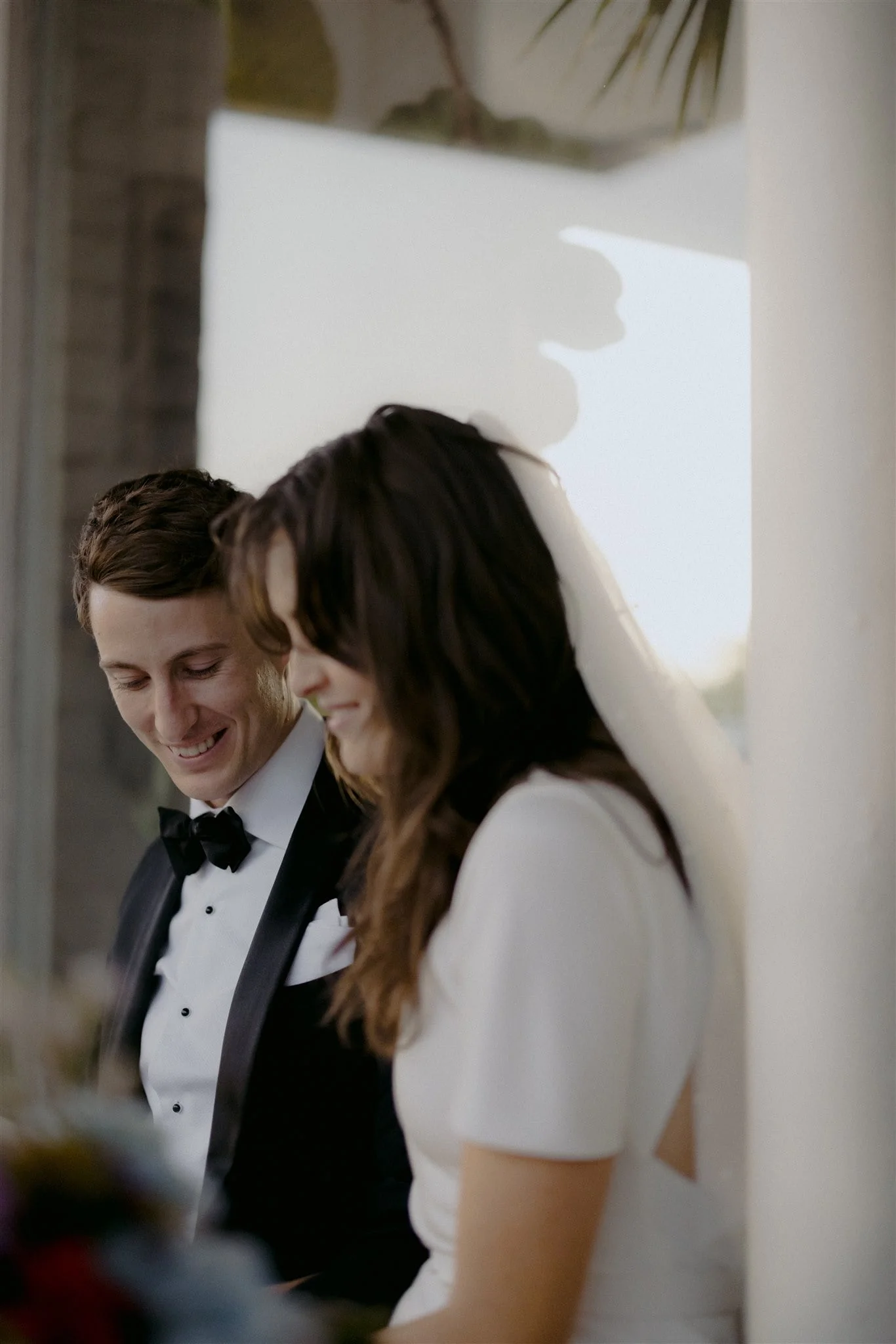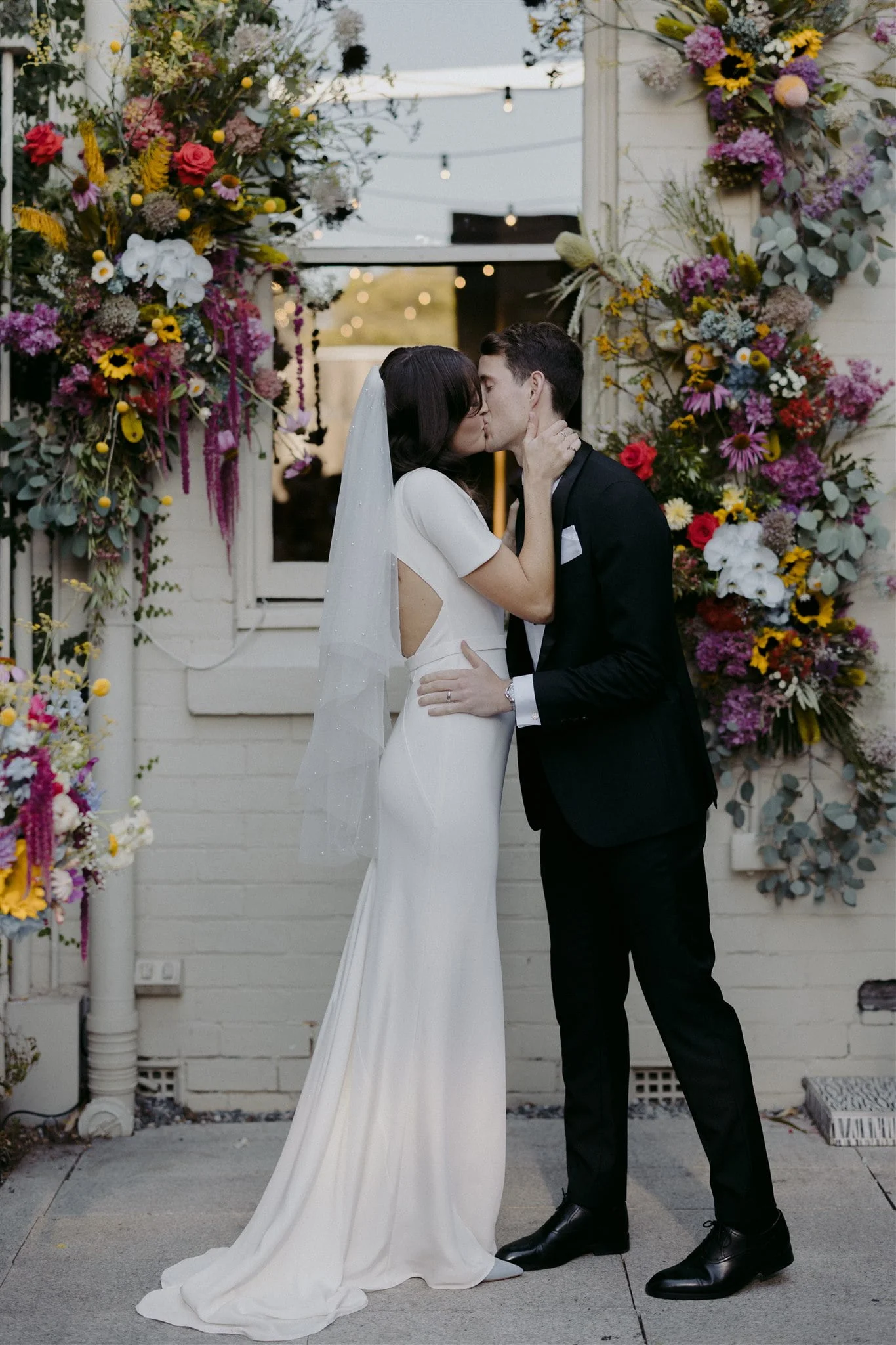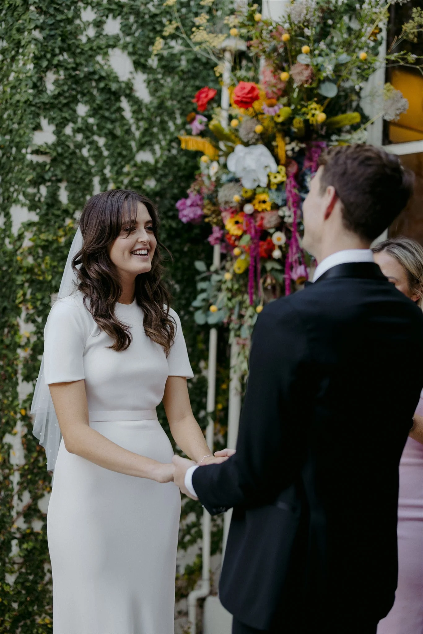 WE’RE GLAD WE… “We both put a lot of effort into our vows, proofread our celebrant Meg’s introduction, and practised our first kiss. To me, this moment was the most ‘wedding’ part of the day, so it calmed my nerves a lot [knowing] how it would proceed (excluding knowing Bryce’s vows). We also danced a lot and spent the majority of the night walking around together to talk to our friends and family.”