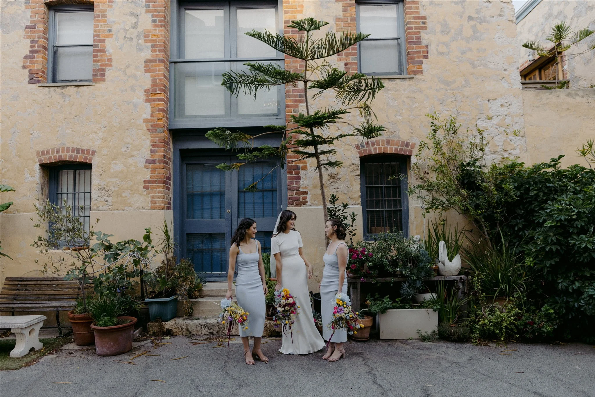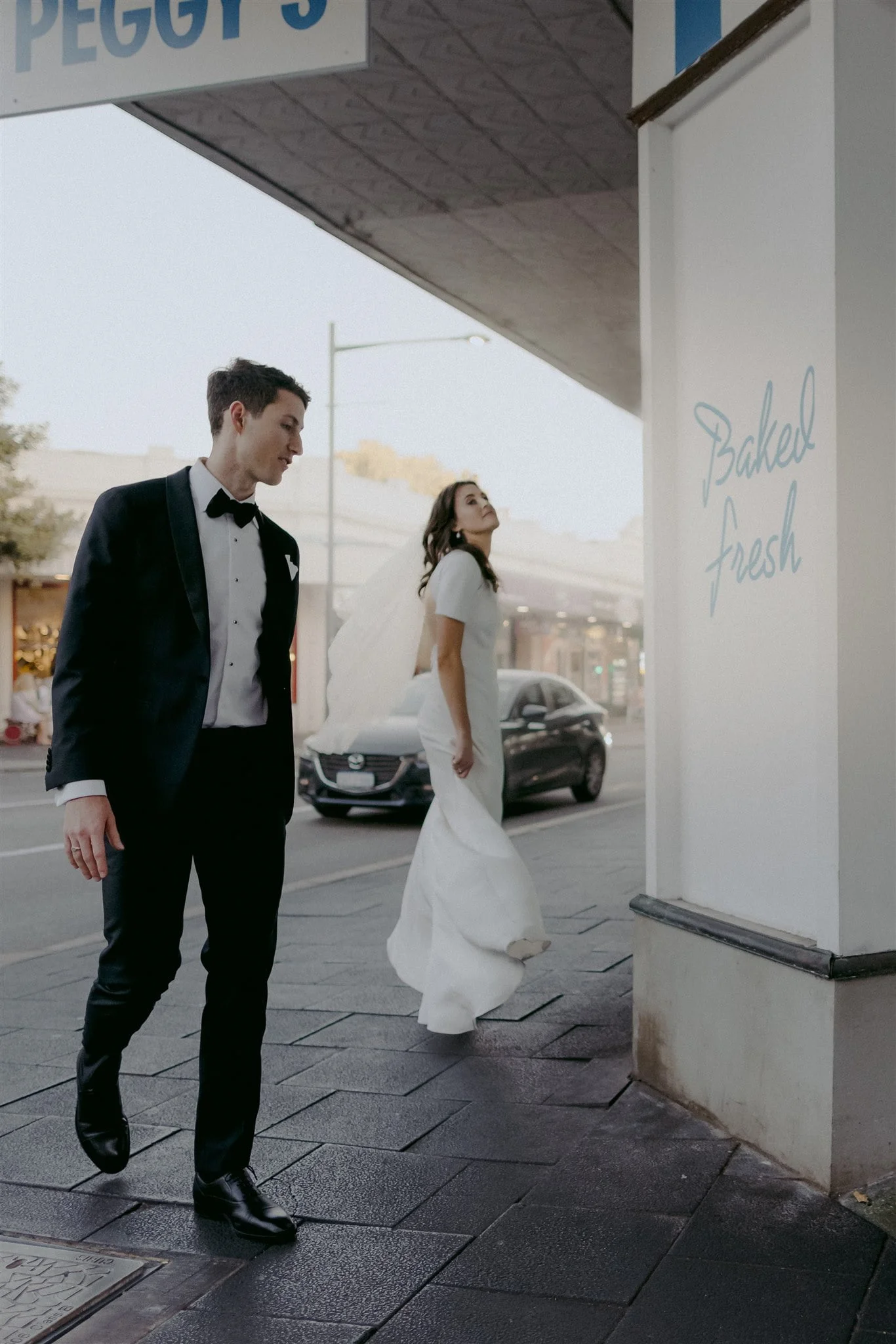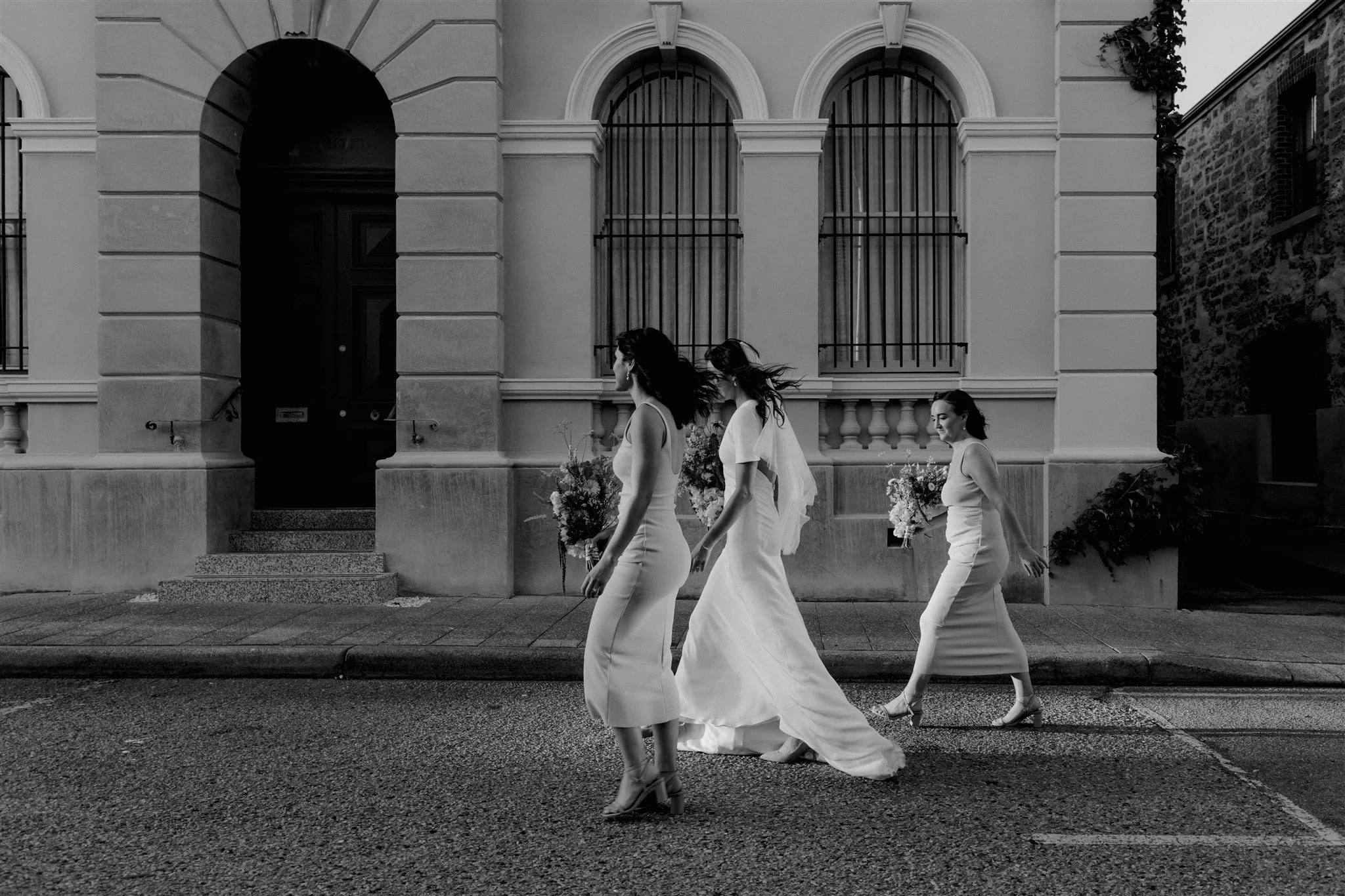 CONTRIBUTING VENDORS Photographer Flossy Photo Event Planner Amelia – Guildhall Event Space Florist The Flowergirl Perth Stationery Bryce Conway (Groom) & Henry King (Friend) Venue & Catering Guildhall Event Space Cake Maker Wild Bakery Lighting Hire JC Festoon Lighting Signage Bridget Pendergast (Bride), Bryce Conway (Groom) & Sticker Mule Celebrant Married by Megs Rings Sarah & Sebastian Entertainment Yon Jovi THE BRIDE Bridal Gown Designer Harriette Gordon Bridal Boutique Noa Bridal Veil Amélie George Shoes Zomp Hair & Makeup The Pretty Parlour Bridesmaid Dresses Bec + Bridge THE GROOM Suit & Pants M.J. Bale Shirt, Cufflinks & Bow Tie P.Johnson Shoes Ted Baker Watch Longines Barber / Grooming Billy Snips – Bloodhound Barbers