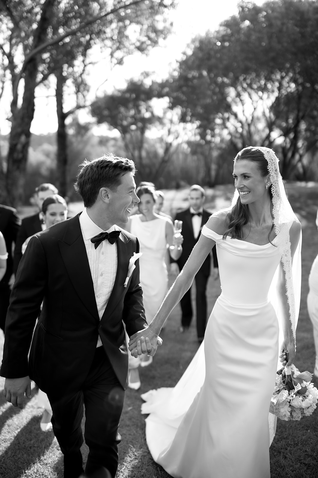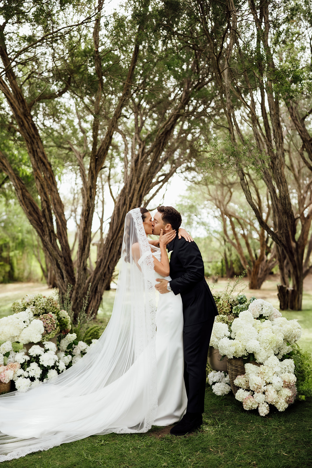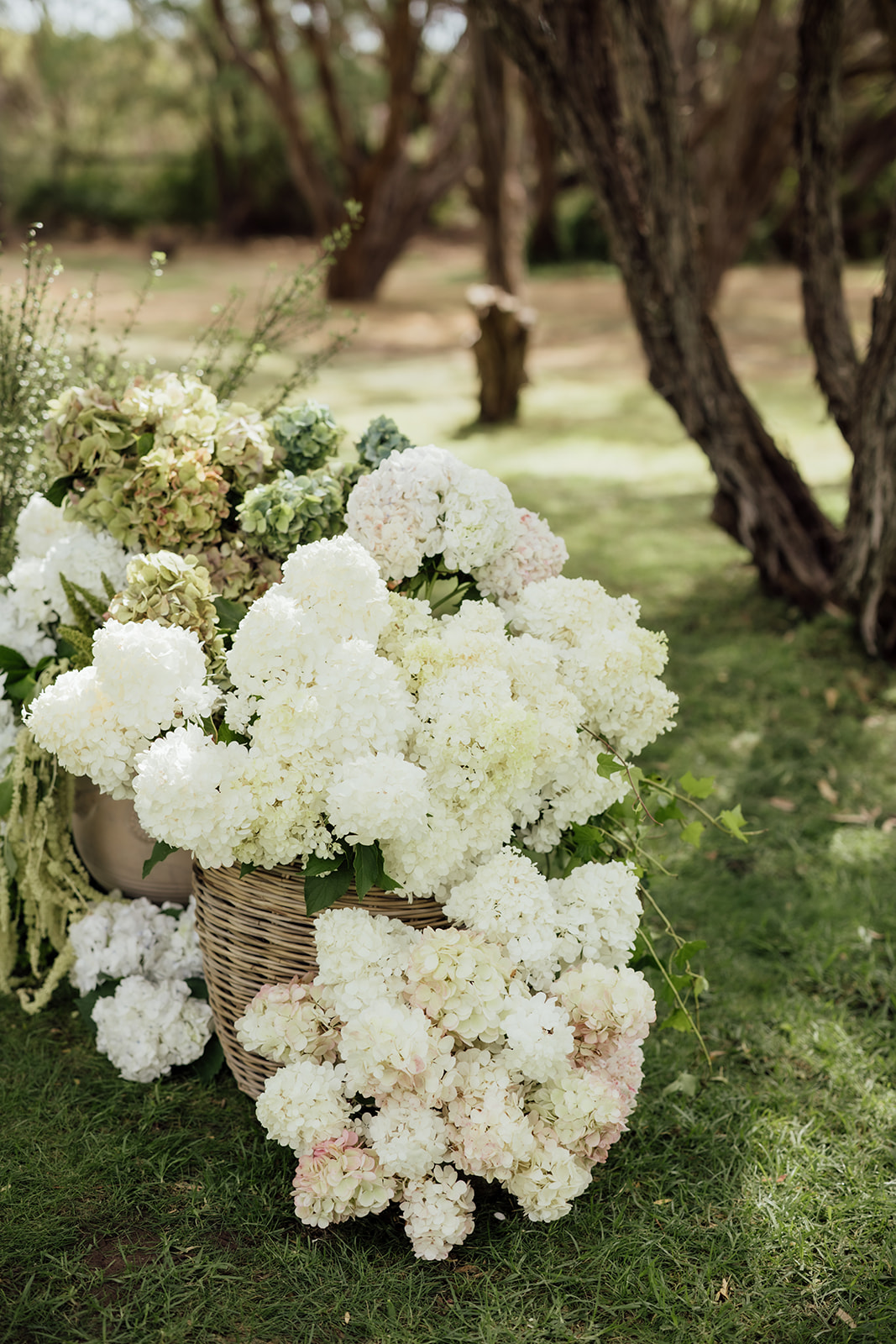 “Hydrangeas were a must for me. We had Estudyo create all our florals, except for the table arrangements. For something a little different, I wanted our seating chart to feel unique, so my sister-in-law Bella and I designed beautiful seating charts that were placed inside hydrangea plants and herbs. Liz captured some stunning photos of this detail, which I’ll always treasure. Bella is the most creative person I know, and she was behind so many of the special touches. She designed our invitations and all of the stationery for the wedding night, as well as some fun details for my hens and our recovery day – like custom pizza box labels that were such a hit. And of course, one of my favourite details came from my mum. She’s famous for her blondies (white chocolate and raspberry slice), so she made some for the wedding and we served them alongside the cake. It was a personal touch and a highlight of the day!”