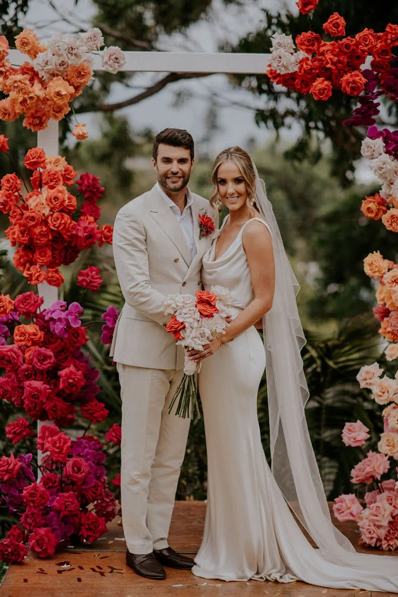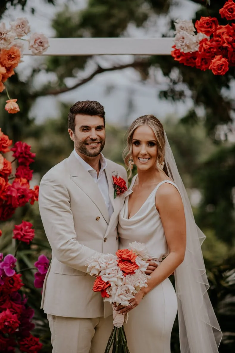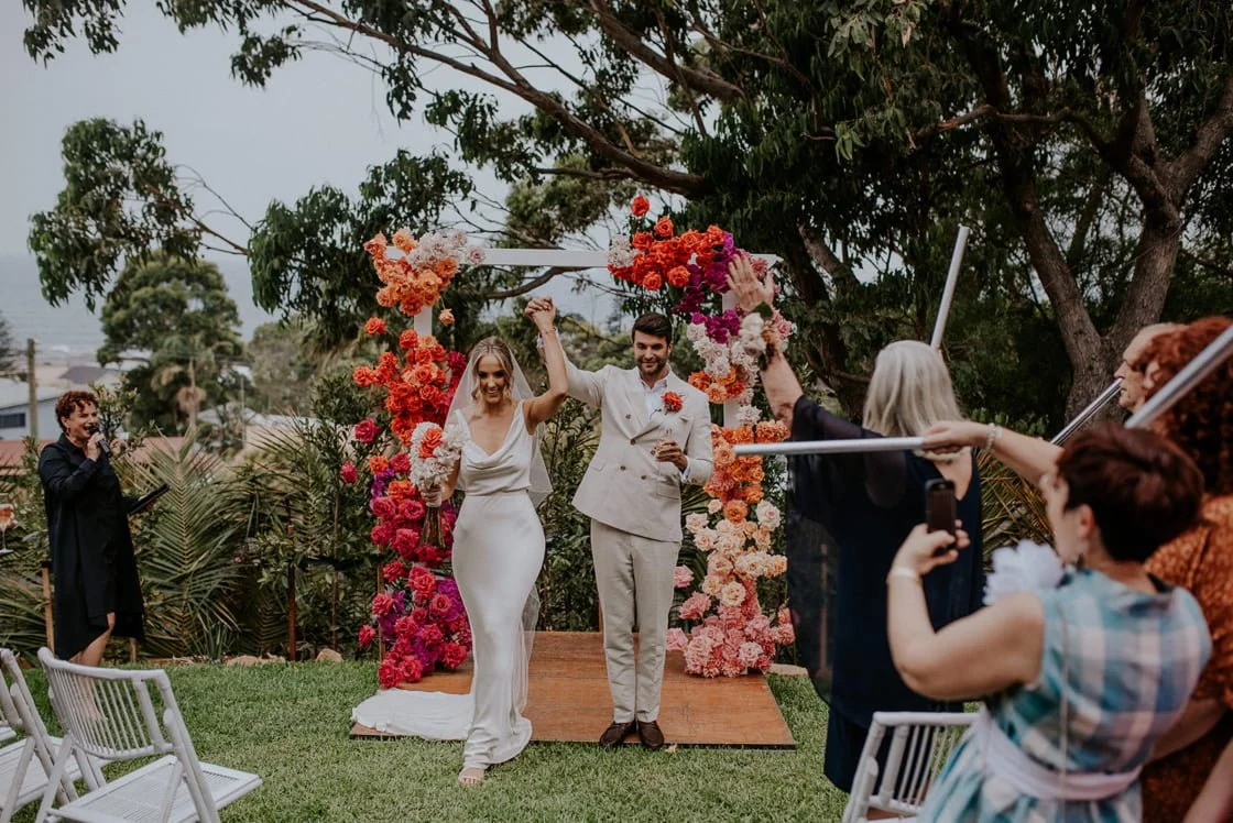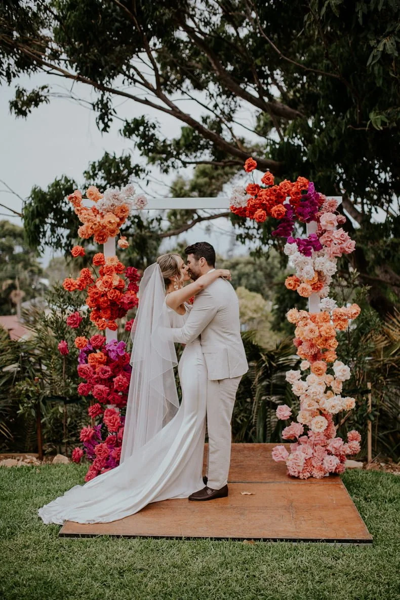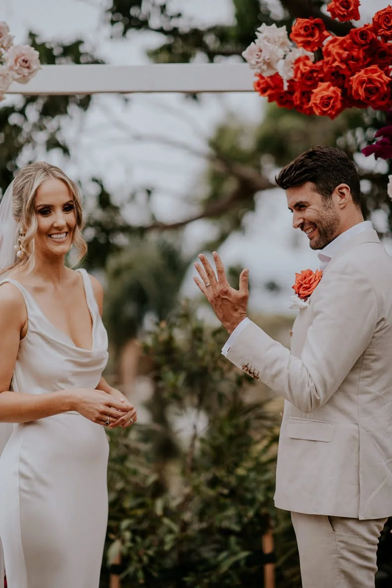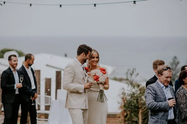 Well, have we got a treat for you this morning, dear readers. One backyard wedding coming in hot! Brigitte and Sam are all about good food and sweet tunes, and where better to get down and boogie but in mum and dad’s backyard? With a dream team of vendors in attendance, this backyard wedding needs to be seen to be believed. Luca Luna went wild with the roses, South Coast Party Hire served up props and lights, and Larsen Jewellery were on rings. The groom was kitted out by our friends over at M.J. Bale whilst Scott Surplice Photography and John Kurt were snapping and recording every moment, all with their signature brand of chill. Enough from us, scroll down to see for yourself…