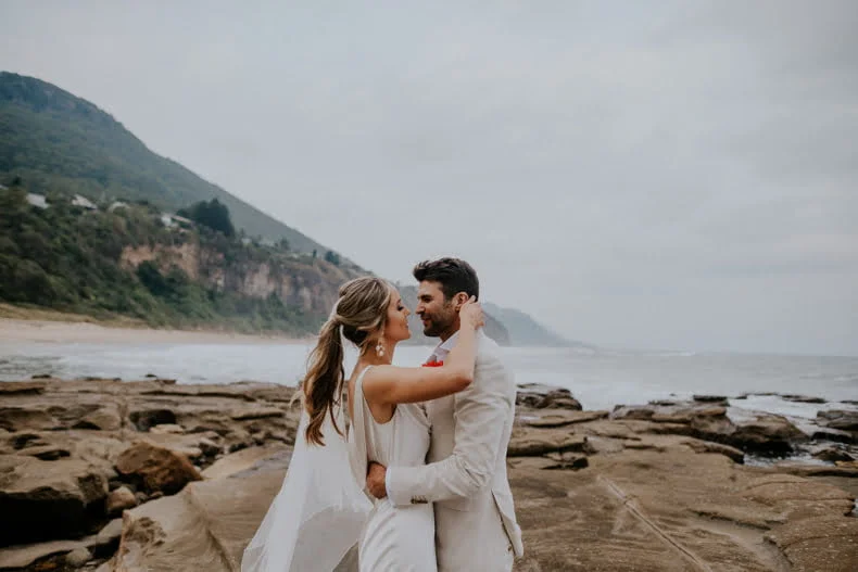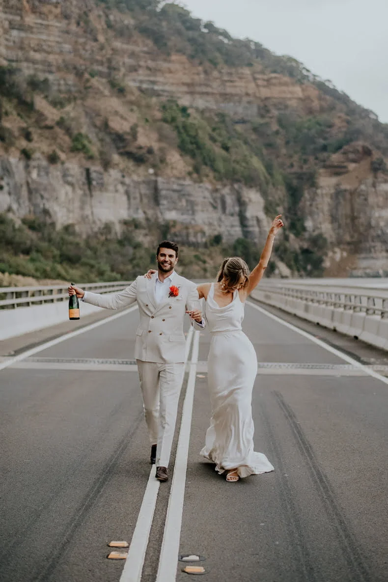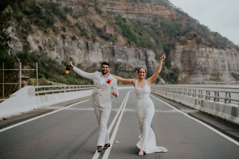 FAVOURITE MOMENT “Our favourite moment was during the photos. We had toyed with the idea of trying to get a shot in the middle of the road on the famous Sea Cliff Bridge, but we were hesitant given that there is generally a lot of traffic, especially in the middle of summer. Nonetheless, we were determined to give it a go! So, off we went champagne in hand, scaling the side of the road and waiting for our moment. We got lucky with a decent break in traffic so we took our chance and we ran for it. We’re so glad we did as the photos were epic! It was a really exhilarating moment for us and we were on a high afterwards. We got the shot!”