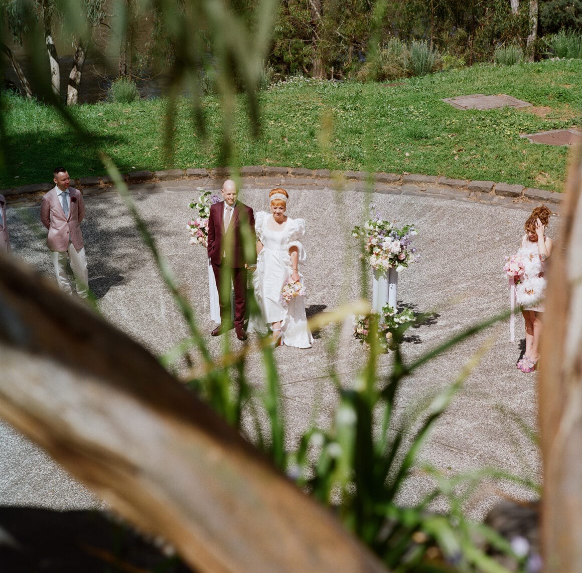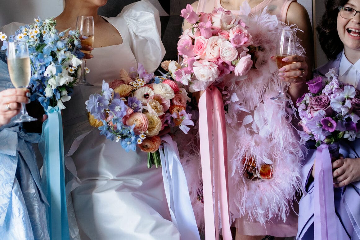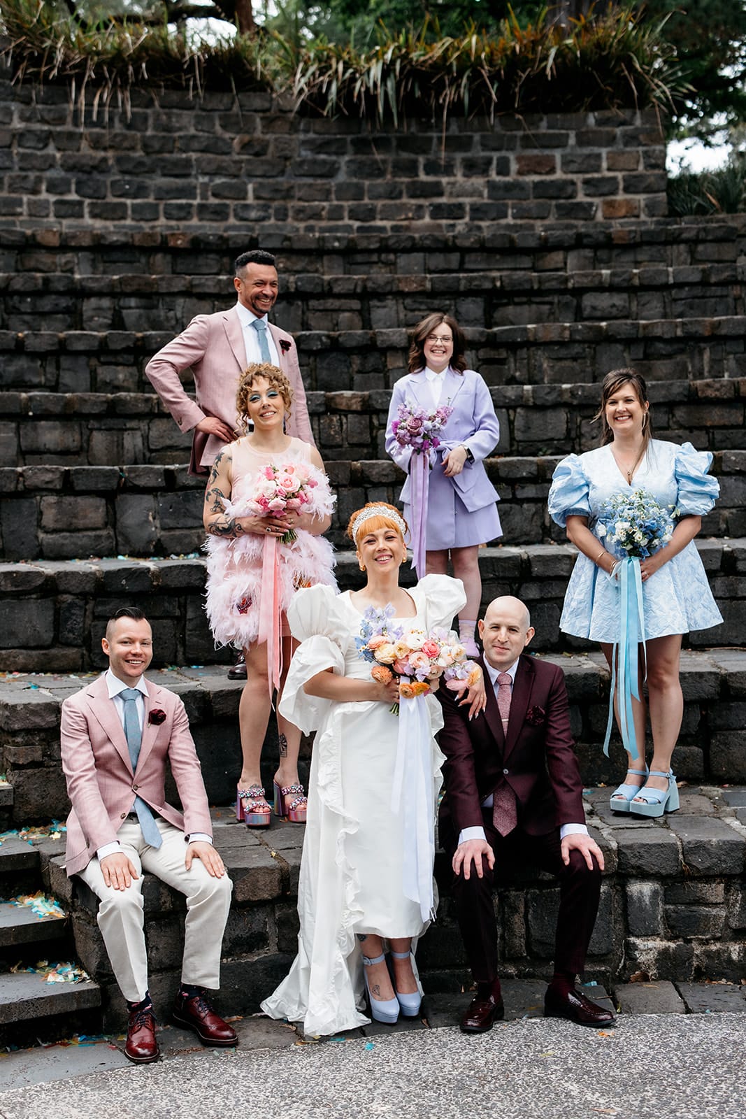 The big day (immortalised thanks to Kinship by Kristy) was a story of retro pastels, “bedazzled delights”, and nods to Joel’s Liverpool heritage. But ultimately, for these two, it was about putting on a damn good party! Brittany’s custom Van Der Kooij frock was “the perfect balance of frou frou glamour and party casual”. Joel also went the custom route, collab-ing with Suitably. Meanwhile, B’s maids rocked a parade of pretty pastels and the groomsmen coordinated in classy M.J. Bale.