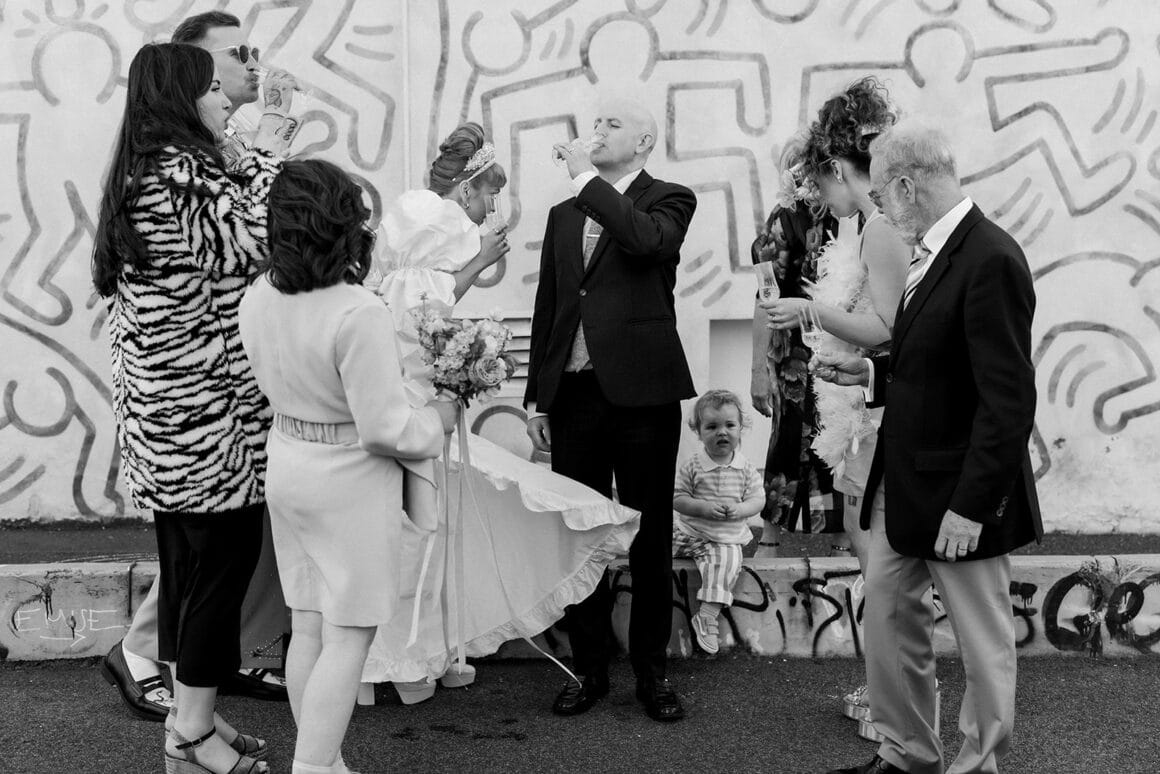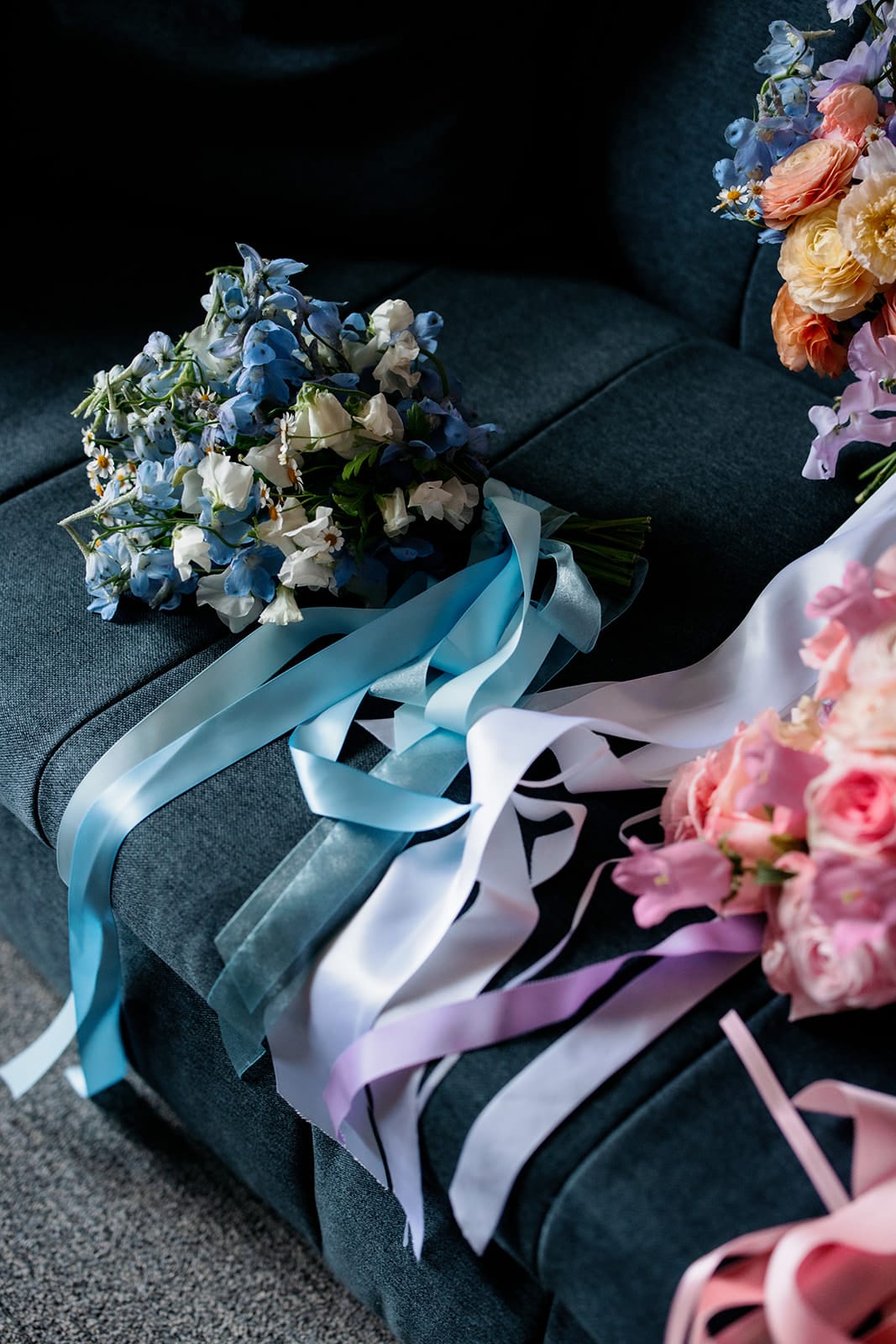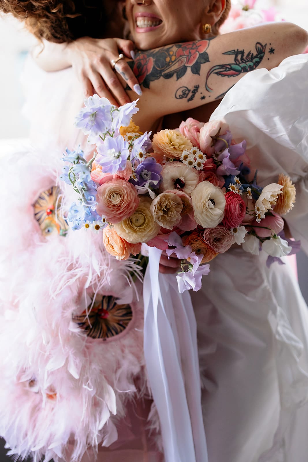 The big day (immortalised thanks to Kinship by Kristy) was a story of retro pastels, “bedazzled delights”, and nods to Joel’s Liverpool heritage. But ultimately, for these two, it was about putting on a damn good party! Brittany’s custom Van Der Kooij frock was “the perfect balance of frou frou glamour and party casual”. Joel also went the custom route, collab-ing with Suitably. Meanwhile, B’s maids rocked a parade of pretty pastels and the groomsmen coordinated in classy M.J. Bale.