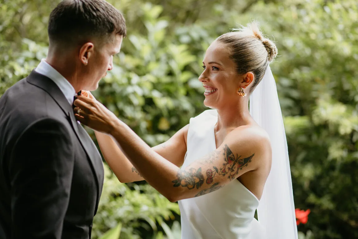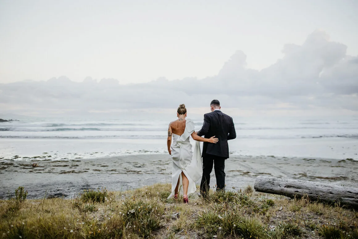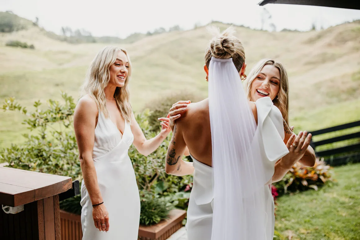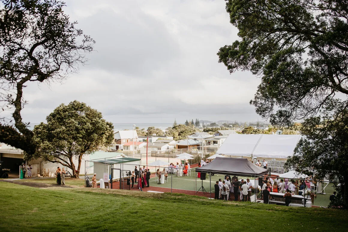 Game, set, matched up for seven years, Brooke and Matt knew “virtually right away” that New Zealand was where they wanted to wed. Quaint Waihi Beach caught their attention, but limited local locations had these cool cats thinking outside the box and onto the court. “One of our friends mentioned the local tennis court might work if we wanted to do a DIY event with marquees, etc. When we went to look at the tennis courts, they were actually so perfect, a nice flat surface tucked into the bushland with an ocean view!”