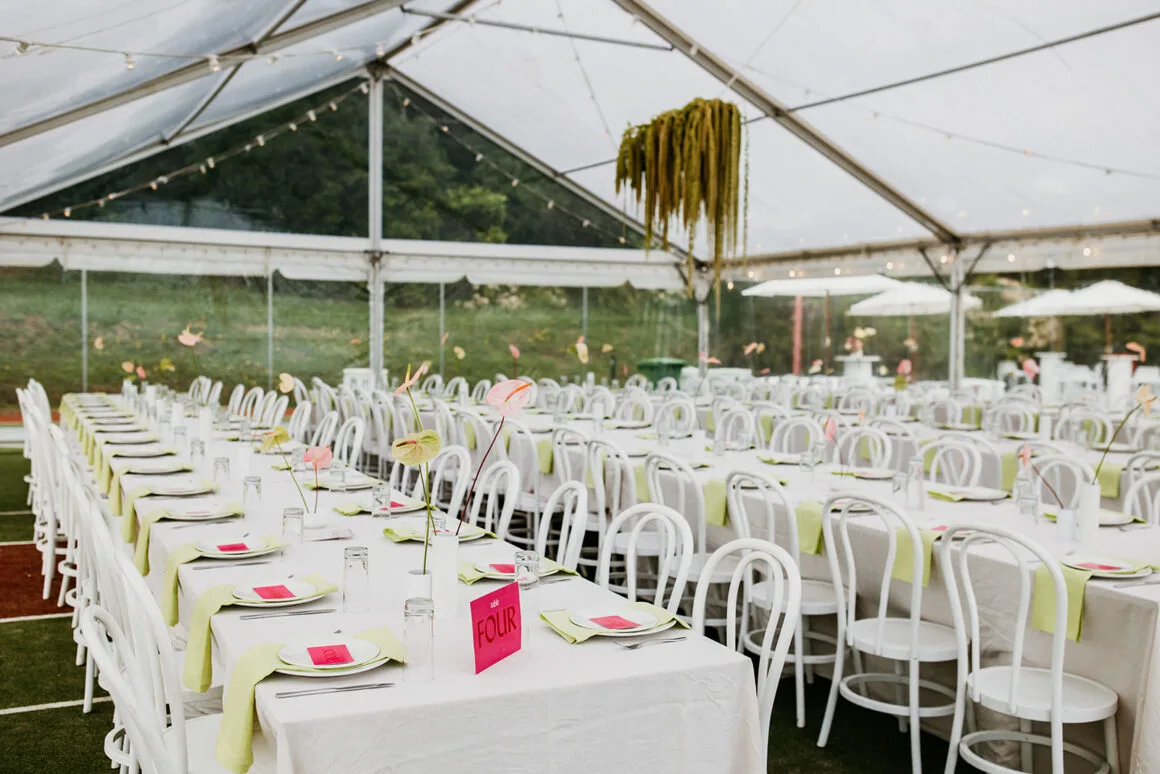 THE VIBE (Brooke) “I used the tennis court aesthetic for a bit of inspiration and decided to combine the lime green accents with natural greens, bright pink and red tones. It sounds like a lot but it really worked, as we were surrounded by beautiful grass, trees and the burnt orange tennis court floor. [These colours] flowed into our theme for the flowers as well, so it all tied together nicely. We wanted the wedding to feel like a giant garden party, but with a bit of extra personality. I love bright colours and fun disco vibes, so we leaned into that.”