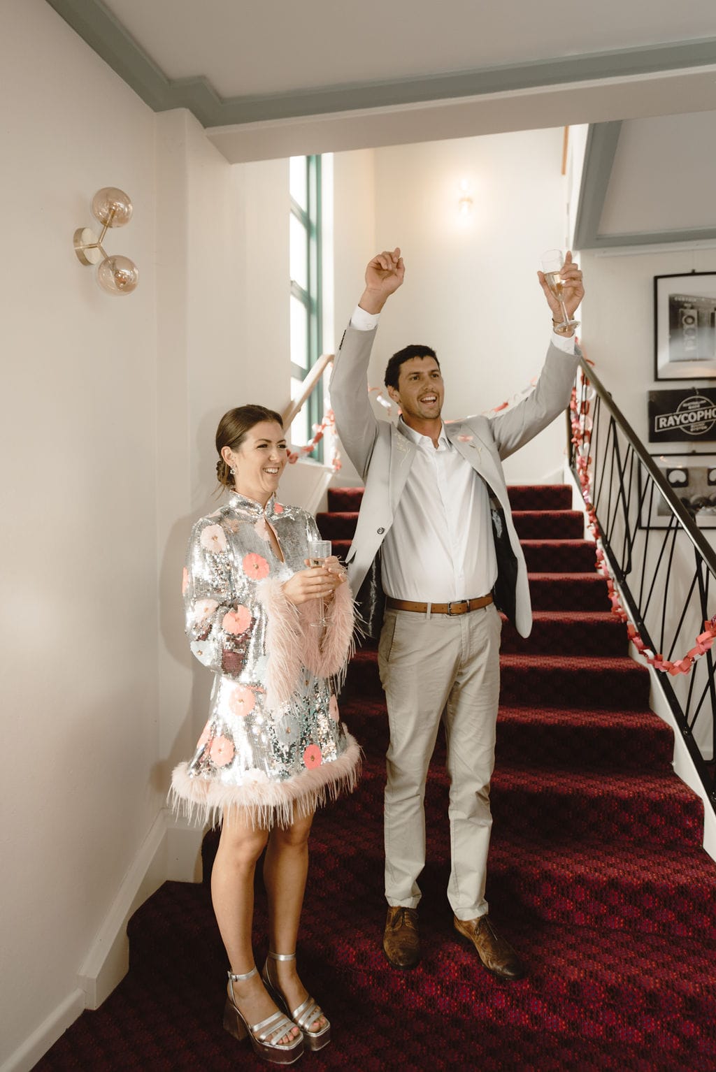 “… got married with no crowd at the registry, followed by a beautiful dinner at Gimlet in Melbourne. We were relaxed, loved up and spent every moment together. [For the ‘after party’, we’re] so happy we had a cup noodle bar! As cool and colourful as they looked, they were the perfect late-night snack for everyone and such a novelty. Noodles on the dancefloor were a vibe! [Lastly, that] we flew out for our honeymoon the next night, which was very old school of us and the best way to decompress. Again, with a lot of wonderful help to make it happen!”