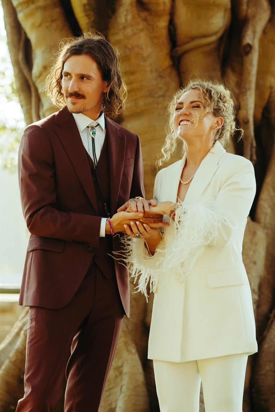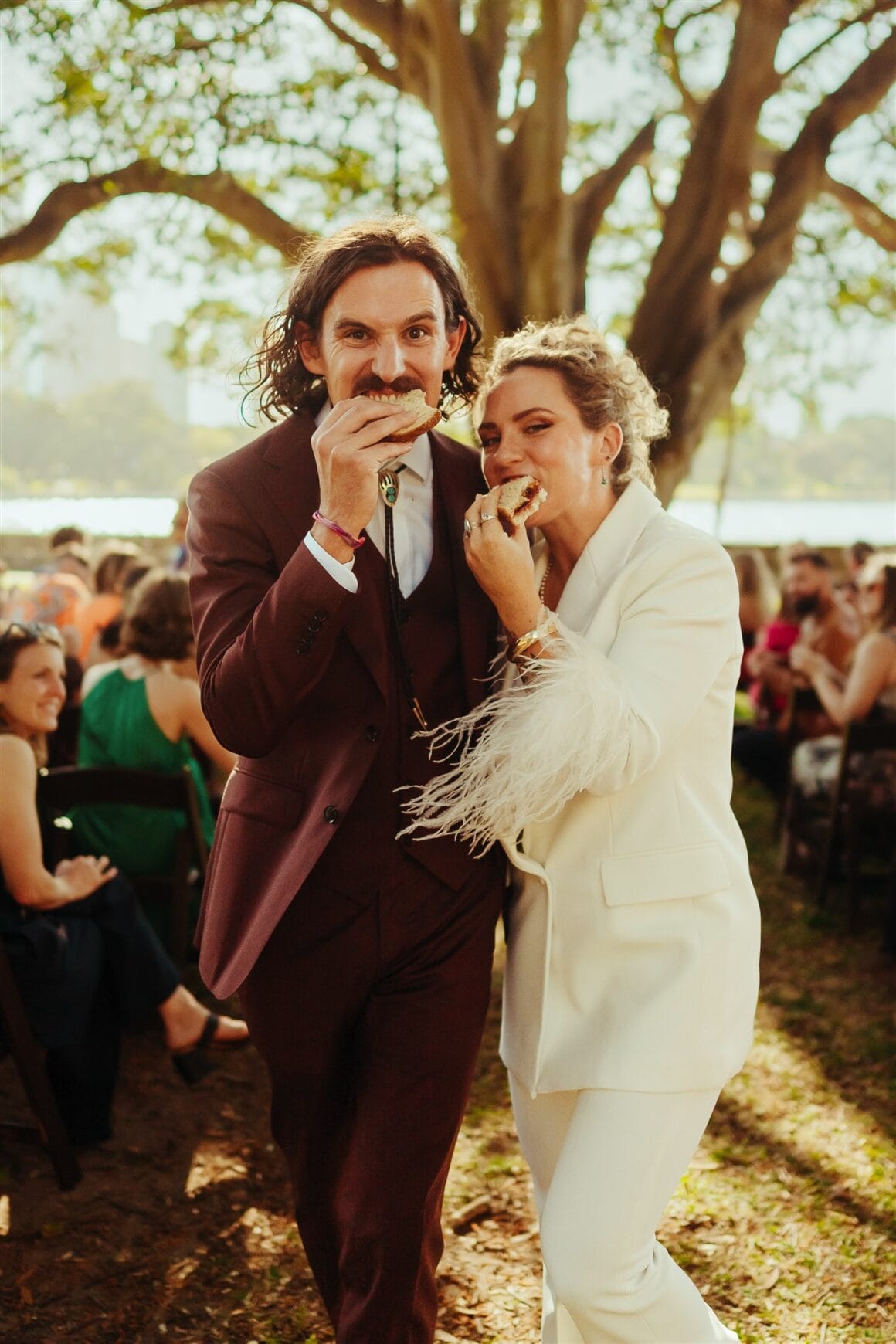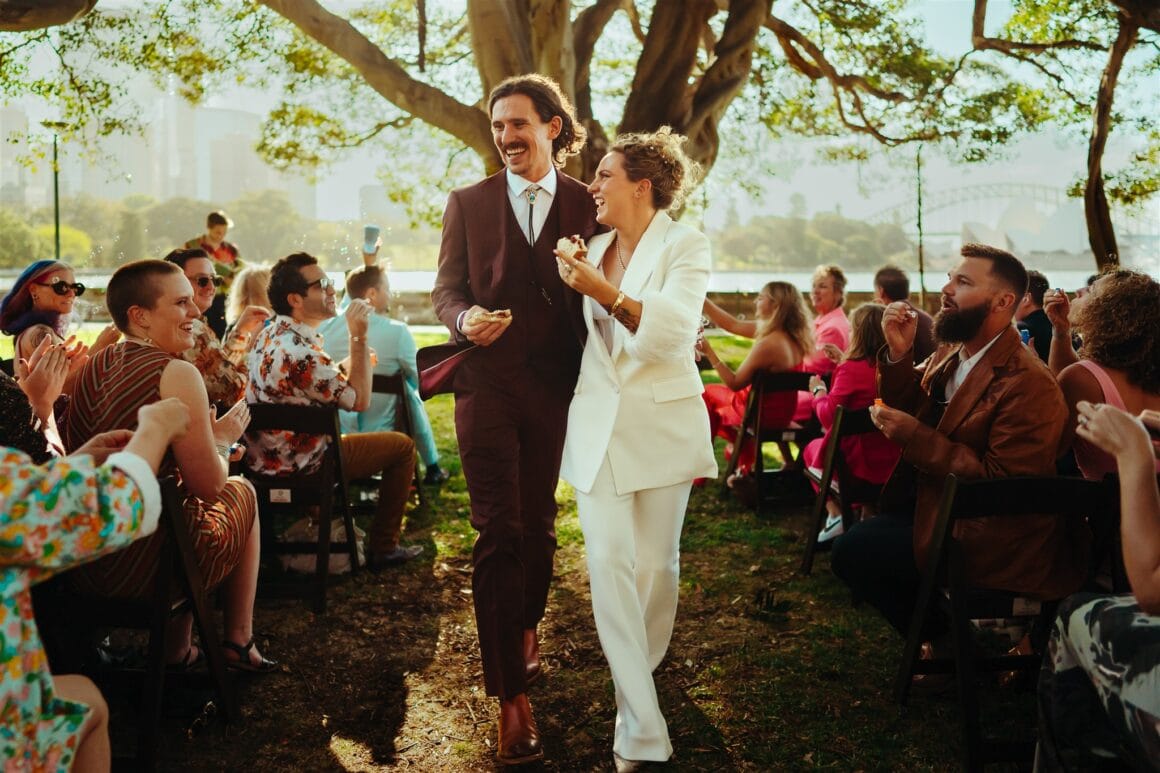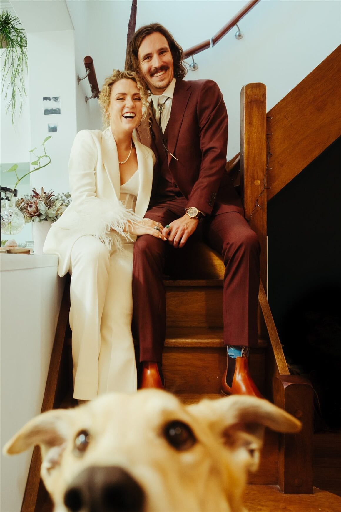 Carrie and Matt are proud as punch of their retro-inspired, “weird”, and “unique” wedding, which first appeared in the Real Wedding Special. What makes it “weird and unique”, you ask? Well, maybe because the ceremony, hosted at Sydney’s Botanic Gardens, kicked off with the theme song from Jurassic Park. Perhaps it was the ‘unity sandwich’ the couple made during their vows. Or maybe it’s the fact that the groom actually found Carrie’s kick-ass bridal pantsuit!
