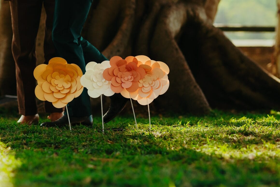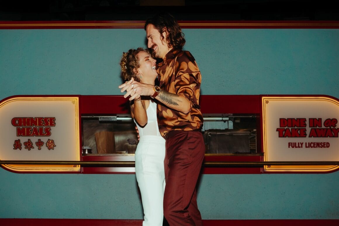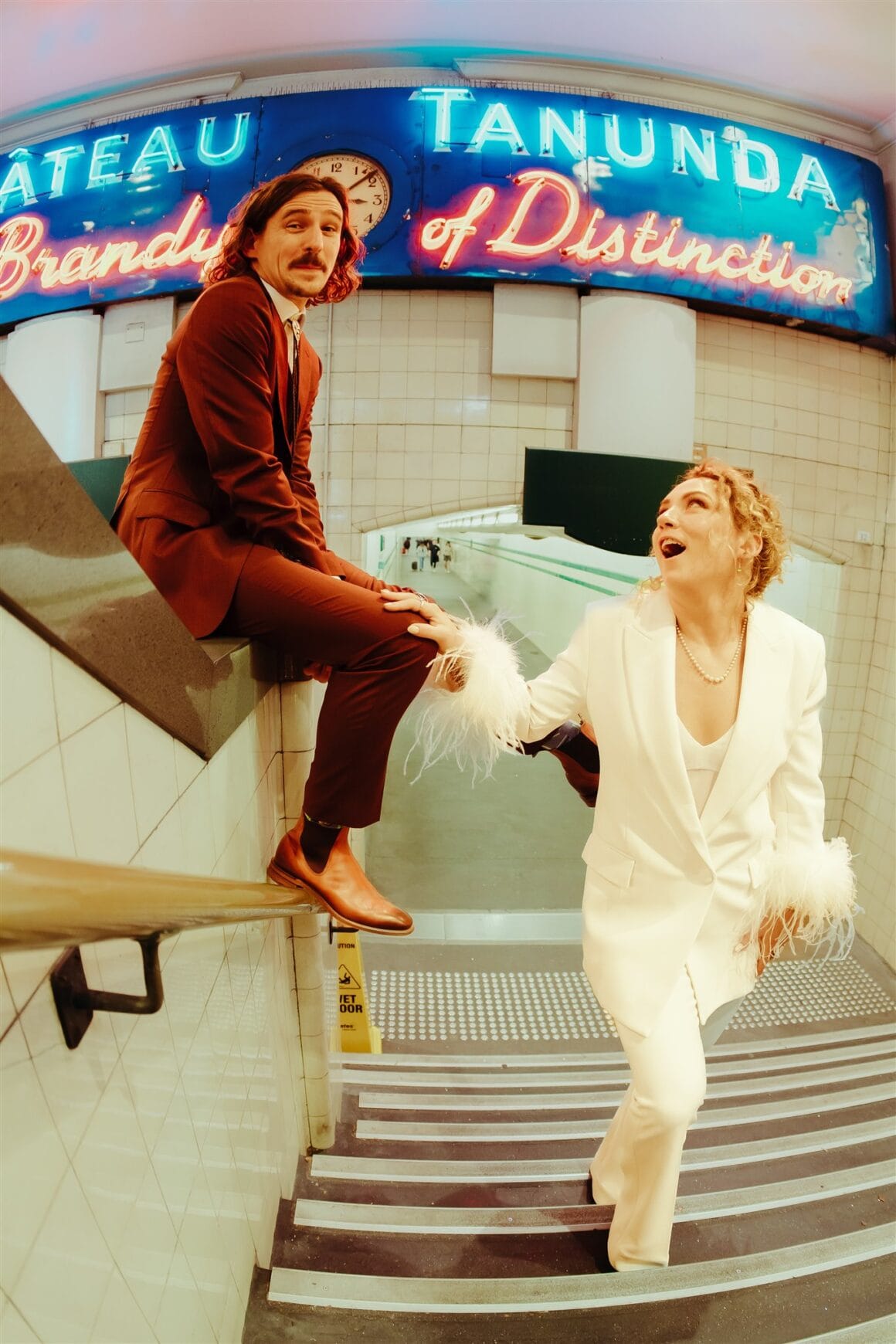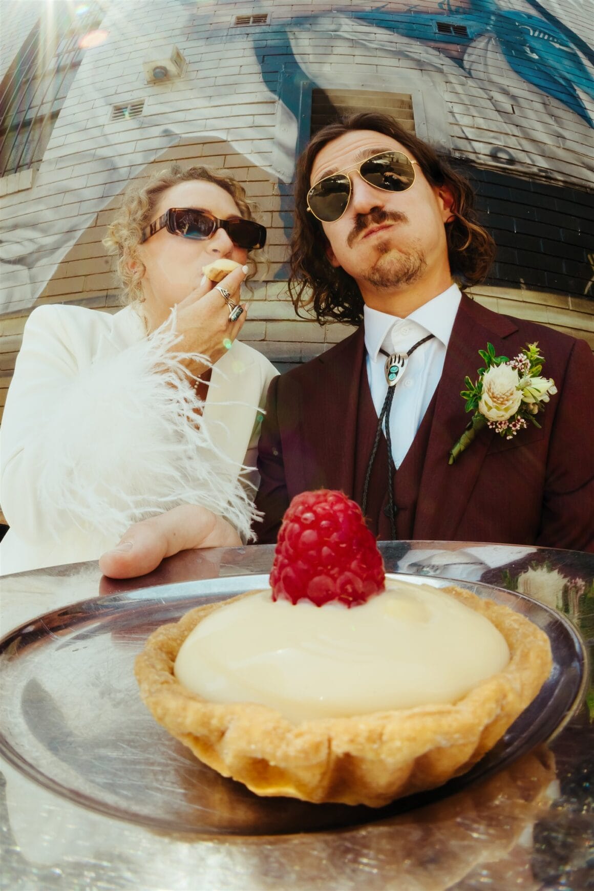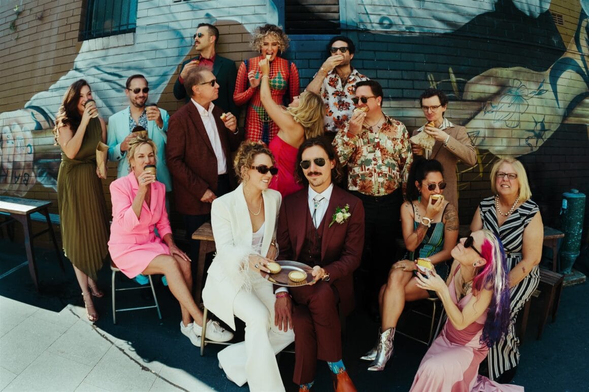 Carrie and Matt are proud as punch of their retro-inspired, “weird”, and “unique” wedding, which first appeared in the Real Wedding Special. What makes it “weird and unique”, you ask? Well, maybe because the ceremony, hosted at Sydney’s Botanic Gardens, kicked off with the theme song from Jurassic Park. Perhaps it was the ‘unity sandwich’ the couple made during their vows. Or maybe it’s the fact that the groom actually found Carrie’s kick-ass bridal pantsuit!