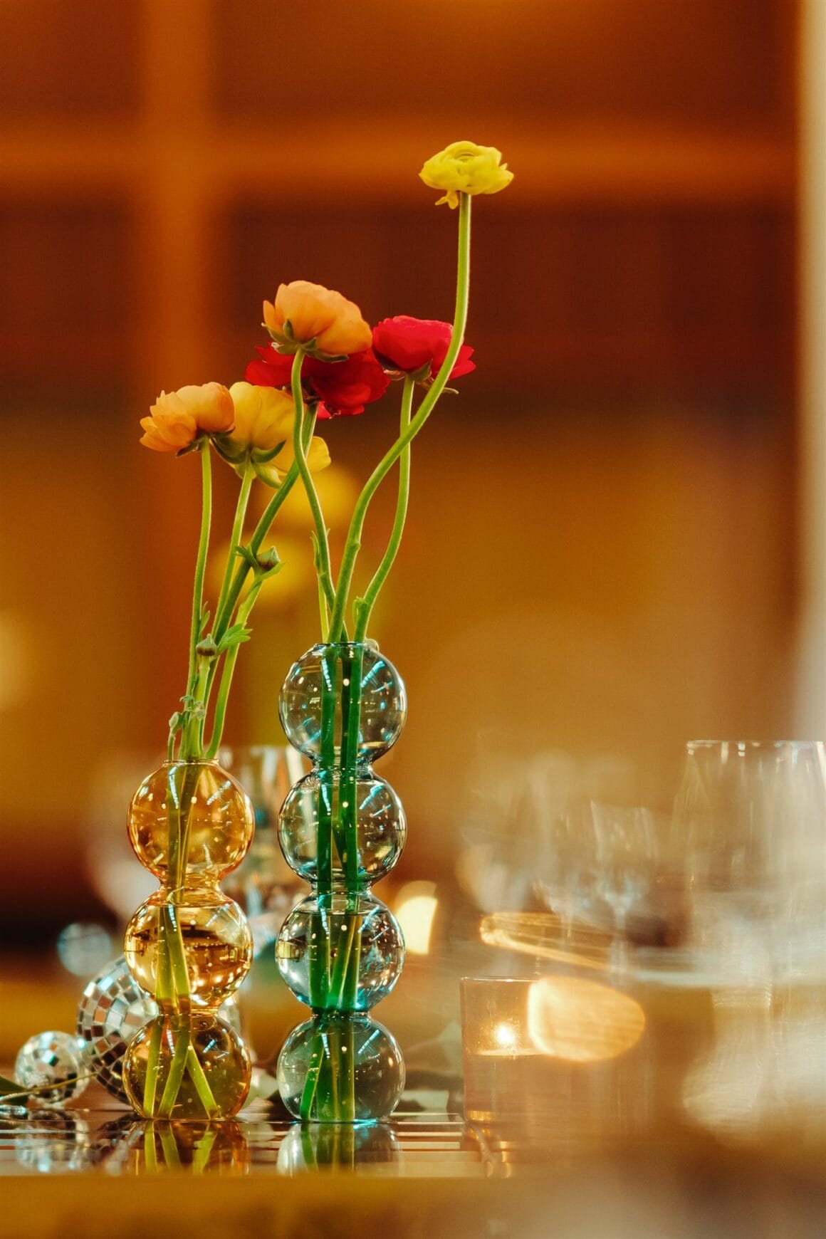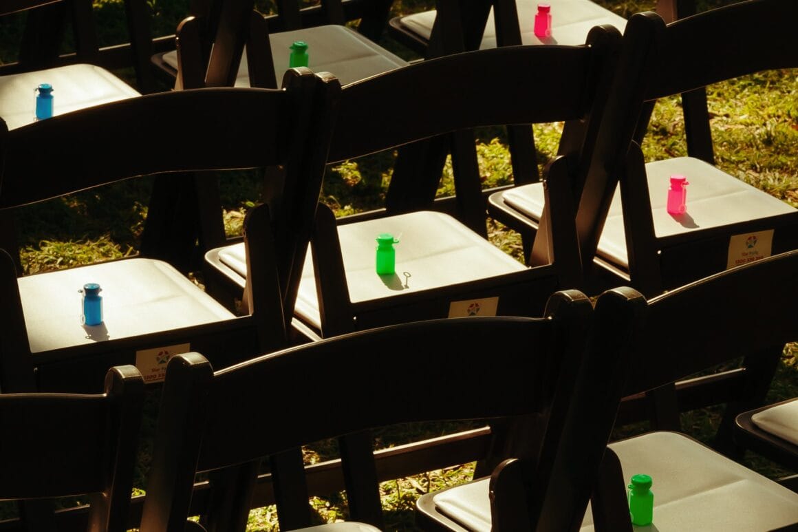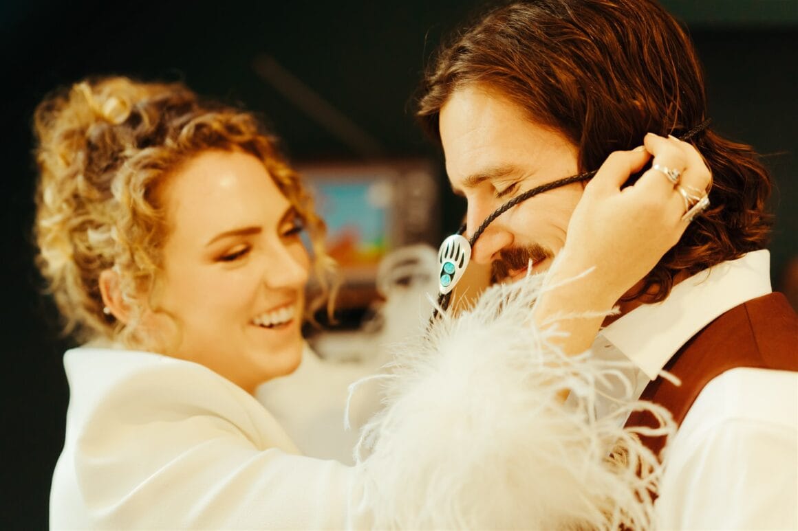 THE VIBE “I got some great advice from a friend after we got engaged: ‘Make a list of everything you hate about weddings, and start working backwards from that’. Thanks for that, Derek! Carrie and I really disliked long weddings, impersonal weddings, weddings where the bride and groom look like they’re trapped inside their own machine. We also wanted something unique and timeless, so we settled on making our wedding ‘retro-inspired’. Bell bottoms, long lapels, disco balls, and lots of sparkles.”
