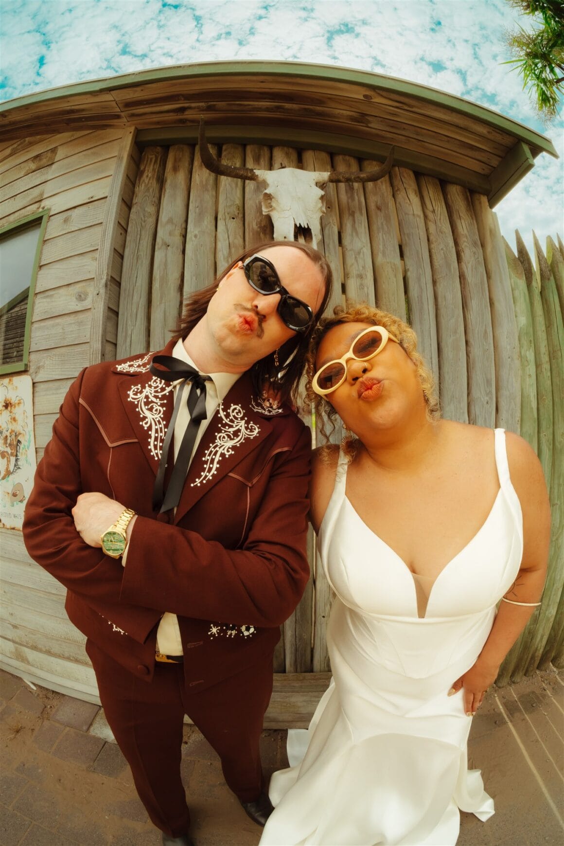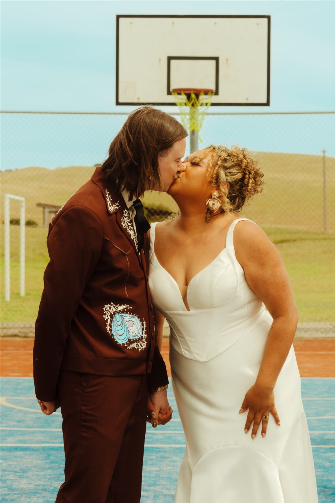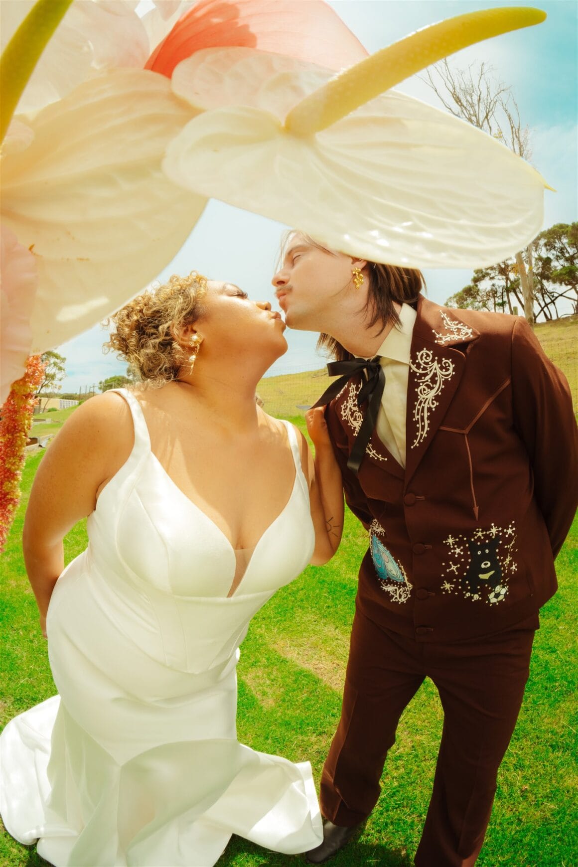 “Once I thought about the idea of custom embroidered designs, I went with Reigner. I wasn’t meaning to go full cowboy theme, but it just so happened that Reigner’s rhinestone cowboy vibes also tied in well with our wedding venue at the Ranch. The design phase was the most exciting. I chose to have designs of my dog Billy, an oyster with a pearl (referencing the pearl farm visit in Broome the day we got engaged) and a Nightcliff jetty sunset (Chantelle and I spent a lot of time watching this sunset together when we lived in Darwin together for a few months).”