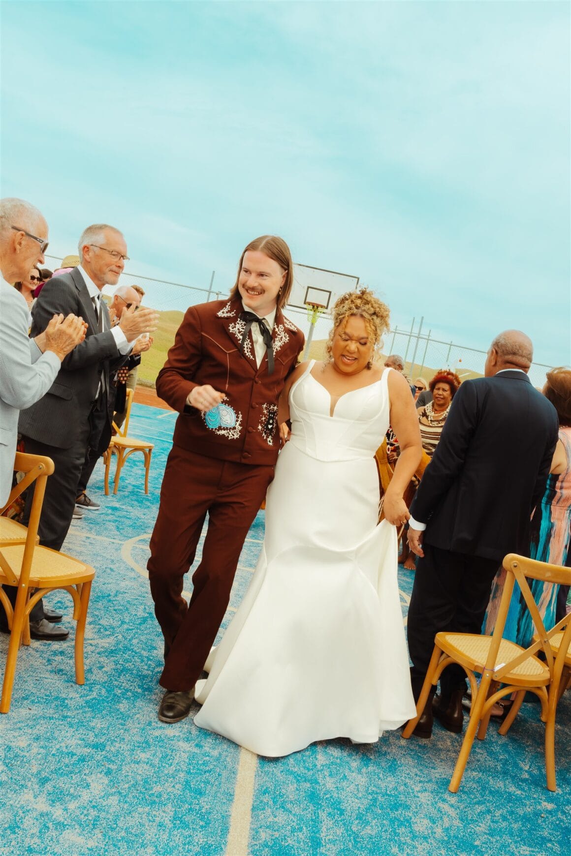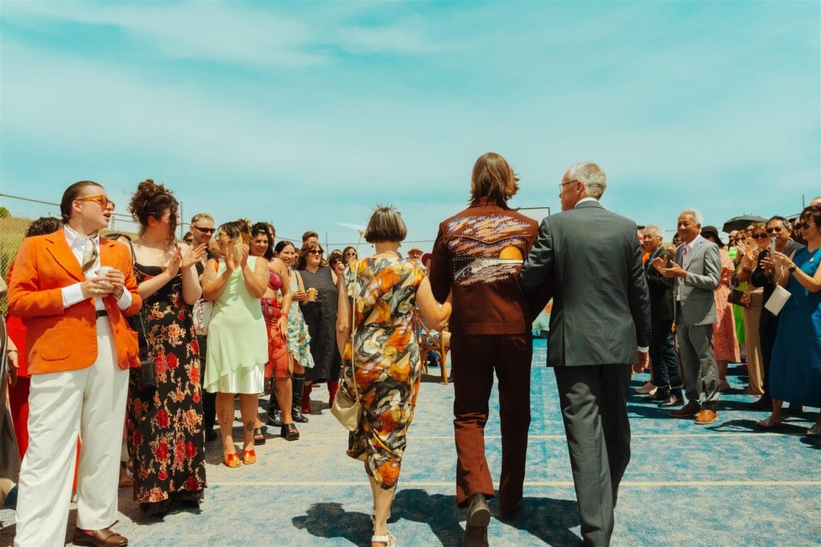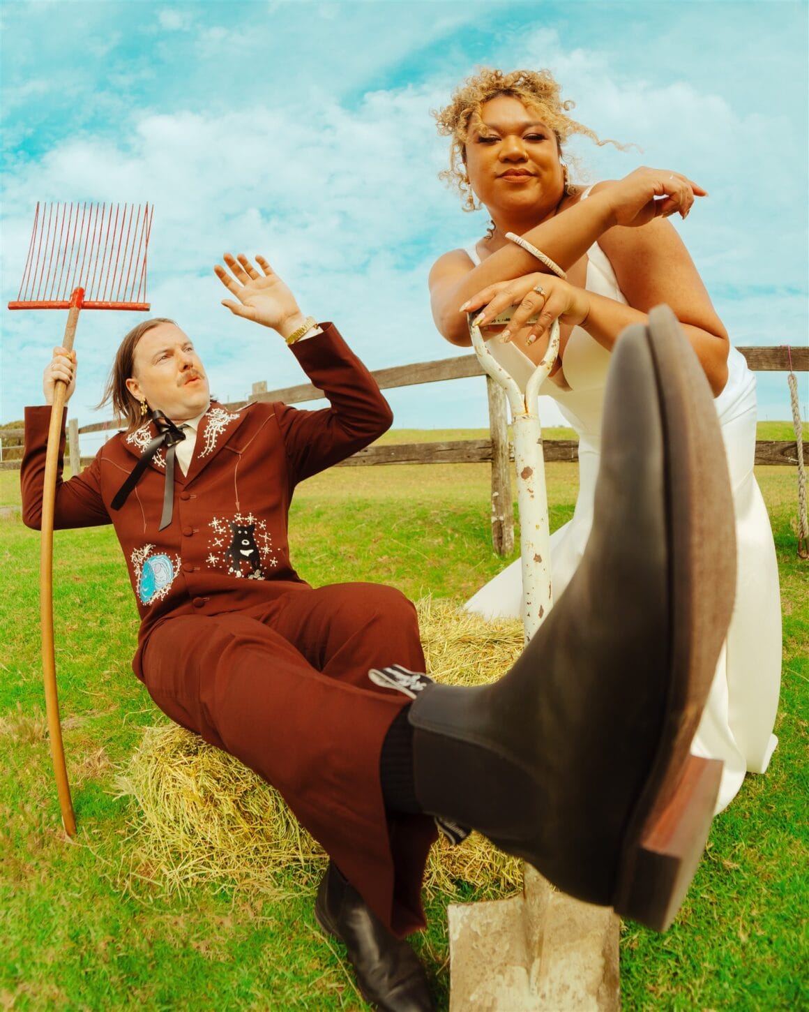 “Once I thought about the idea of custom embroidered designs, I went with Reigner. I wasn’t meaning to go full cowboy theme, but it just so happened that Reigner’s rhinestone cowboy vibes also tied in well with our wedding venue at the Ranch. The design phase was the most exciting. I chose to have designs of my dog Billy, an oyster with a pearl (referencing the pearl farm visit in Broome the day we got engaged) and a Nightcliff jetty sunset (Chantelle and I spent a lot of time watching this sunset together when we lived in Darwin together for a few months).”