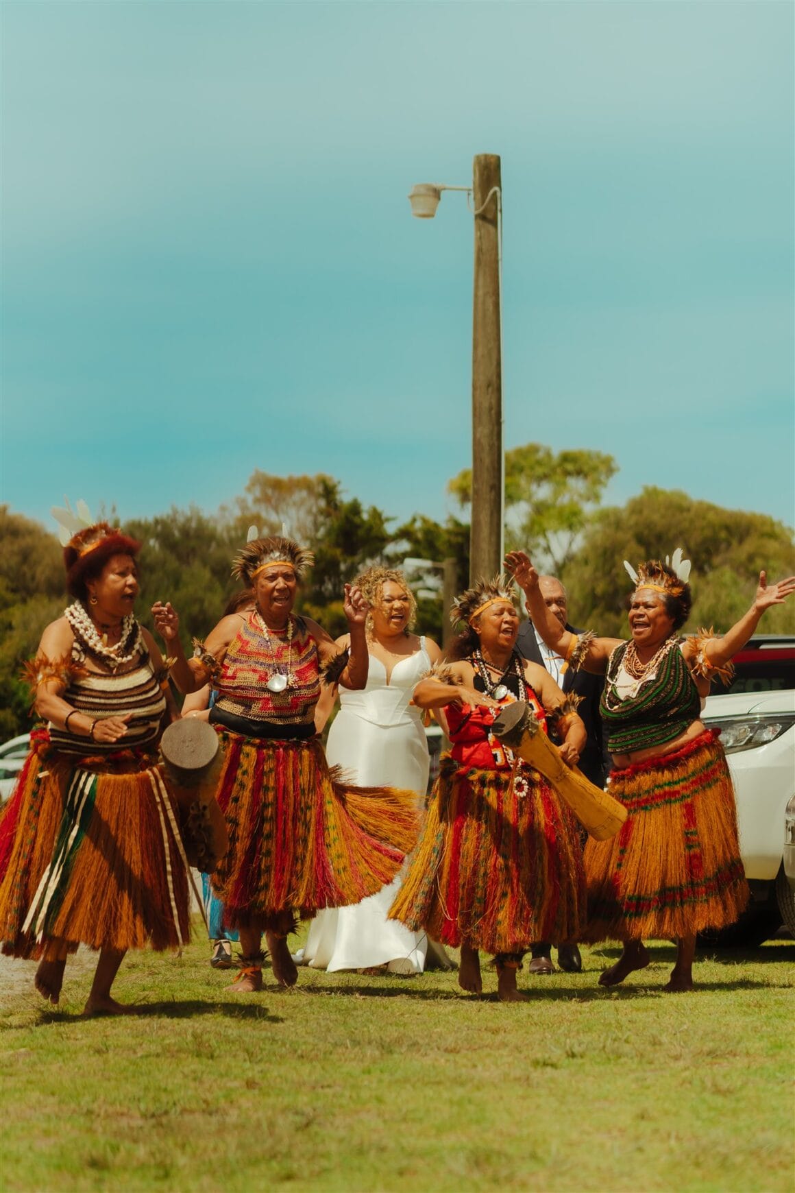 “So many cultural customs were part of our whole weekend! We started our wedding festivities with the ‘Door Games’ on the day before. Keeping on with traditions from my Singaporean culture, Michael and his ‘brothers’ – a group of his besties, arrived at the place my parents were staying to undergo a series of challenges hosted by my family. Later that afternoon, we met all our guests at the ‘barn’, a cosy wooden hall at The Ranch, for our Chinese Tea Ceremony. This is a tradition where we pour tea [for] our family and honour our elders to celebrate our families uniting. On the wedding day, weaving in my Papua New Guinean heritage, I asked my aunties to perform a traditional singsing ahead of us, as my parents and I made our way down the aisle. It was such a moving experience hearing them sing traditional PNG wedding songs and dance in grass skirts with kundu drums. Finally, we knew we wanted to bring one of our favourite Singaporean customs to our wedding: The Yum Sing toast. Picture everyone yelling as loud as possible, for as long as possible, ‘Yuuuuuuuum’ until blue-faced and desperate. Then finally, just as we hit the crescendo of voices in unison, we yell ‘Sing!’ and cheers to drink.”