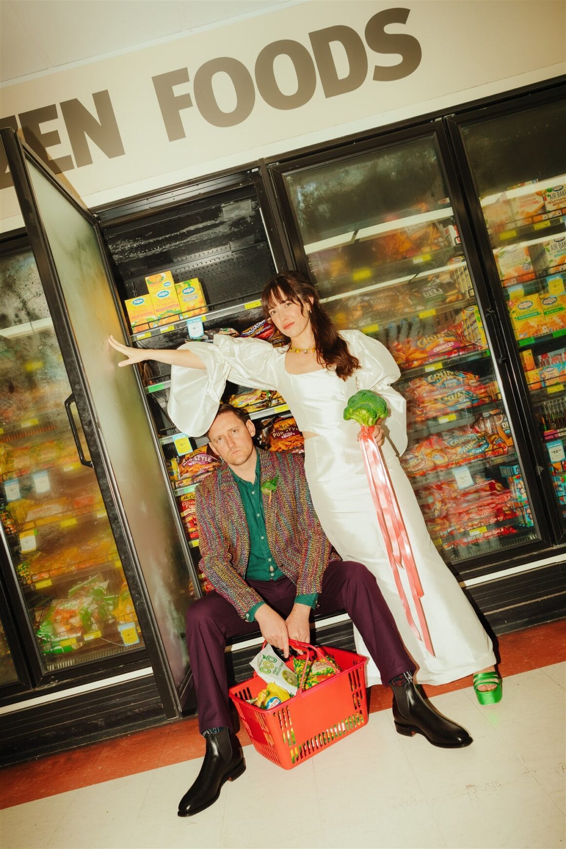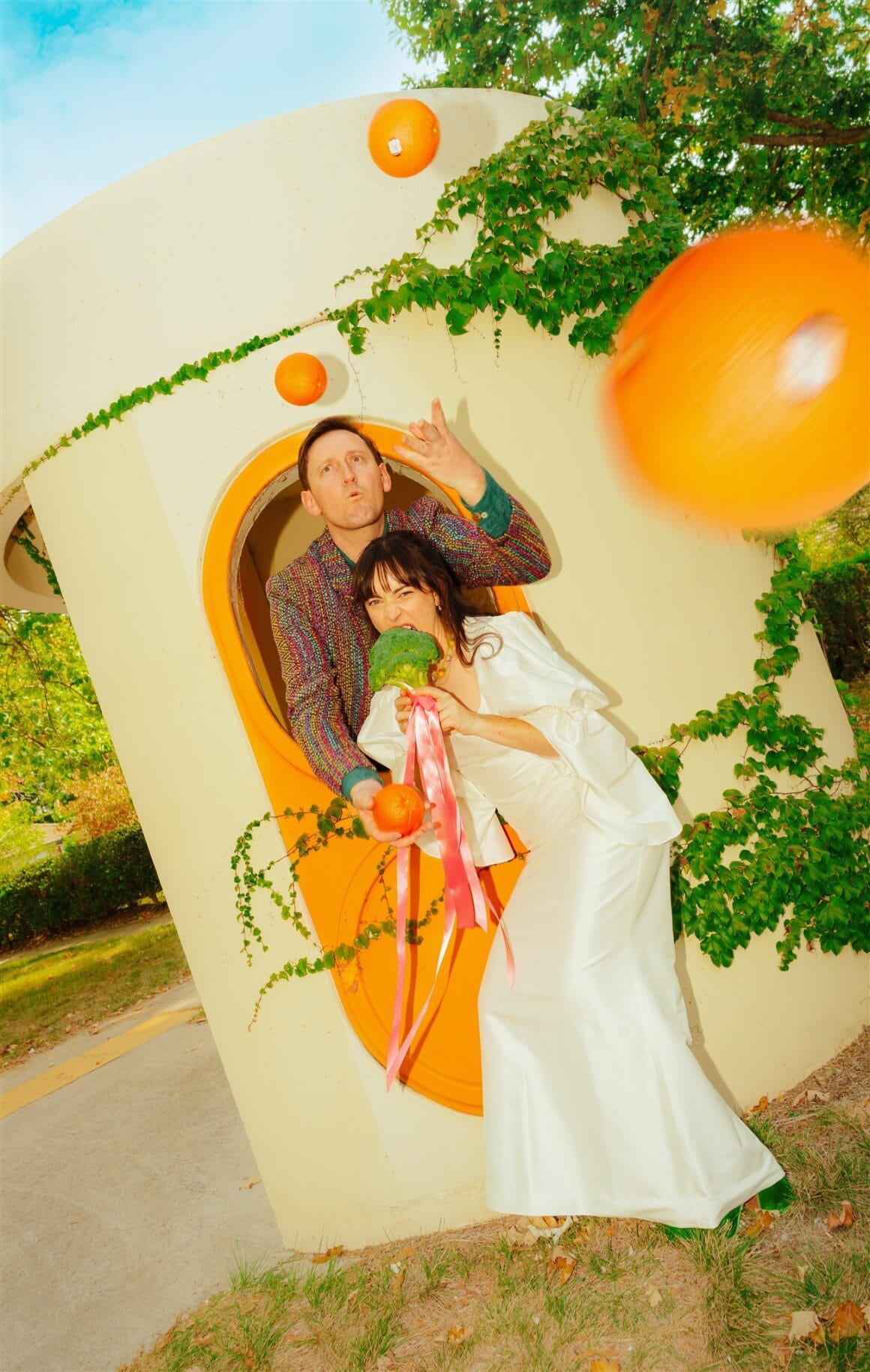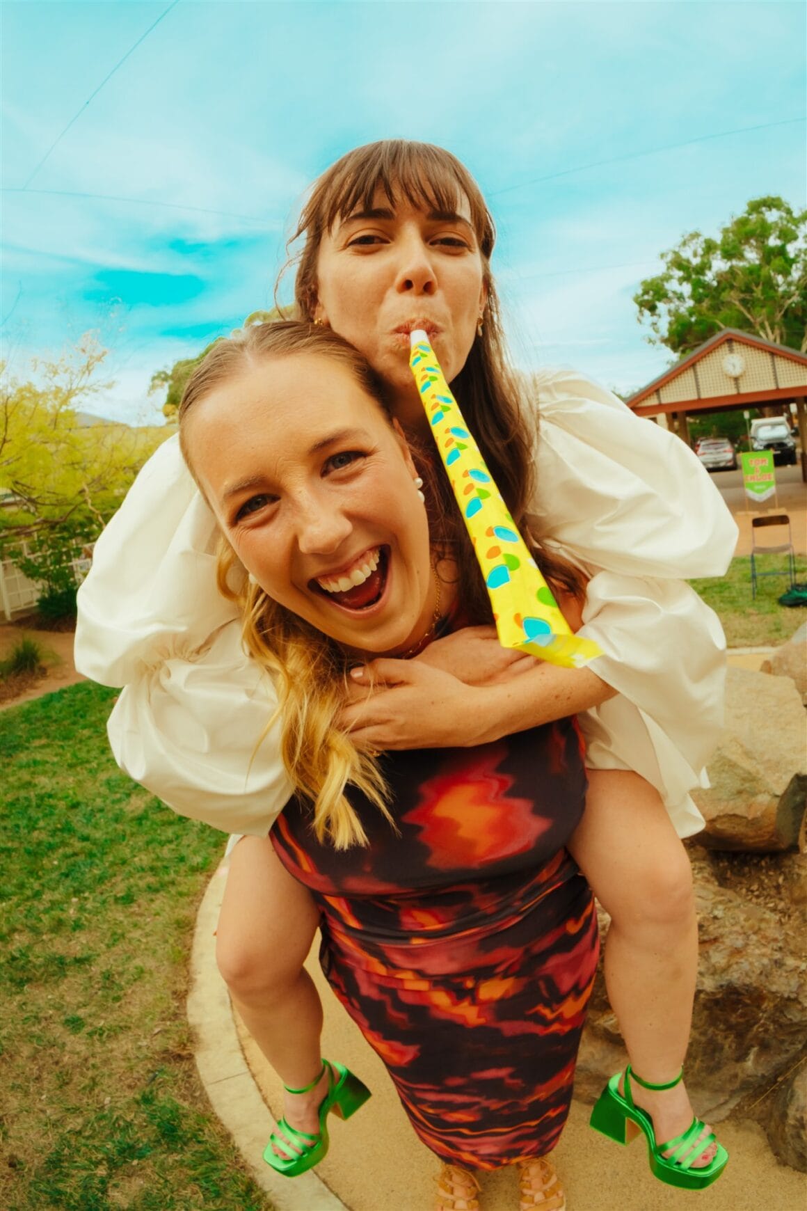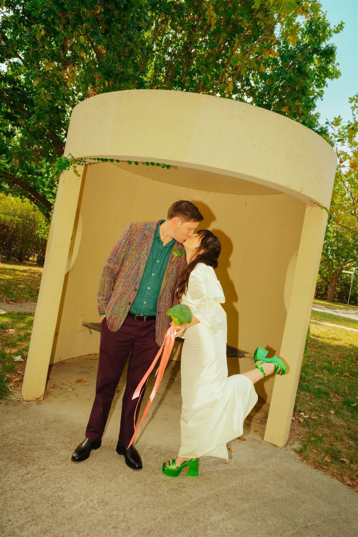 Chloe and Tom, who first locked eyes in a Sydney karaoke room, really know how to think outside the box. It’s why we’re OBSESSED with their quirky Canberra nuptials. Guests dressed in their finest ‘fresh and juicy’ attire to see their union at Bicentennial Square. The groom had always dreamt of wearing something from Joe Bananas, and his own wedding seemed “like a good time to splash out”. Meanwhile, our bride wore Van Der Kooij for the formalities before switching into a fun party frock that she actually made herself using an “eclectic collection” of secondhand textiles.