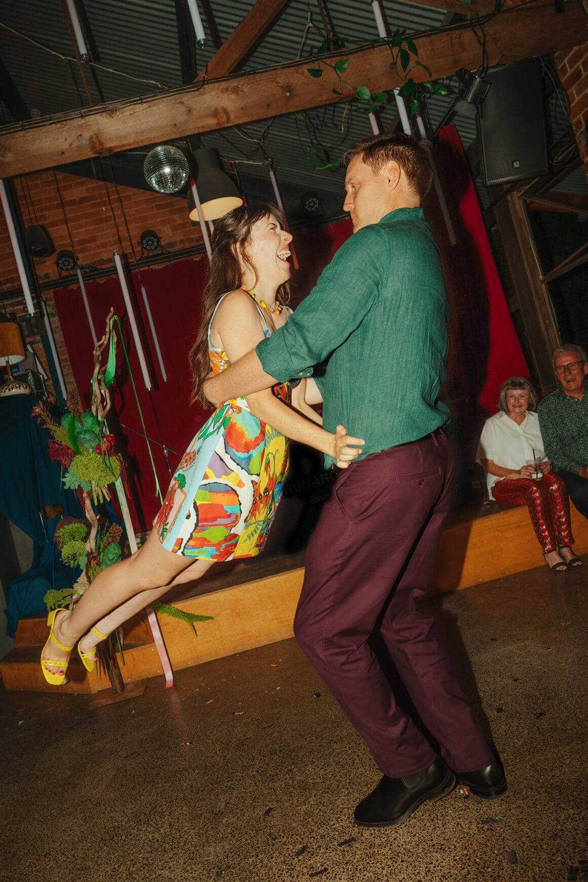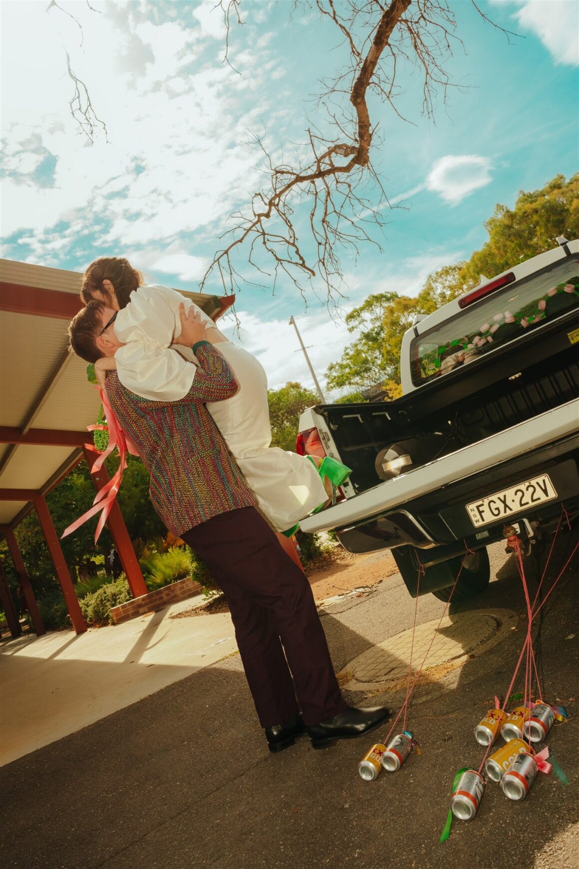(Tom} “My favourite moment was arriving at the ceremony in the back of Chloe’s sister’s ute driven by her Dad. The car had been decked out with ribbons and fresh vegies by Chloe’s Dad and sister. Chloe and I had our first few moments to ourselves to actually look at each other, talk and prepare ourselves for what was to come. As we arrived, all 150ish guests were cheering and smiling, our walking down the aisle song was playing, and I was just overcome with emotion.” (Chloe) “I would have to agree… A close second favourite moment was the choreographed dance by Melissa from Dancensations. We wanted to do a routine that was a little different – think Napoleon Dynamite or Muriel’s Wedding but with a couple of lifts and spins and some confetti for dramatic effect. The guests LOVED it, we really surprised them with something a bit unexpected there, and it felt like such a thrill to be our complete and silly selves and go into the dancefloor with a bang.”