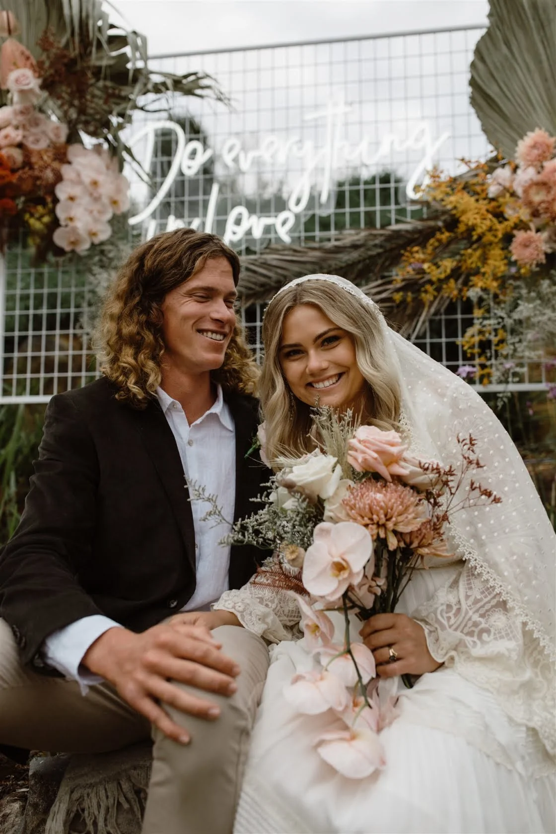 FAVOURITE DETAILS “Our centrepiece neon-sign with dried palms and florals that read ‘Do everything in love’. That was essentially the theme of our wedding and what we want to take from it going forwards. We had photos here, shared our first dance in front of it, and later it turned into our disco centrepiece.”