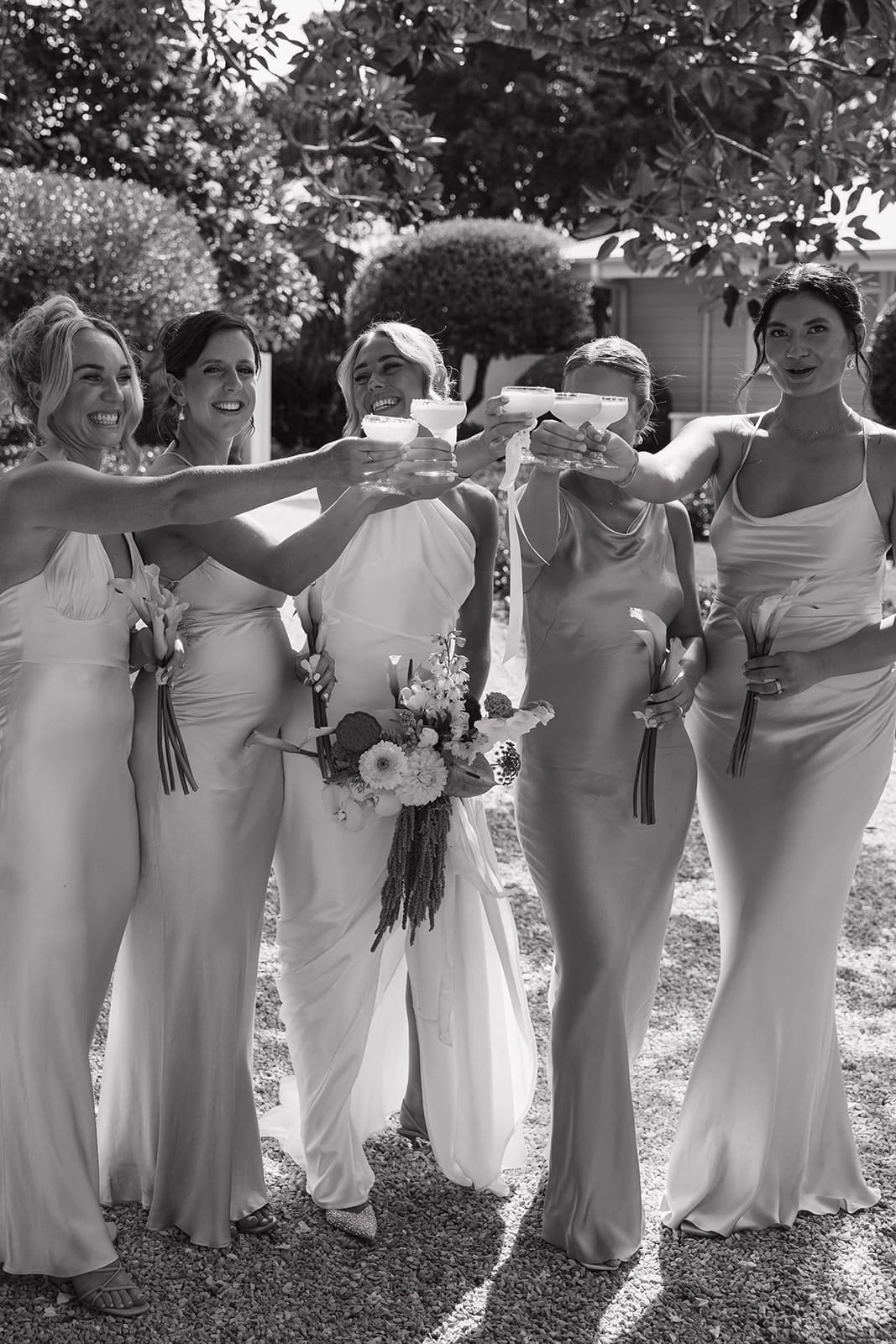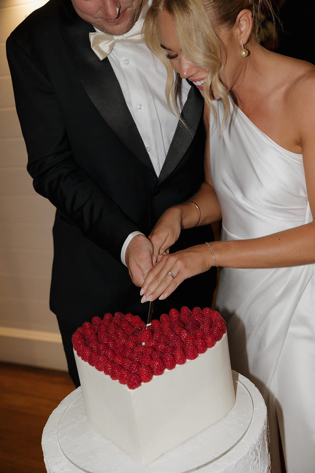 FAVE DETAILS “Some of our favourite details from the day were the florals. When the bouquets arrived in the bridal suite, I was blown away. The brief I gave was spot on – architectural and organic in shape with different floral textures in white and greens. It was a work of art, and the simplicity of the calla lilies for the bridesmaids was a match made in heaven. Another stunning detail was the cake, heart-shaped and topped with vibrant red raspberries, the white chocolate and vanilla bean ganache cake filled with white chocolate cheesecake and raspberry gelée. Katrina from CakeHouse has been baking delicious cakes for my birthday for over 10 years; it was a must that one of her iconic cakes was our wedding cake.”