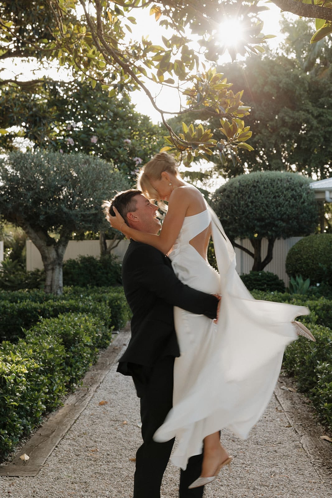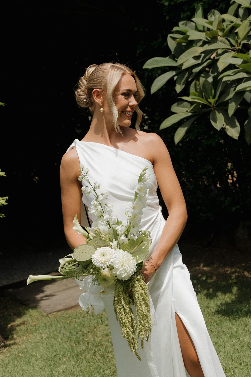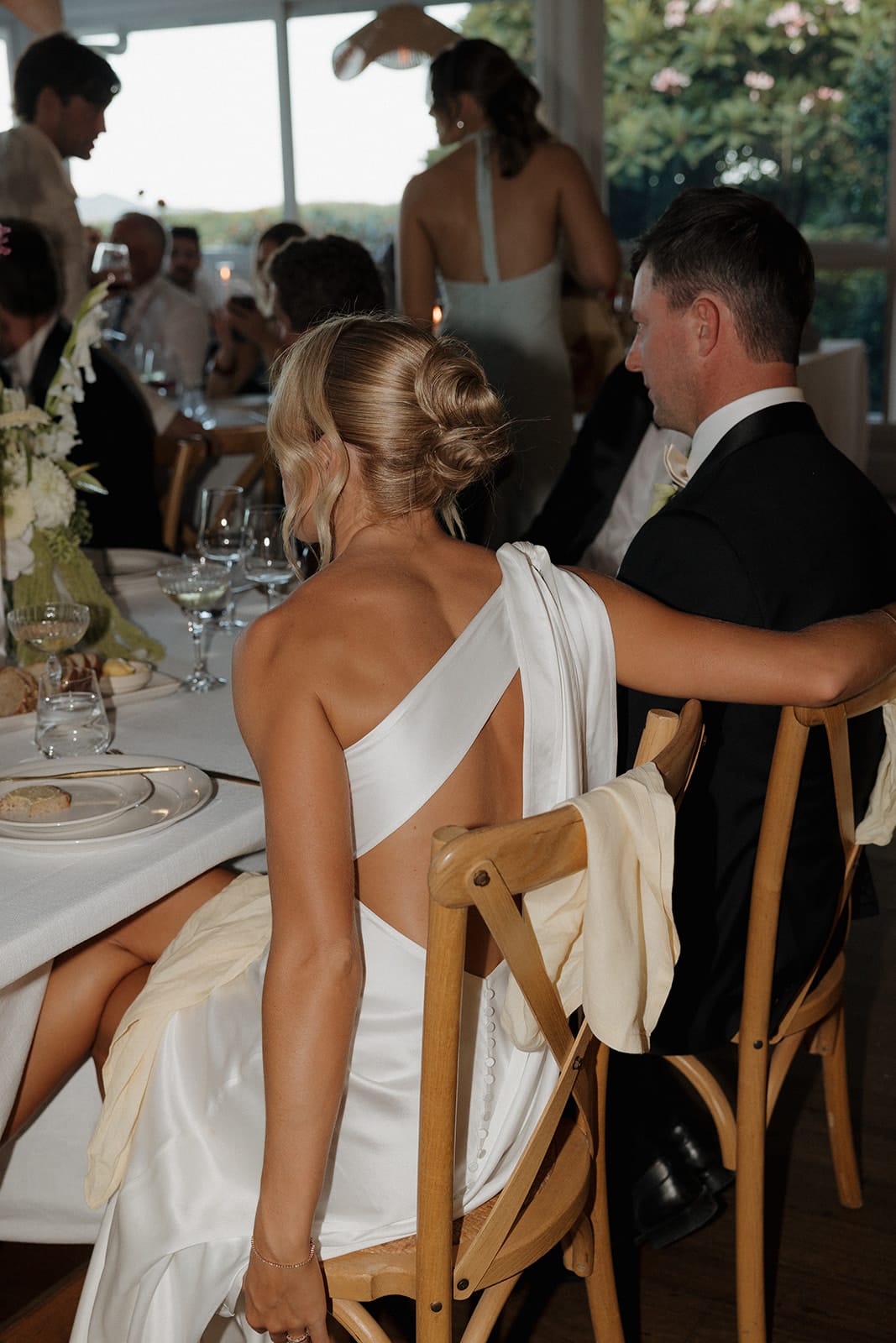 THE DRESS “My wedding dress was from Grace Loves Lace. I tried on two other dresses before finding the dress of my dreams. ‘Aire’ is a double-layered satin Grecian goddess-inspired dress with draping, button details that highlight the curve of the back, an architectural cut out and a side split to elongate the leg. It was the dress I knew I could dance all night in. When I saw Aire online, I knew I HAD to try on this dress. Mum and my sister-in-law came with me for the dress fitting, with a champagne in hand and fitting like a glove, I walked out in Aire and their smiles couldn’t be contained (neither could mine), Mum had tears in her eyes, it is a special memory etched in my brain. The experience was so positive. The Grace Loves Lace showroom was buzzing, and other brides commented on how beautiful I looked in the dress.”
