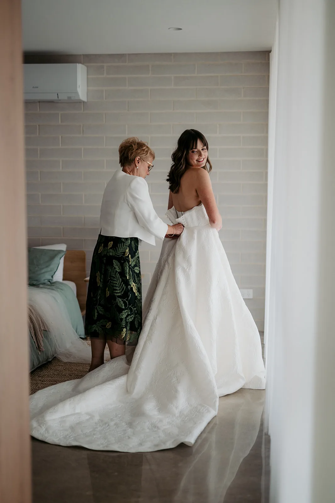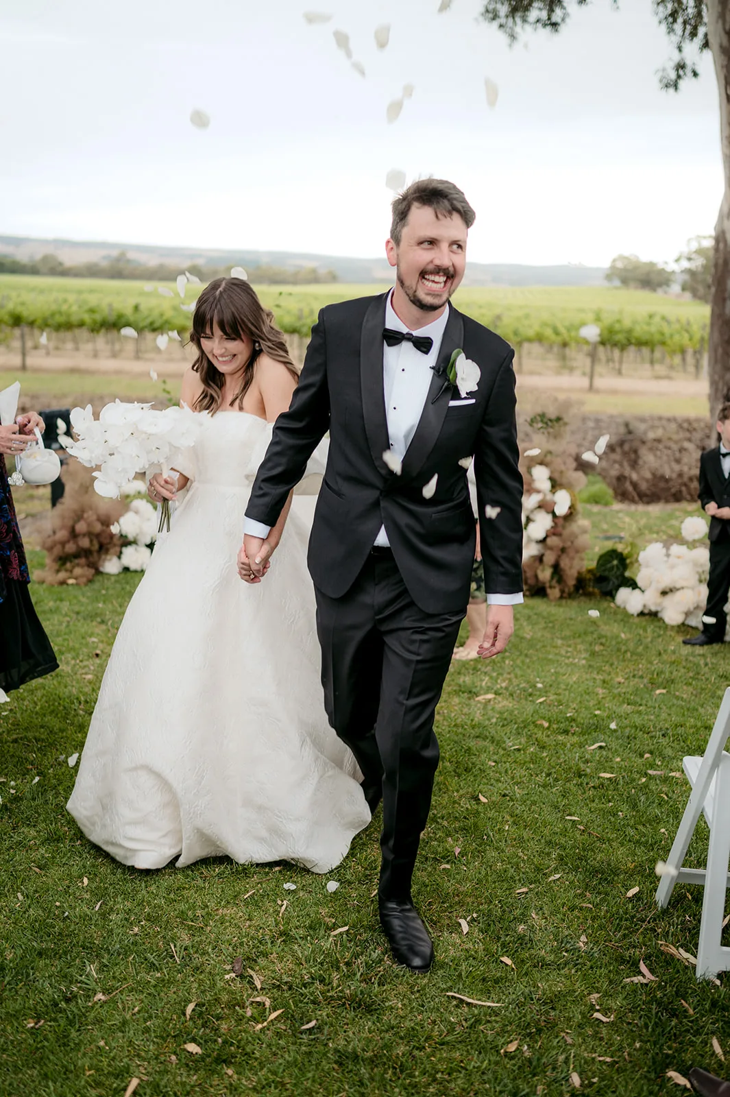 CONTRIBUTING VENDORS Photographer Evan Bailey Cinematographer I Do Cinema Florist Studio Botanic Stationery Emma Kate Co. Printer Kwik Kopy Venue Mitolo Wines Event/Venue Support Jenna Burgess – Mitolo Wines Getting Ready Reef House, Aldinga Beach Other Desserts Wendy Ashwin (Family) Hire Items Honoured Hire Candles Btncl Entertainment Los Leo (Tom Montesi), Baker Boys Band Celebrant Emma Webster – Celebrantulations Rings Everett Brookes Transport Kanga THE BRIDE Bridal Gown Designer Sassi Holford Bridal Boutique Bluebell Bridal Veil Dreamtime Designs Getting Ready Homebodii via David Jones, Piyama Shoes Loeffler Randall via David Jones Accessories Dove Grey Bridal via Bluebell Bridal, Loeffler Randall via David Jones Hair Amy Smith – The Chapel Makeup Amy Barton Fragrance Van Cleef & Arpels via David Jones Bridesmaid Dresses Billy J, Aje, Shona Joy, Mossman Bridesmaid Shoes Billini Bridesmaid Gifts Country Road, Go-To, Pure Elements via Myer THE GROOM Suit & Tie Jenny & Gerry’s Cufflinks ThimblesnObjectDart via Etsy Socks Max Milan Shoes R.M. Williams Grooming Havachat Barbershop Groomsmen Suits Jenny & Gerry’s Groomsmen Gifts R.M. Williams, ThimblesnObjectDart via Etsy, Max Milan