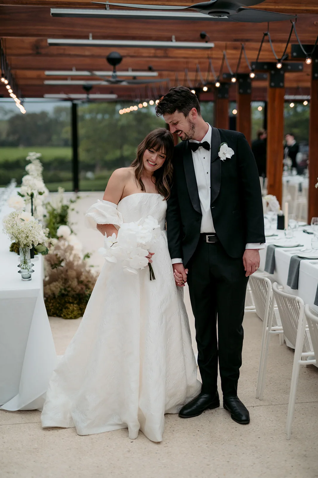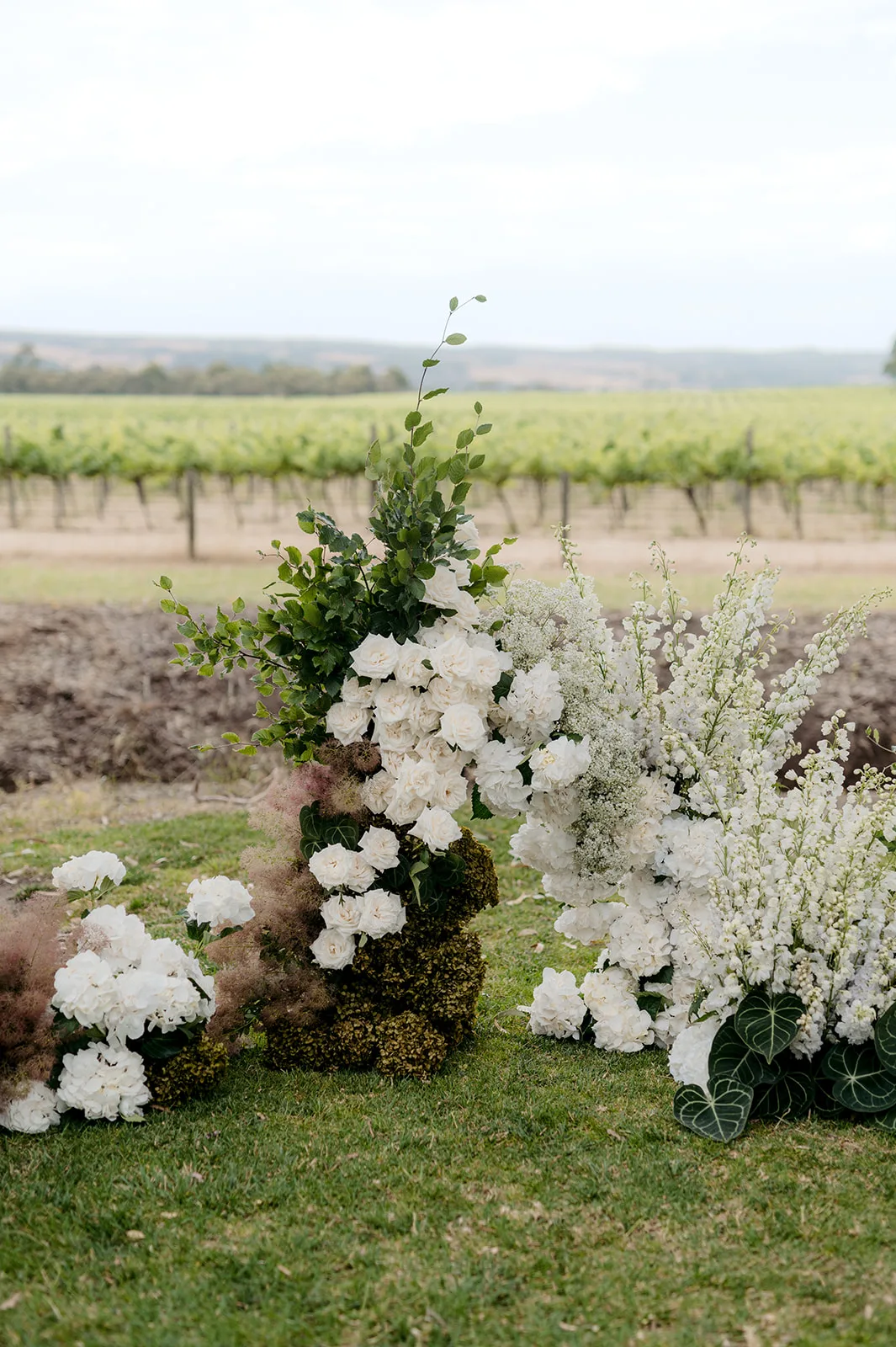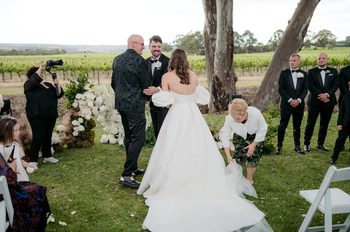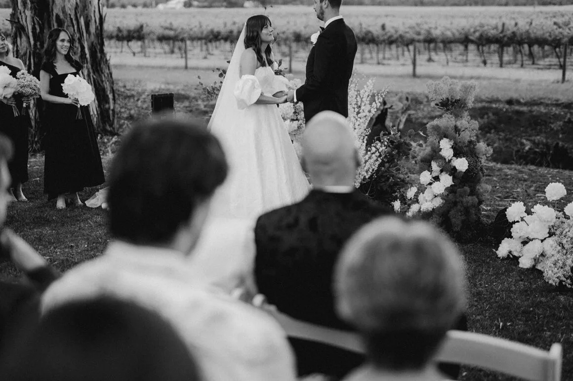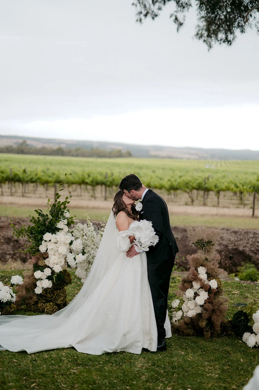 “Mitolo Wines was exactly the style of venue I wanted,” shares the bride, who wore a Sassi Holford gown paired with stunning Dove Grey Bridal earrings. “The backdrop of the vineyards, hills, and ocean in the distance that I’d grown up with as ‘home.’”