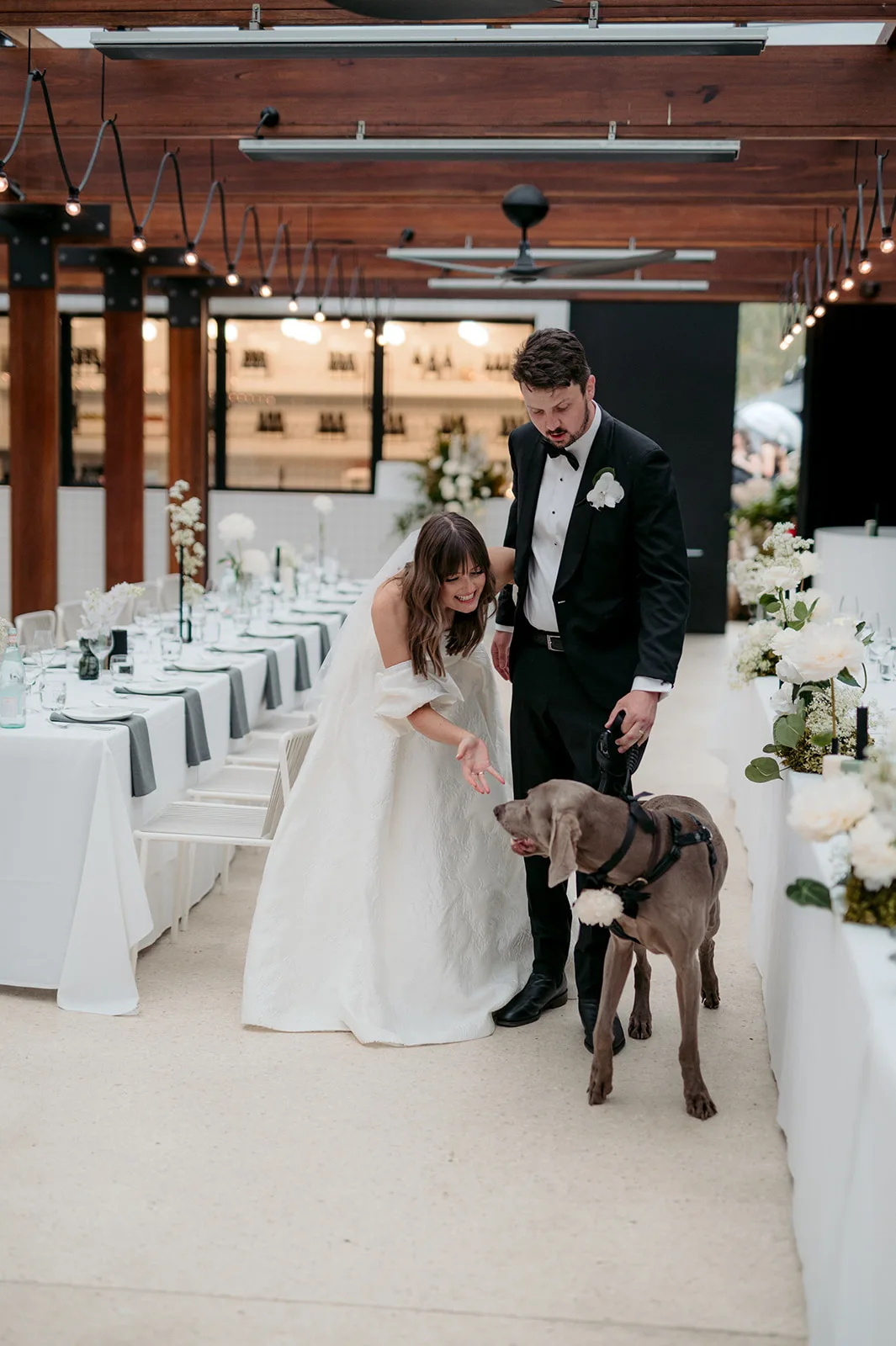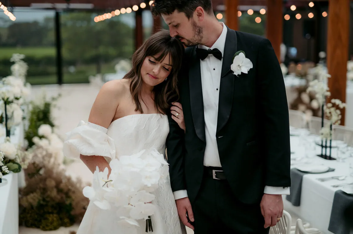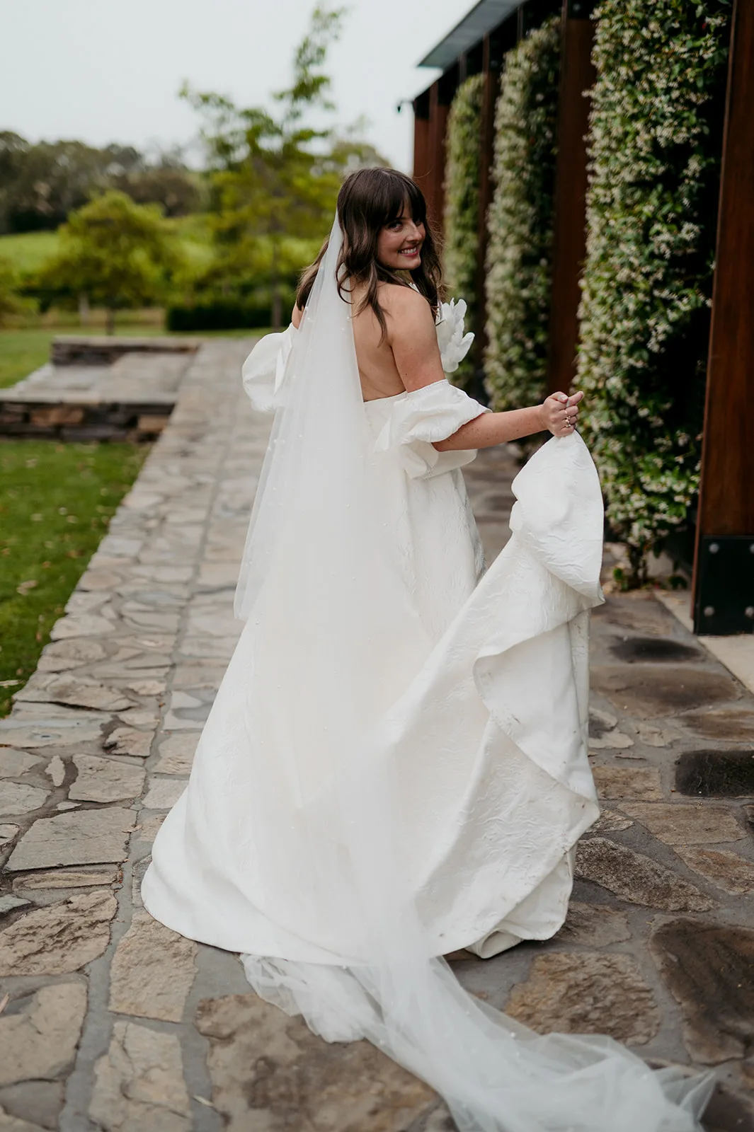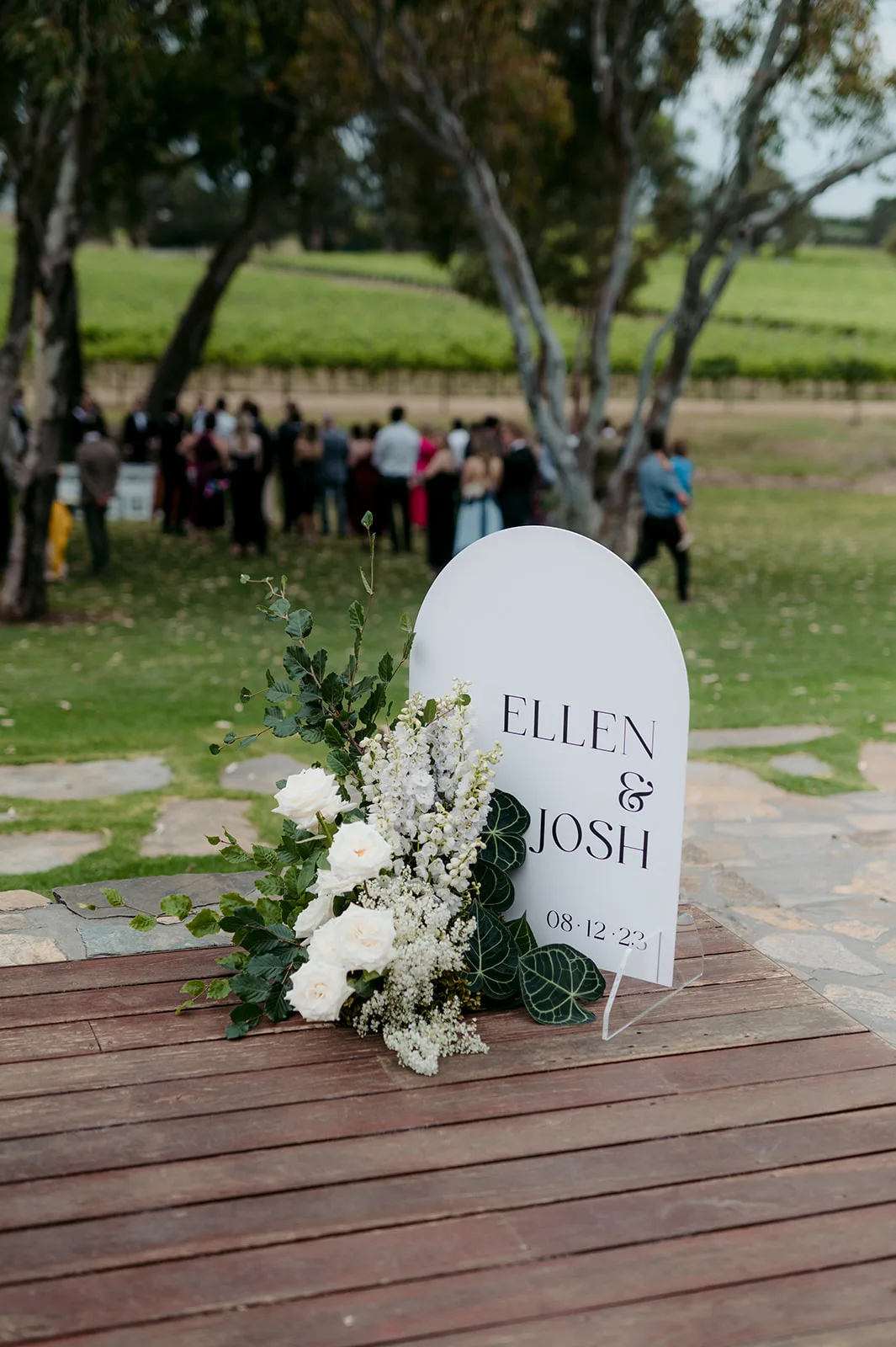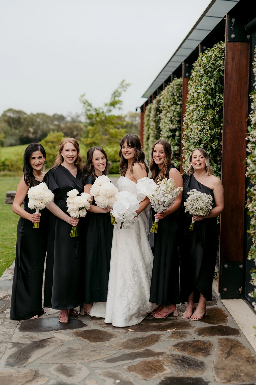 “Mitolo Wines was exactly the style of venue I wanted,” shares the bride, who wore a Sassi Holford gown paired with stunning Dove Grey Bridal earrings. “The backdrop of the vineyards, hills, and ocean in the distance that I’d grown up with as ‘home.’”