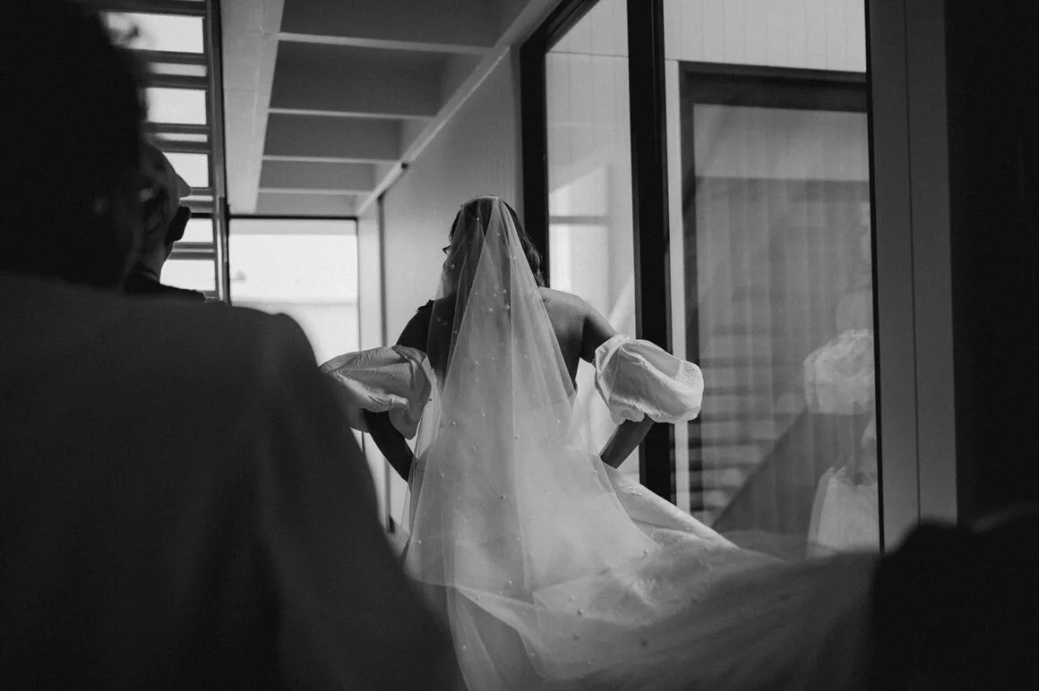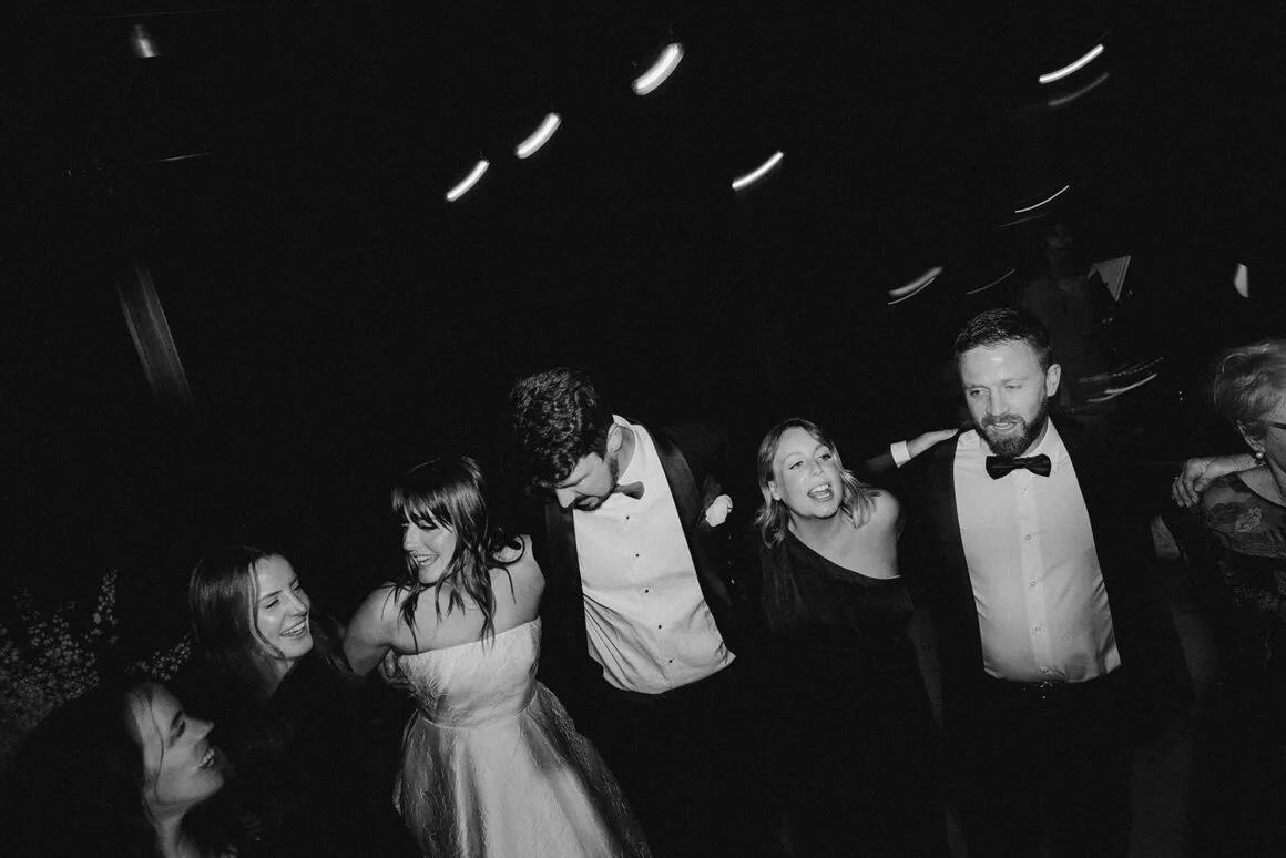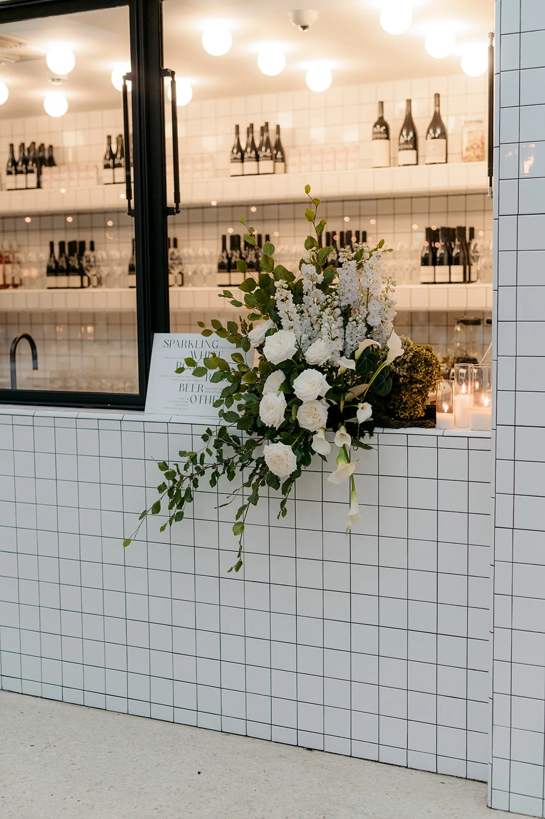 THE VIBE “I really wanted the style to be classic, old-Hollywood style. I always envisaged Sinatra, a brass band, whites, blacks, bow ties, glamour, twinkly lights, and bushy white and green florals. This kind of style has always made me smile, and my mum and I have always listened to old music together – Sinatra and Tony Bennett, Stevie Wonder, Etta James and Louis Armstrong. This kind of music and classic vibe really inspired the day.