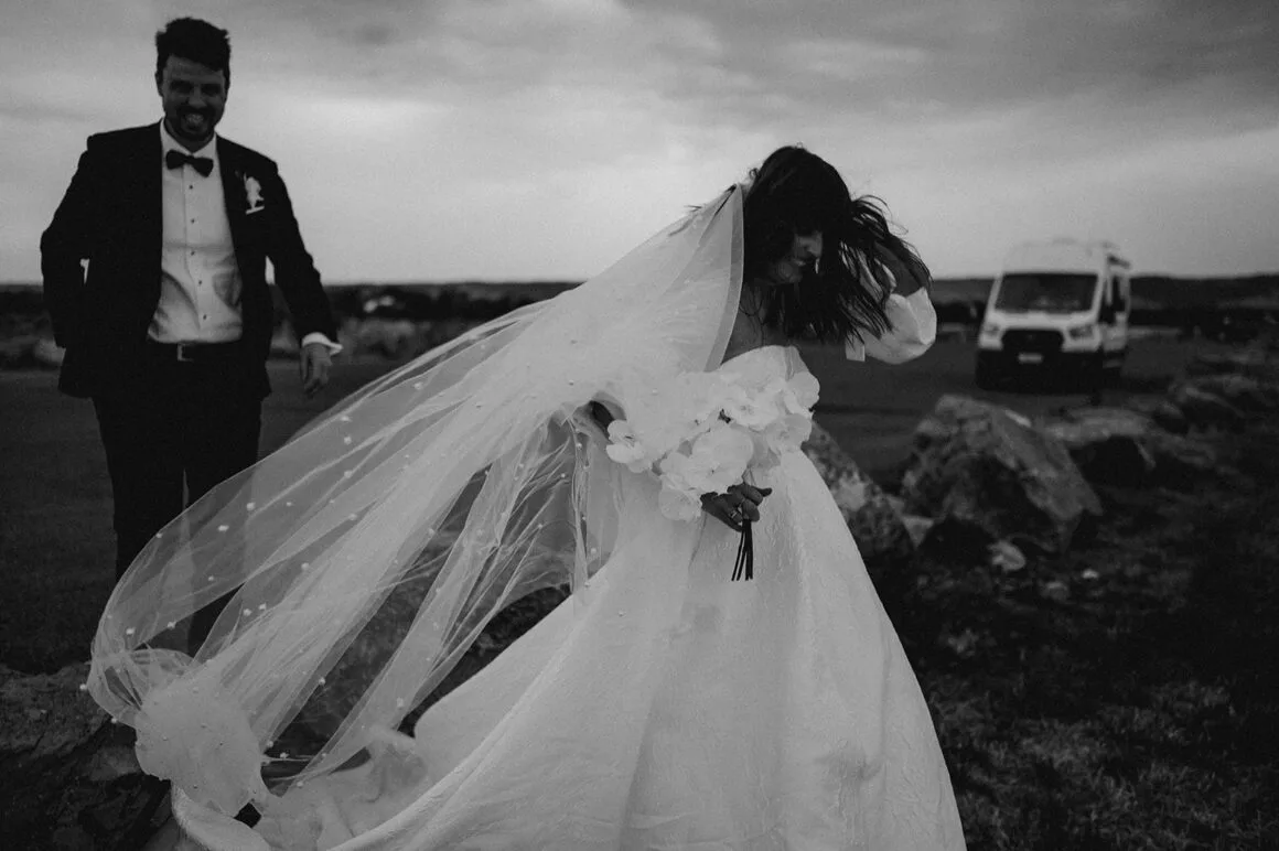 MEMORABLE MOMENT “I have always dreamt of getting photos at Port Willunga beach, where we got ready and just 10 minutes from our venue. Our photographer (Evan Bailey) was an absolute champ and drove us there in our old, beaten-up manual Defender, through stormy weather, road closures, and roadworks, only to find it pouring by the time we got there. He was such a delight in the car and kept our spirits up. We had a good half-hour round trip sharing stories of marriage, togetherness, his wife and family, and reflecting on how this is a mere moment and a mere photo. We had the best time. We did manage a few epic photos too, thanks to Evan’s magic photographic touch.”