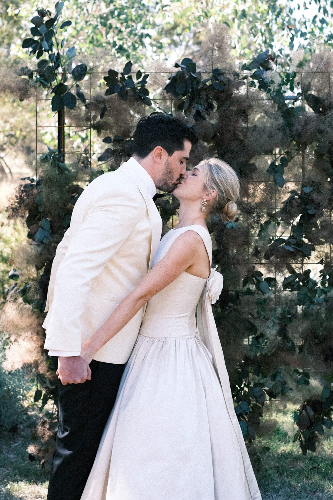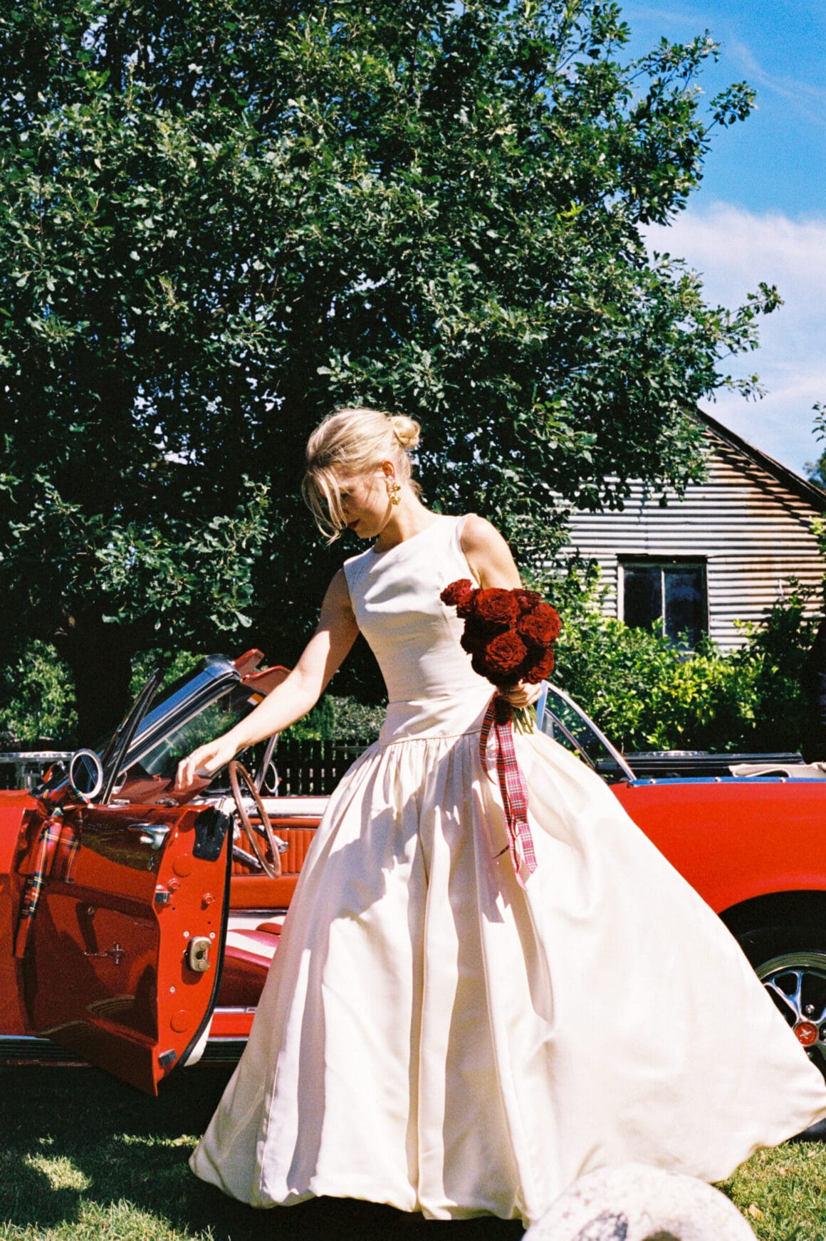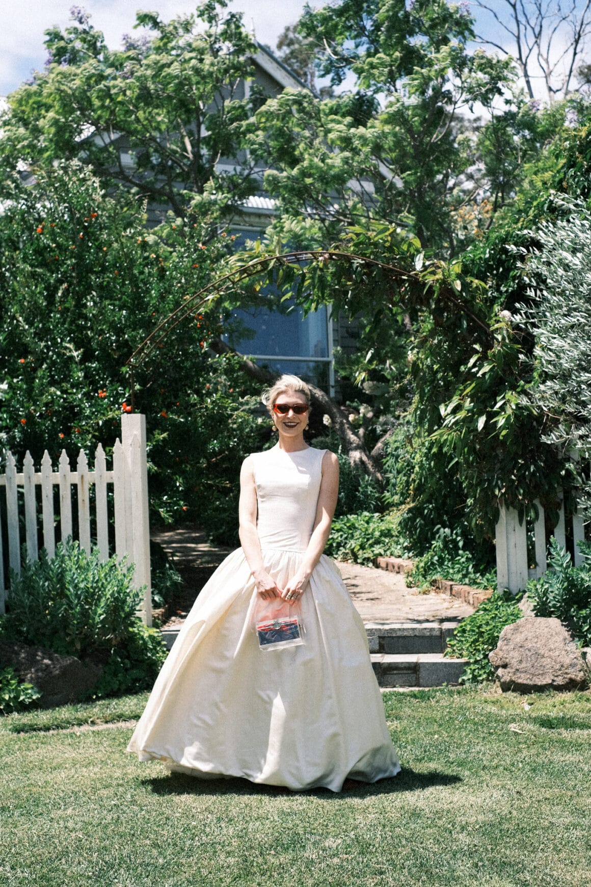 THE DRESS “I was set on a vintage dress from the start. So I was beyond excited when, with the wedding fast approaching, Art Garments, a Sydney-based vintage and secondhand seller, announced an online bridal drop. When I saw ‘The Dress’, a 1990s Amsale gown, I was obsessed with its unusual proportions – the tea-length, drop waist and high neck. However, I had to be talked into the purchase by a few different people. What if it didn’t fit, or was too shiny? I ultimately bit the bullet and clicked ‘pay now’, with the seller subsequently informing me she’d had multiple heartbroken prospective brides. It’s a cliche, but it wasn’t until I tried it on that I began to feel like a bride.”