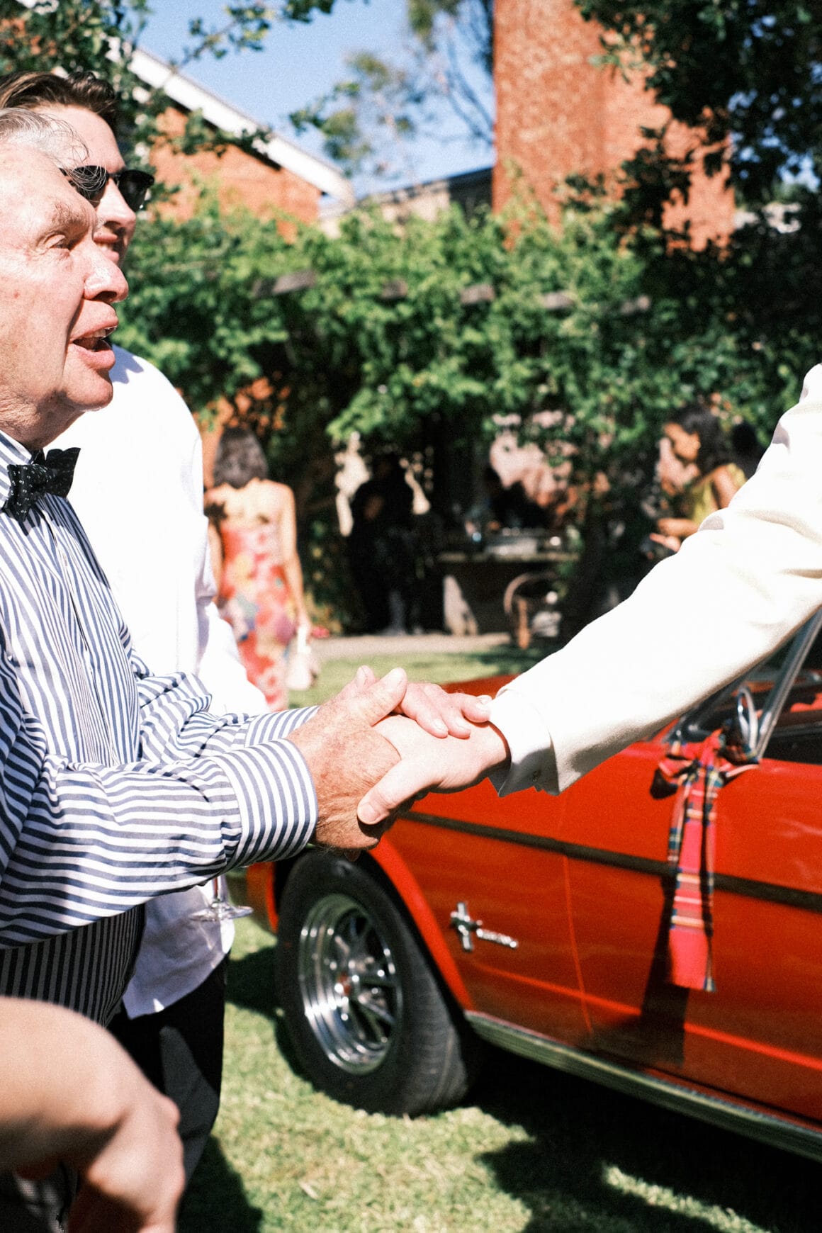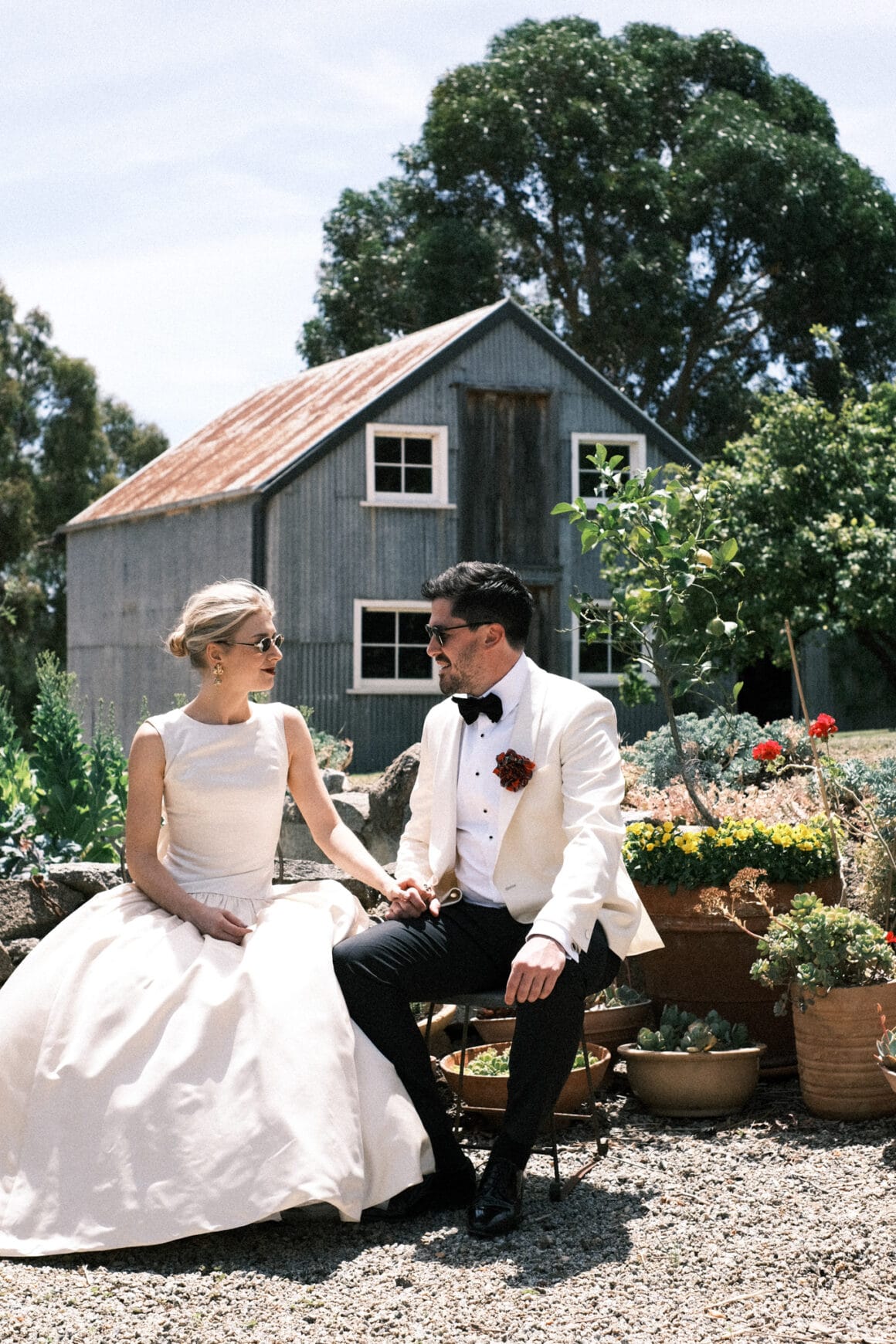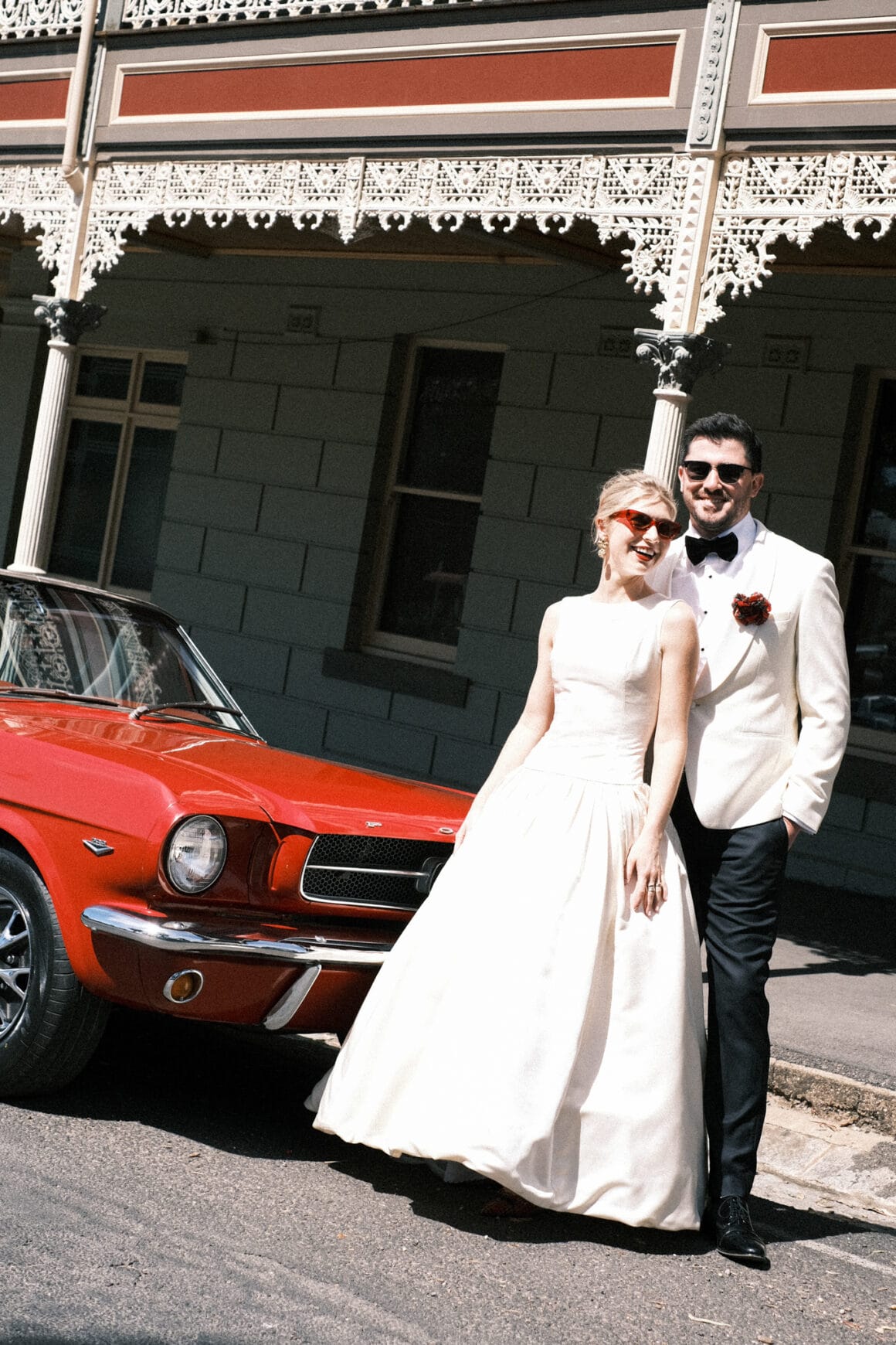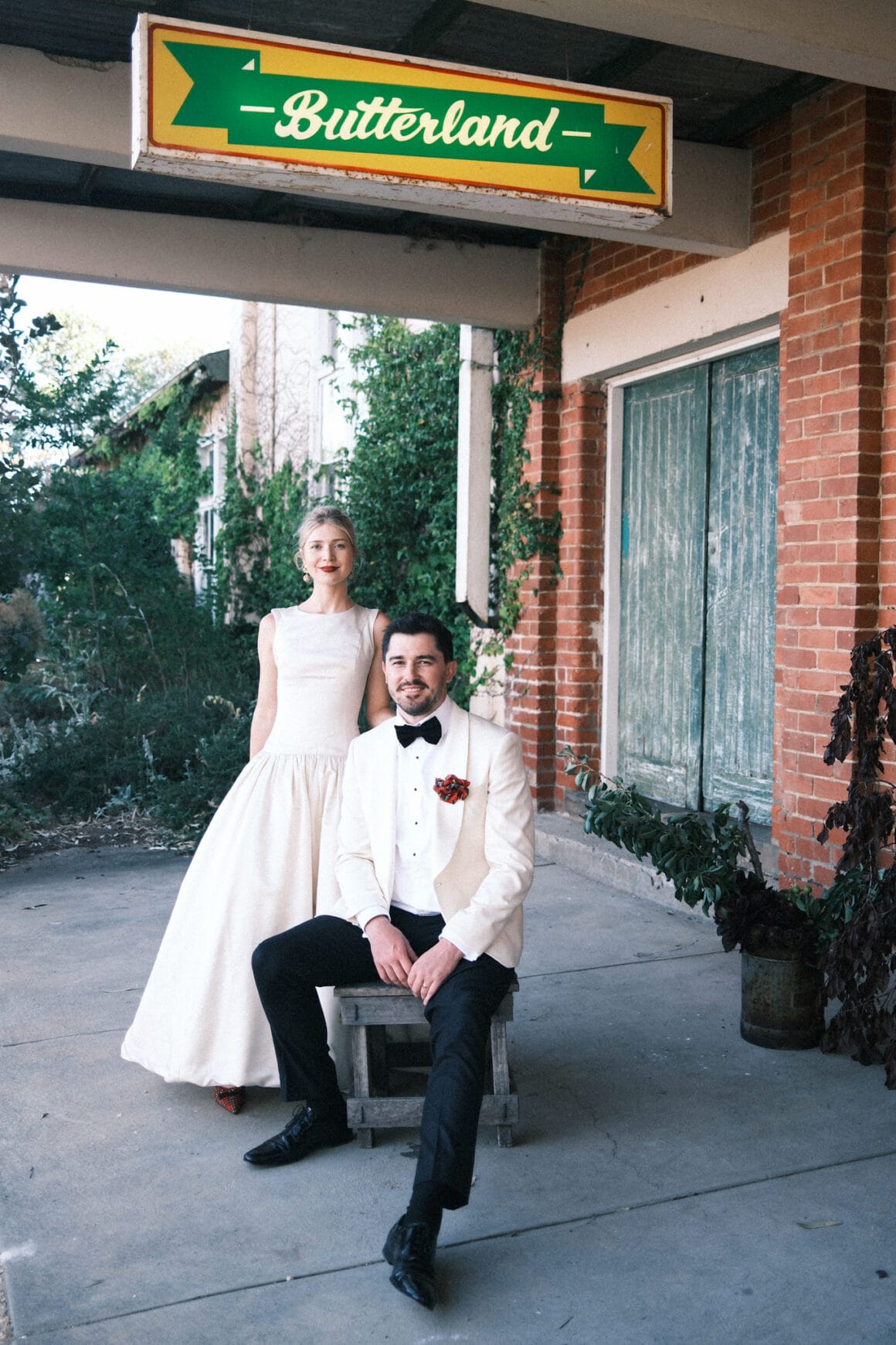 CONTRIBUTING VENDORS Photographer Thomasjpg Stylist Janet Rockes (friend) Florist Lisa Arrowsmith (family), Janet Rockes (friend) Ceremony & Reception Venue Butterland Newstead Catering Emma James Catering Cake Morning Market, Only Cheesecakes Lighting & Sound Hire DJ Warehouse, Entertainment Horns of Leroy, The Knave Celebrant Tamsin Whaley Transport Bendigo Bus Co Car Mustang ‘GINSMG’ (Virginia Walsh, friend) Welcome to Country Djaara Elder Uncle Rick Nelson Cocktails Botanik Bar THE BRIDE Bridal Gown Designer Vintage Amsale Bridal Boutique Art Garments Second Dress Vintage via Etsy Shoes Jeffrey Campbell, Miista Accessories Vintage earrings via Depop Hair & Makeup Gin Castro Hair + Makeup THE GROOM Suit Jacket Calvin Klein via Myer Shirt & Cummerbund Mr Cuff Second Shirt Vintage from Art Garments Pants M.J. Bale Bow Tie Moaning Minnie via Etsy Cufflinks & Shirt Studs Collectors Utopia via Etsy Brooch M&S Schmalberg via Etsy Shoes Julius Marlow via Myer Grooming Another Man Barber, Pear